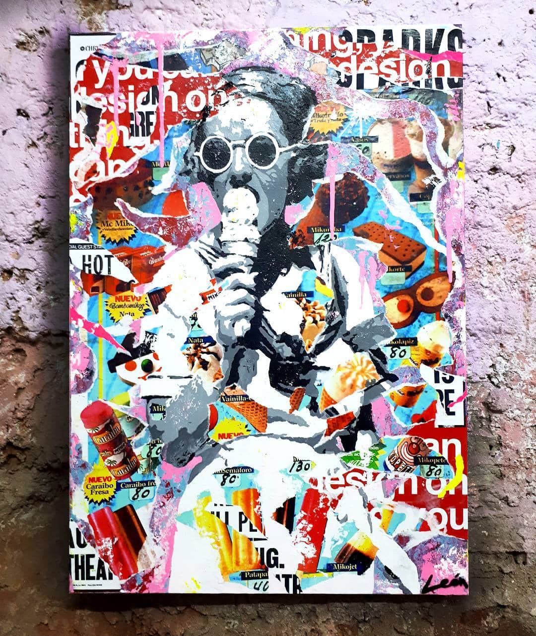 Bette Davis appears with her iconic sunglasses, casually enjoying an ice cream. Behind her, blurred and almost vibrant, an old ice cream parlor sign adds a nostalgic touch to the scene. The color palette plays with tropical and cool tones that convey a summery, fresh, and lively feeling, mixing Davis’s classic elegance with a fun and relaxed touch.