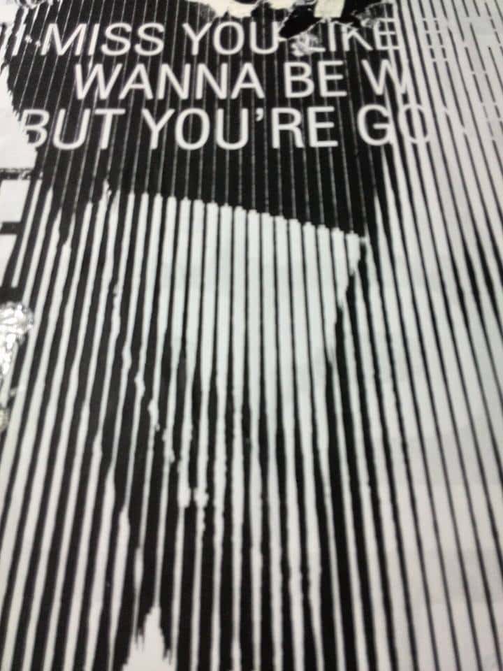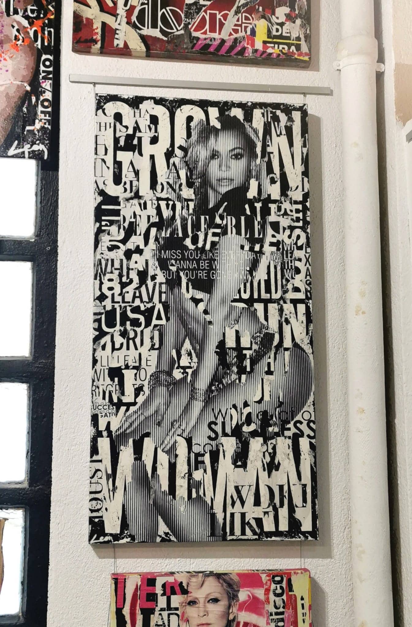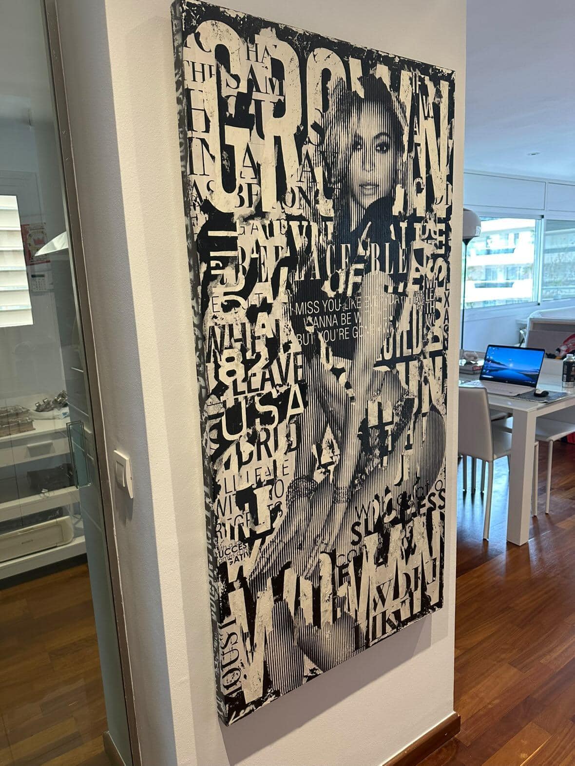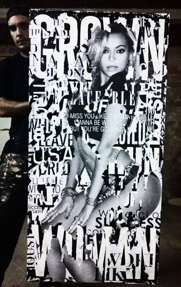 In this vertical canvas, Alberto León presents Beyoncé in black and white, exploring a new form of representation through a linear screen effect: a silhouette that is revealed clearly only when viewed from a distance, forcing the viewer to adjust their gaze. The technique, true to León’s style with paint and collage on a background of torn posters, allows him to deconstruct and reconstruct the figure without losing its iconic power.