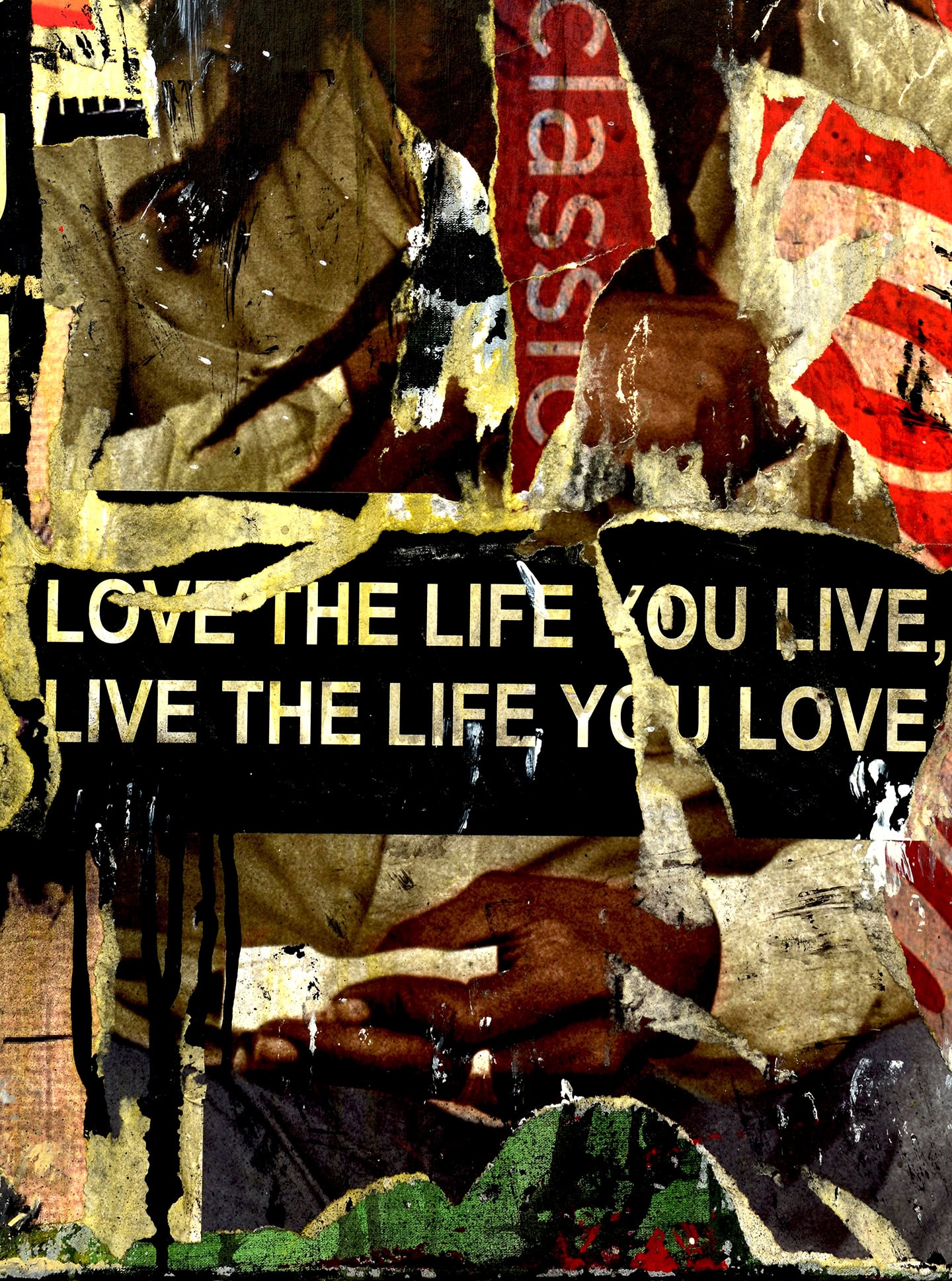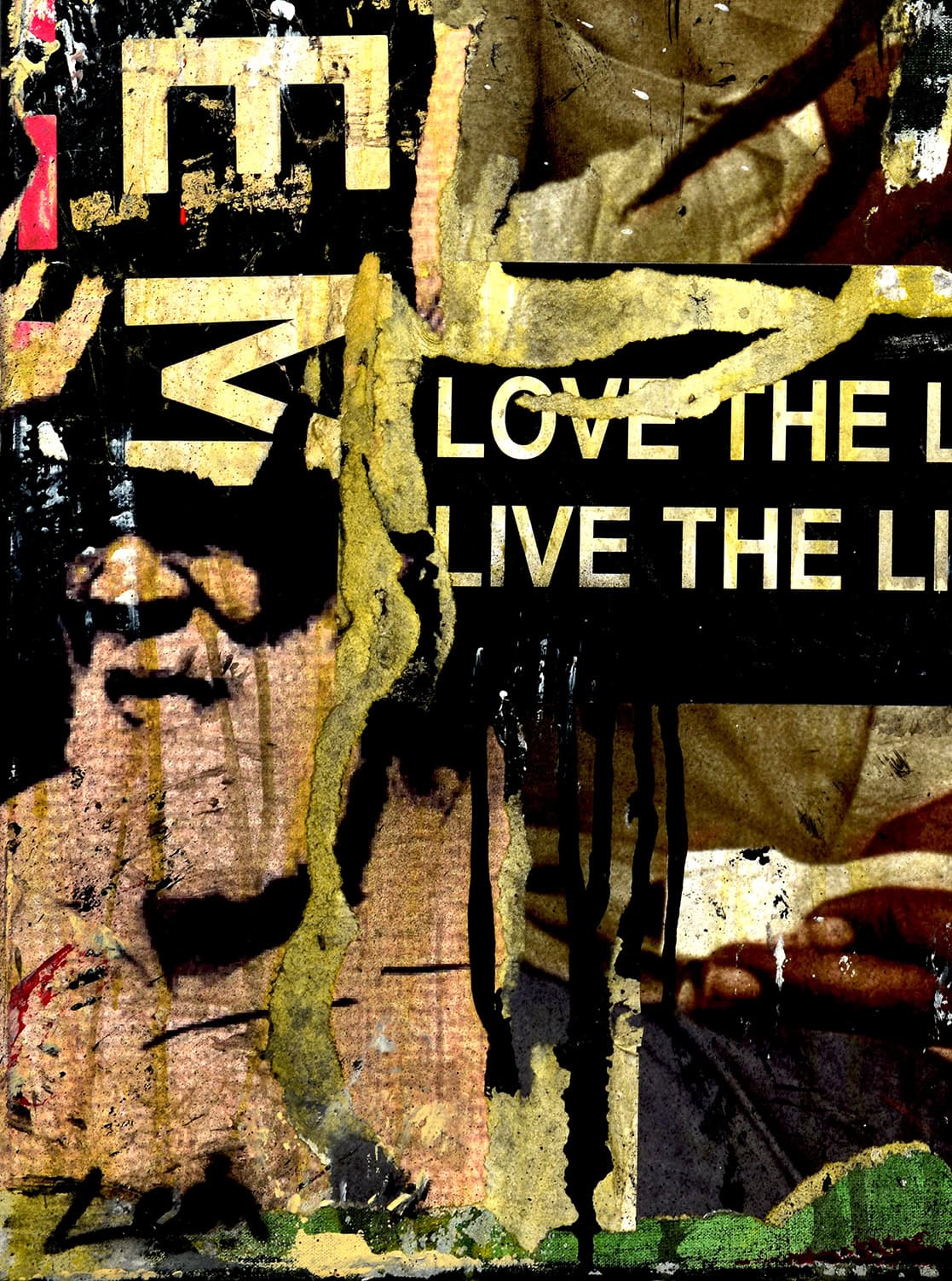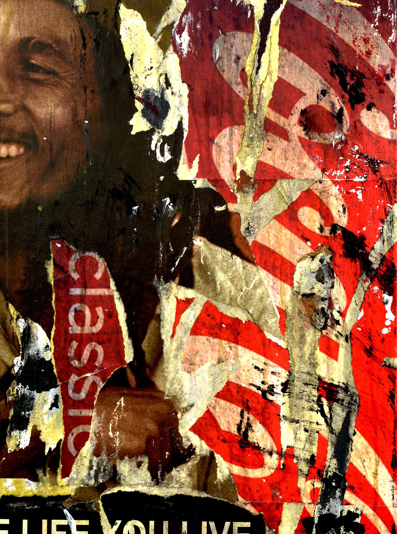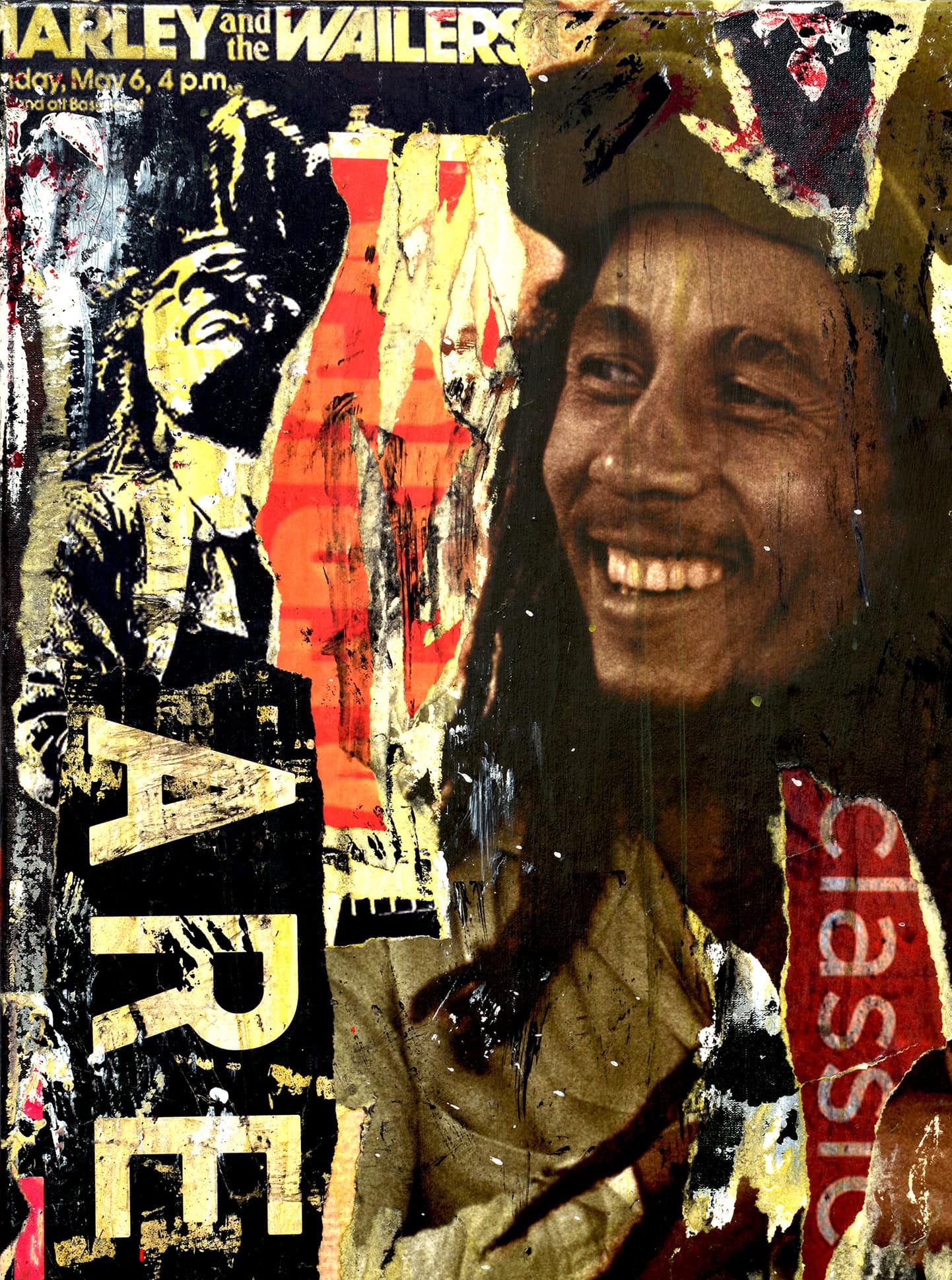 In this 60 x 80 cm canvas, Alberto León merges popular iconography and cultural memory through his usual technique of torn posters and urban collage. In the center, an old poster of Bob Marley smiling is integrated into the composition as if it were part of a wall worn by time.