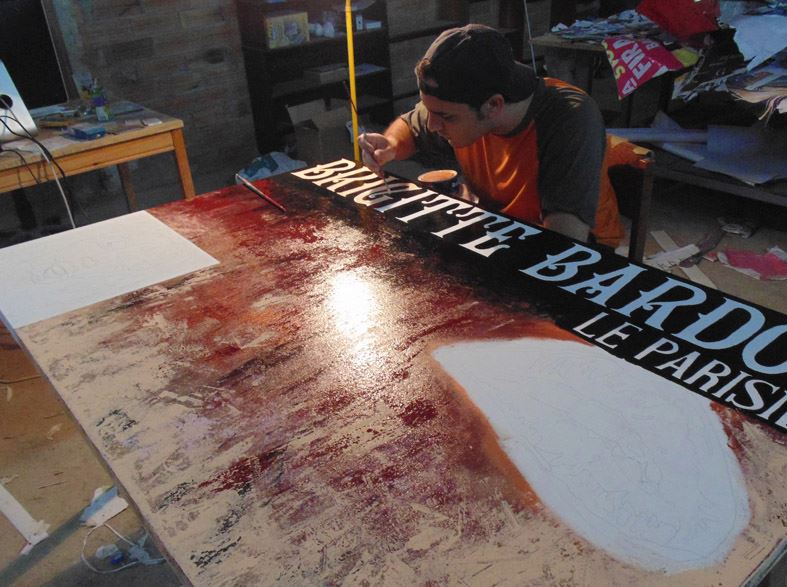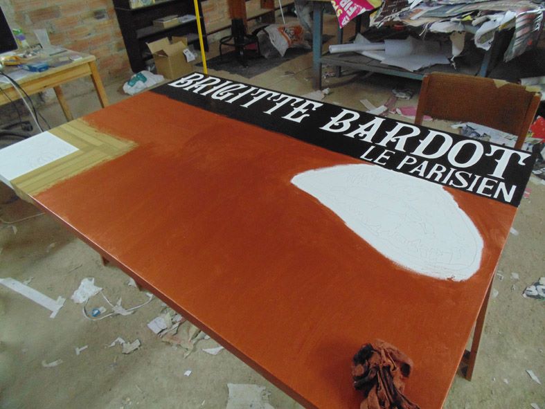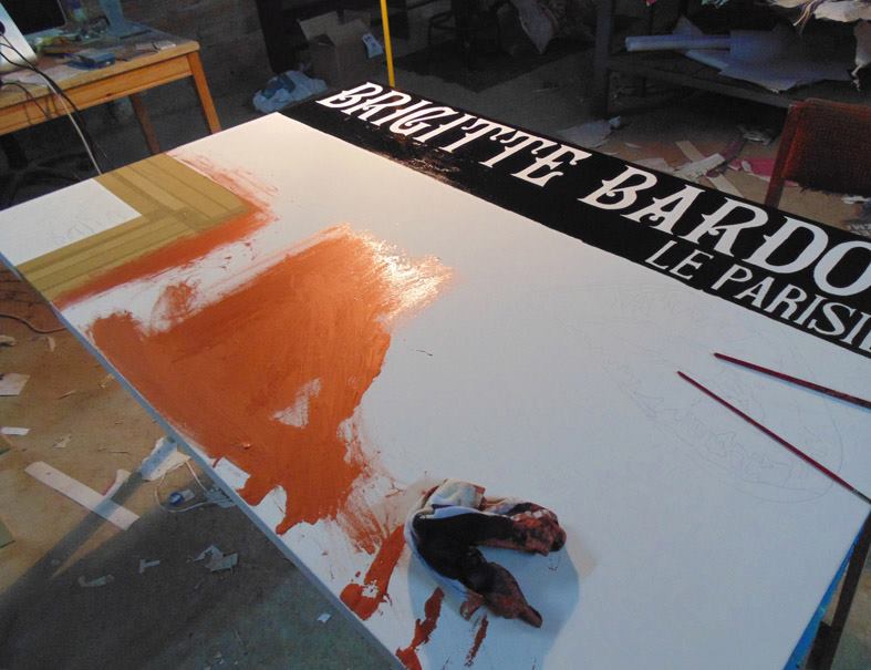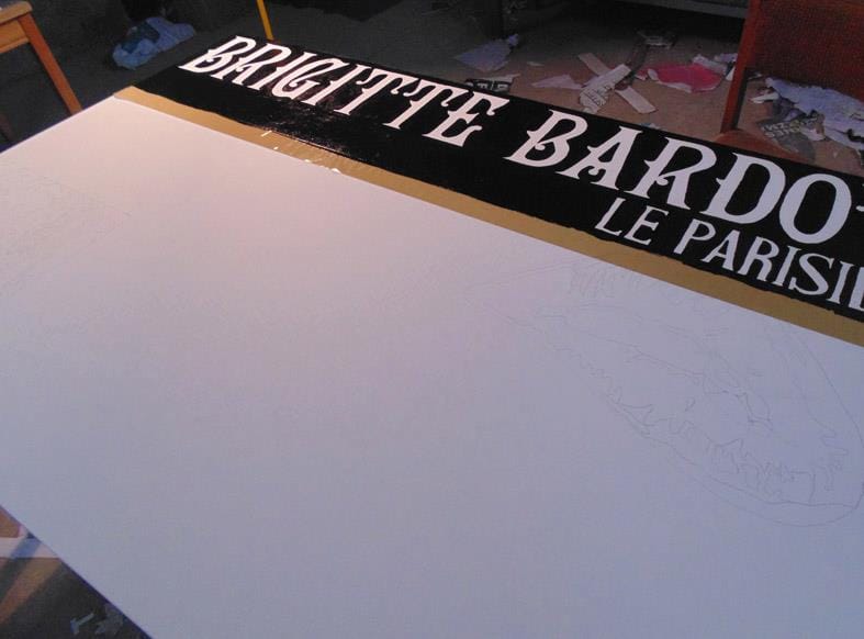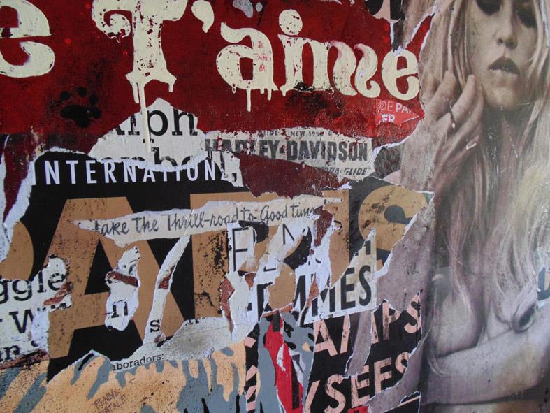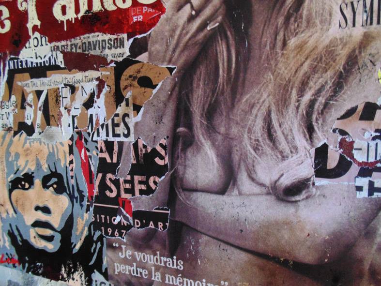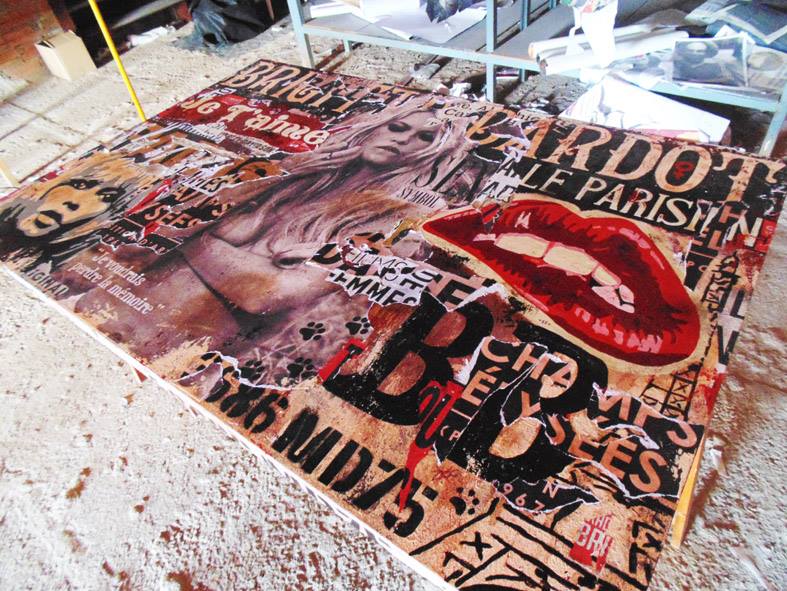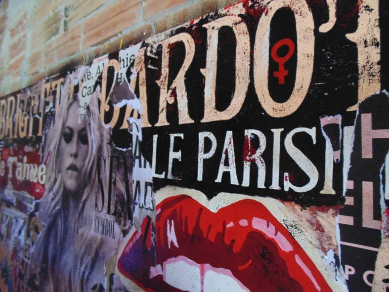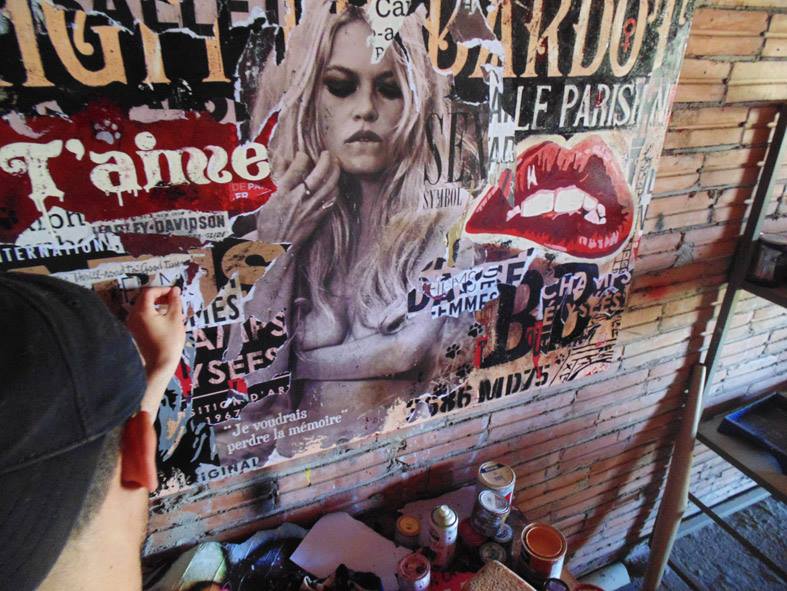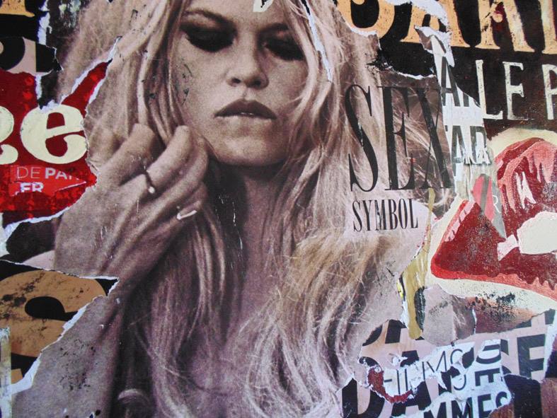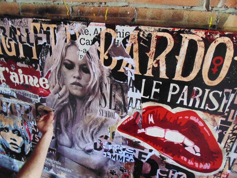 The background, constructed with urban collage and fragments of visual memory, provides texture and depth. In the lower left corner, a stencil of her face appears as an iconic shadow that persists over time. To the right, the initials BB close the composition like a personal signature that evokes her myth, but also the real woman behind the symbol. The work doesn’t shout, but it leaves a mark.