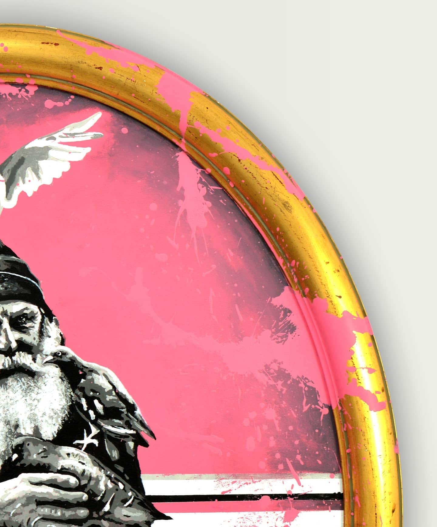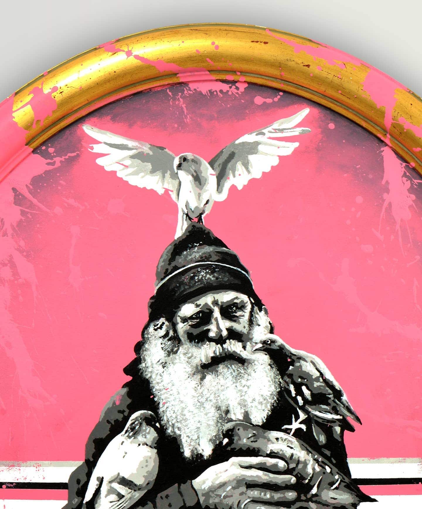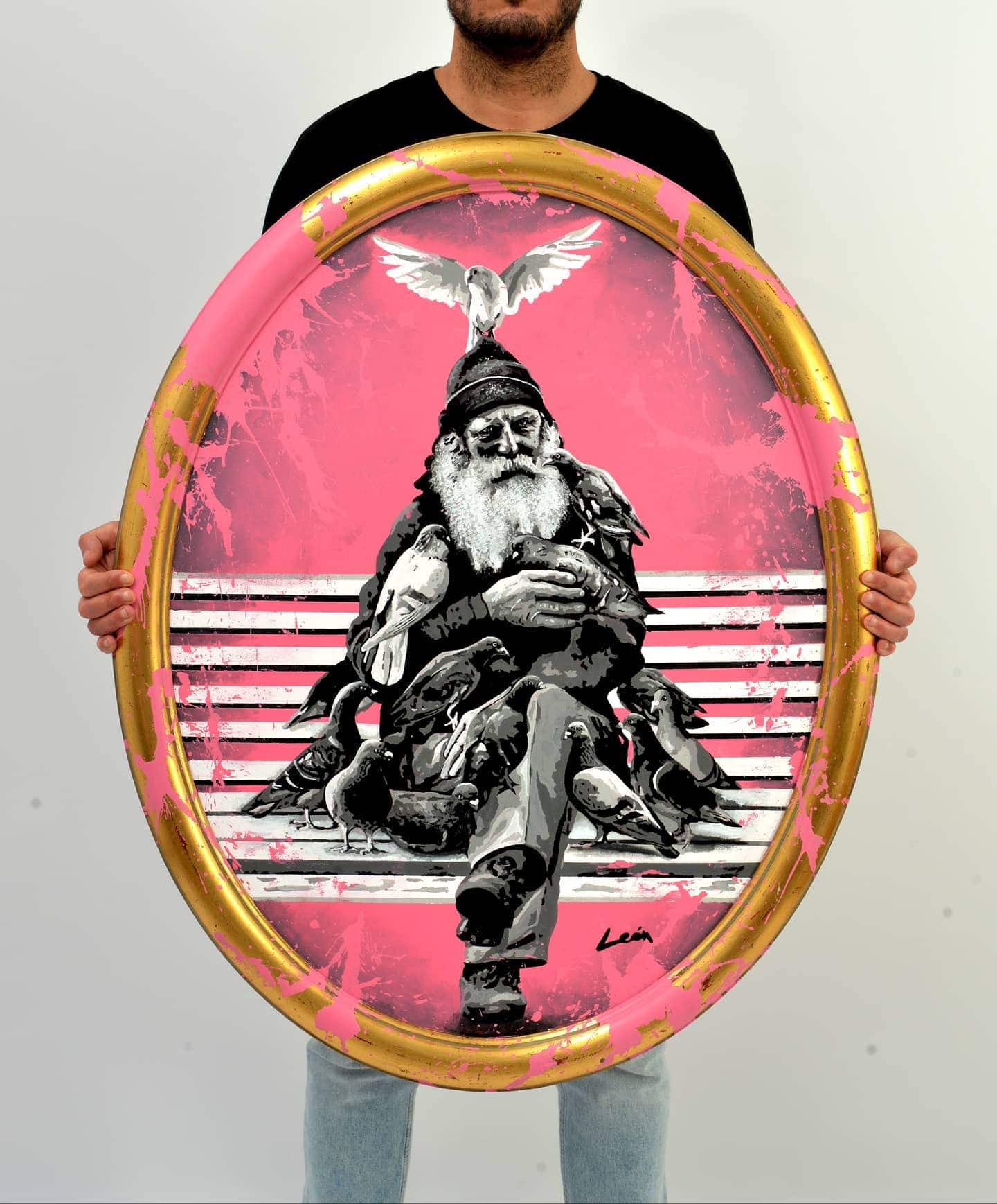 A homeless man sits in silence, covered by pigeons that, as they land on him, draw the shape of a Christmas tree. At the top, a white pigeon acts as a star. The image evokes the true Christmas spirit: peace, hope, and dignity even in solitude and oblivion.