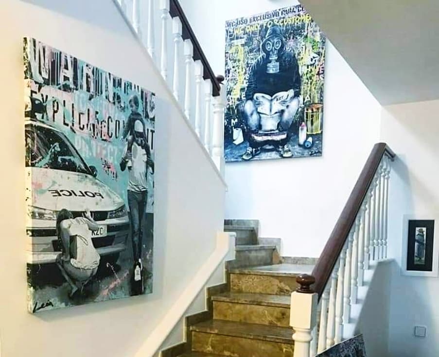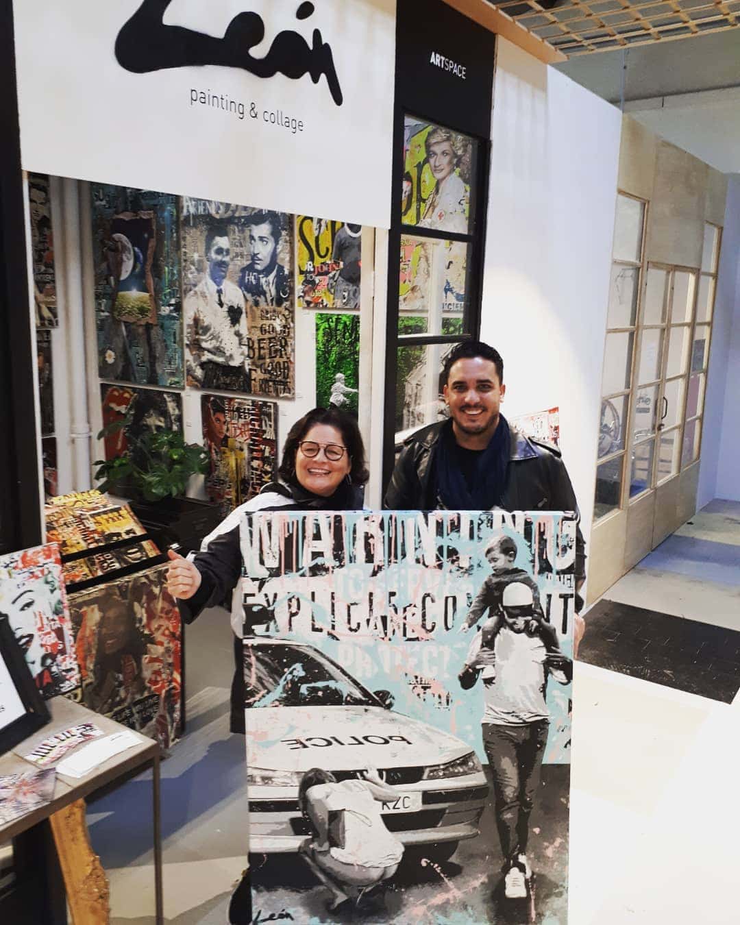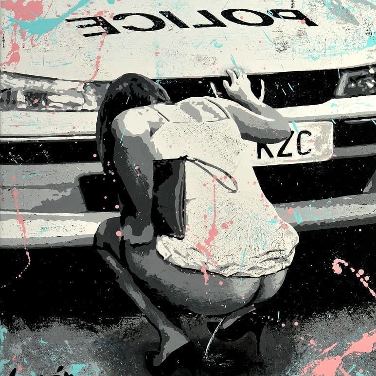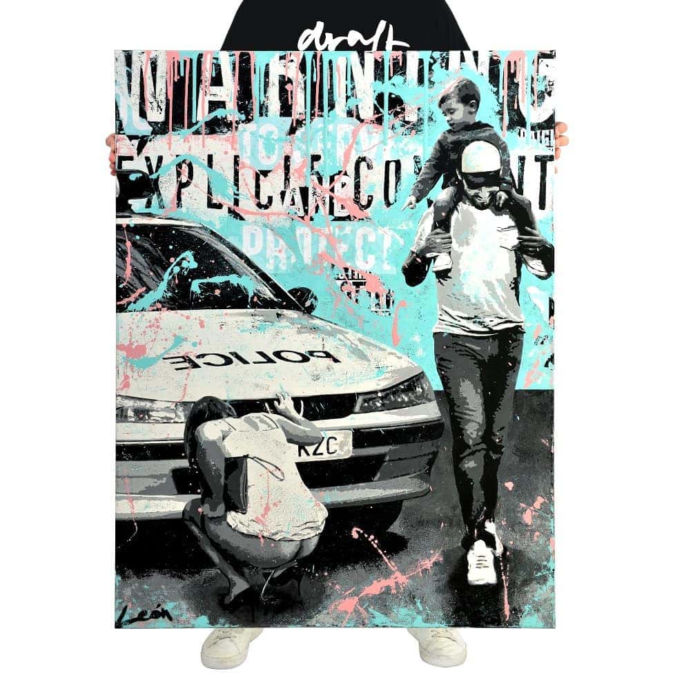 Emergency portrays a moment full of spontaneity and mischief in the middle of a family outing. A father carries his son on his shoulders, while the child points playfully at a woman who, brazenly and without hiding, is urinating next to a police car. This unexpected prank breaks the urban routine and awakens the child’s innocent curiosity.