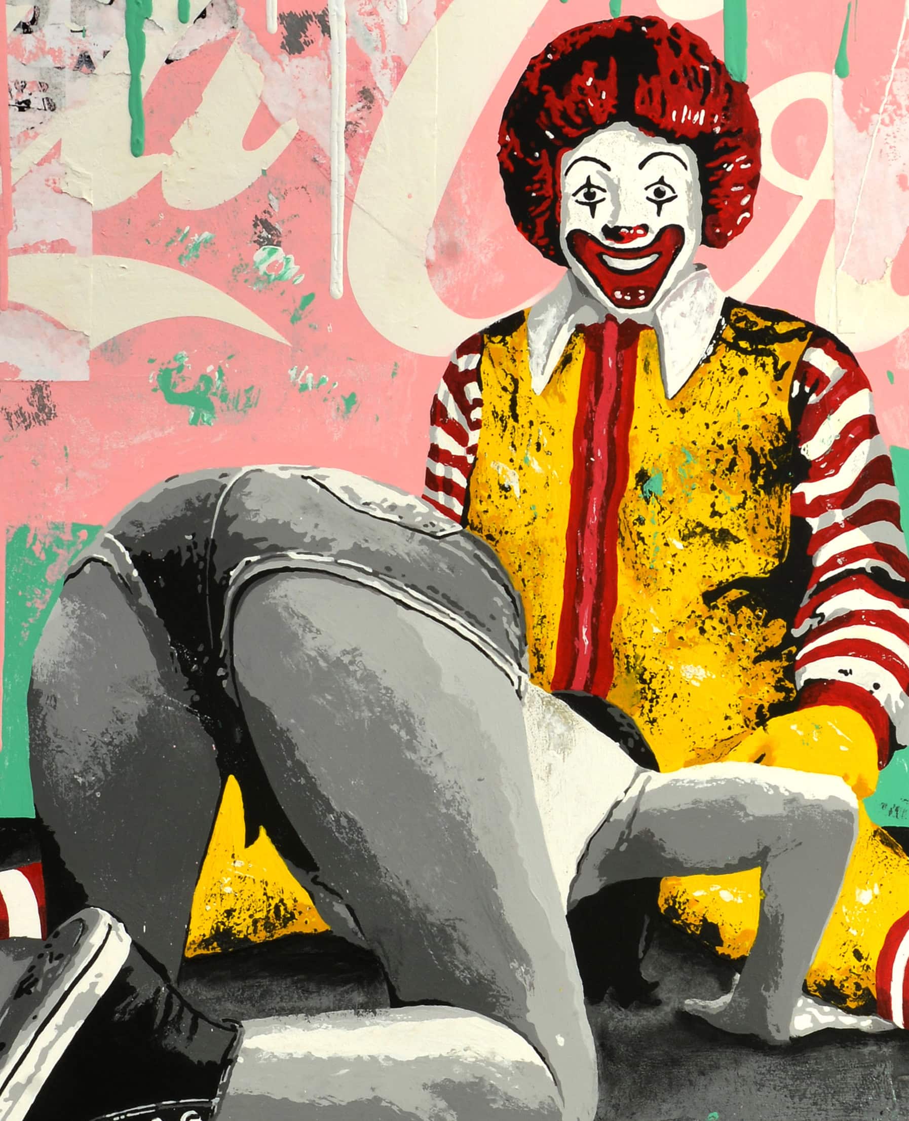 Fake Vegan uses irony and humor to question what we sometimes hide behind appearances. In the scene, a woman on her knees is engaged in an explicit act with Ronald McDonald, who smiles nonchalantly, as if nothing strange is happening. This contrast between the public image—the iconic clown associated with fast food—and the raw, direct scene, encourages us to think about the contradictions of modernity: what we show and what we actually do.