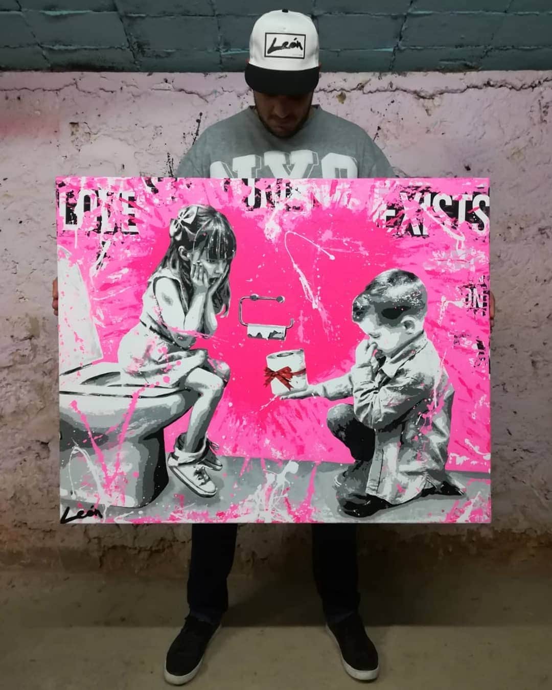 With his eyes closed and nose covered, the boy surrenders to the heroic act with a mixture of tenderness, humor, and absolute respect. It is a scene that turns an everyday and embarrassing moment into a pure gesture of care and complicity. Alberto León transforms the scatological into something almost romantic, reminding us that love and empathy are also found in the most ridiculous… and most human moments.