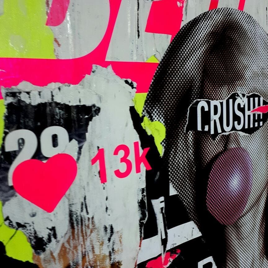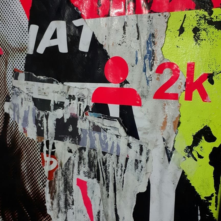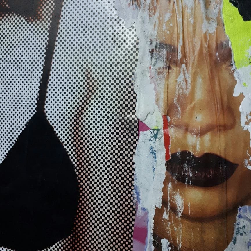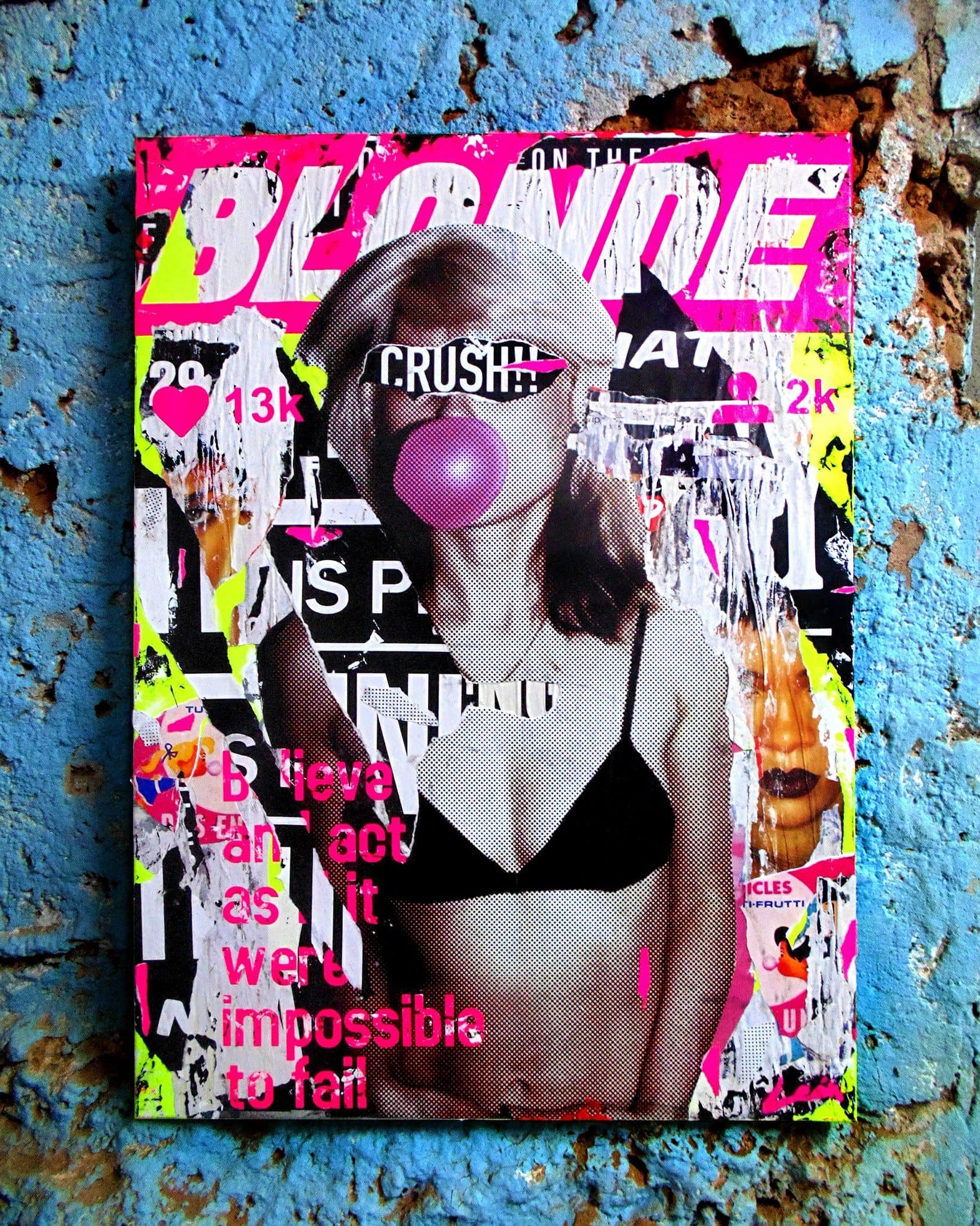 This vibrant piece combines the rebellious spirit of pop culture with a burst of fluorescent colors. The singer is shown with a large bubble of gum, radiating freshness and a carefree attitude, while surrounded by fragments of torn posters that evoke the aesthetic of a worn urban wall. At the top, instead of her usual name, it reads “Blonde,” a playful detail that reinterprets her image from a fresher and more provocative perspective.