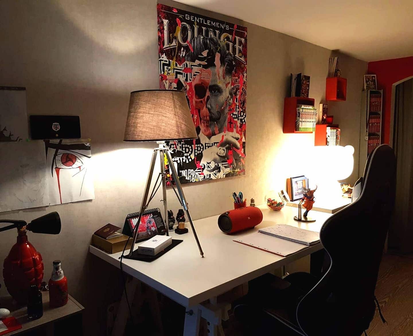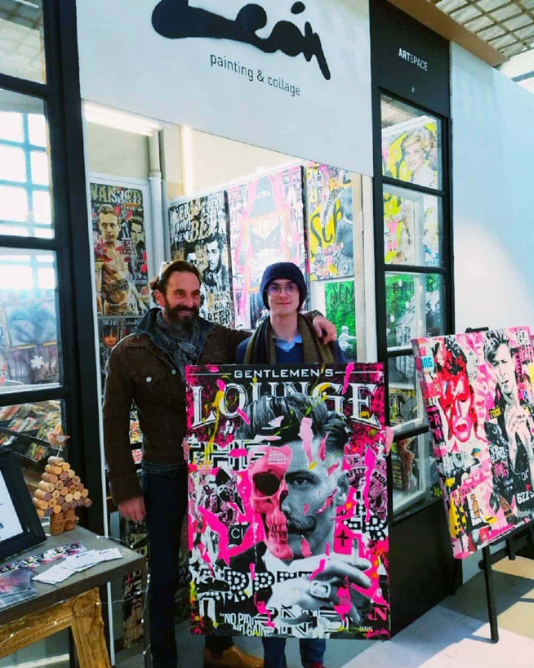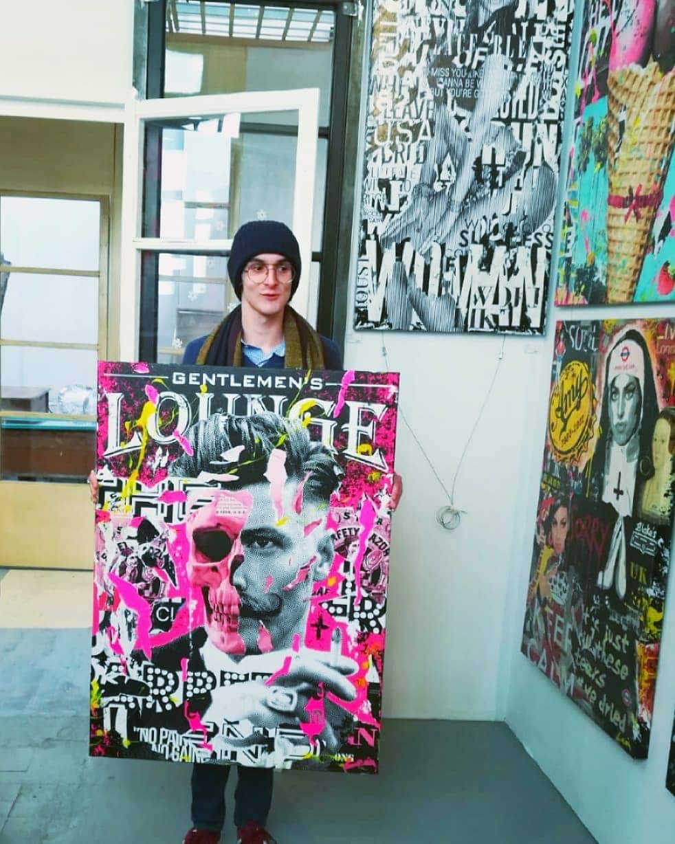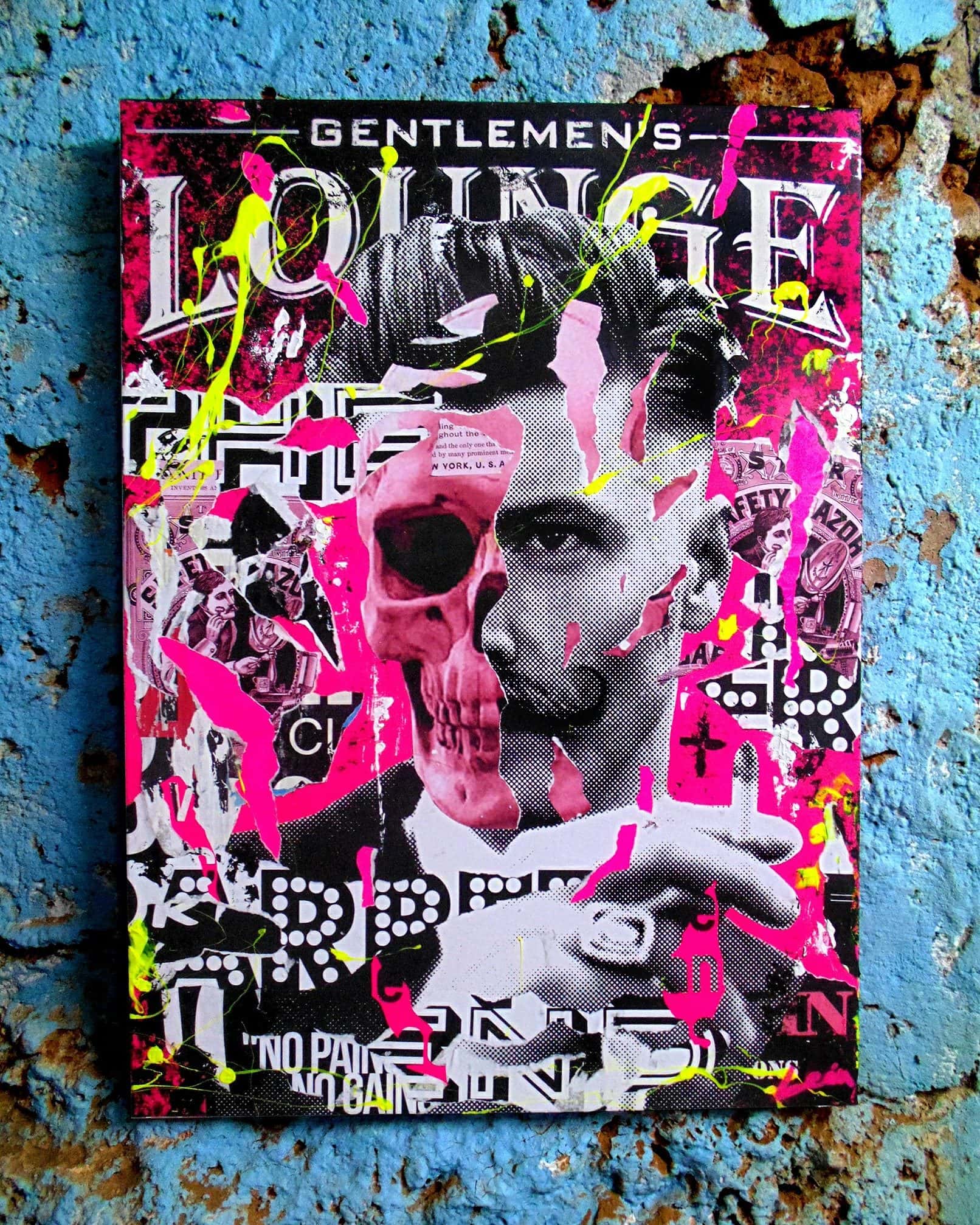 In this visually striking piece, a man with a vintage aesthetic and a bold haircut—somewhere between classic and modern—poses elegantly. His mustache harkens back to bygone eras, but the other half of his face reveals his skeleton, as if time, fashion, and identity coexist on the same plane. The entire background explodes in fluorescent color, amidst urban textures and visual nods to the ordered chaos of collage. At the top, the title “Gentlemen’s Lounge” seems to invite you to a club where masculinity is deconstructed with style and a touch of irony.
