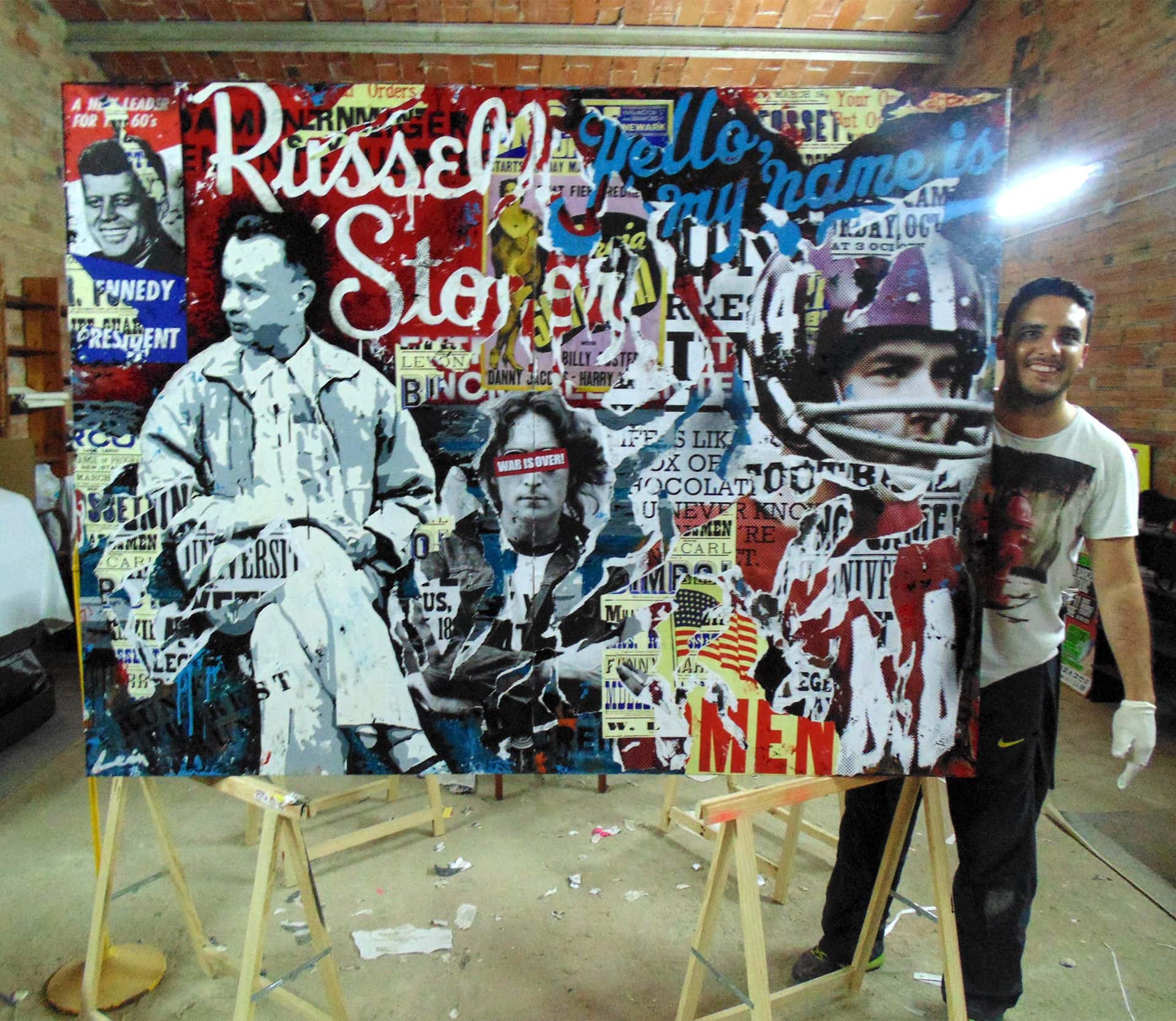This large canvas is a visual tribute to the story of a man who went through decades without realizing that he himself was history. Forrest Gump appears sitting in the center, with his lost, almost innocent gaze, as if he did not understand the noise he generates around him. To the right, his image as a football player recalls his improbable feats, while in the center, John Lennon connects us with the peace and surrealism of chance encounters. In the upper left, Kennedy observes him as part of that real absurdity that was his life.