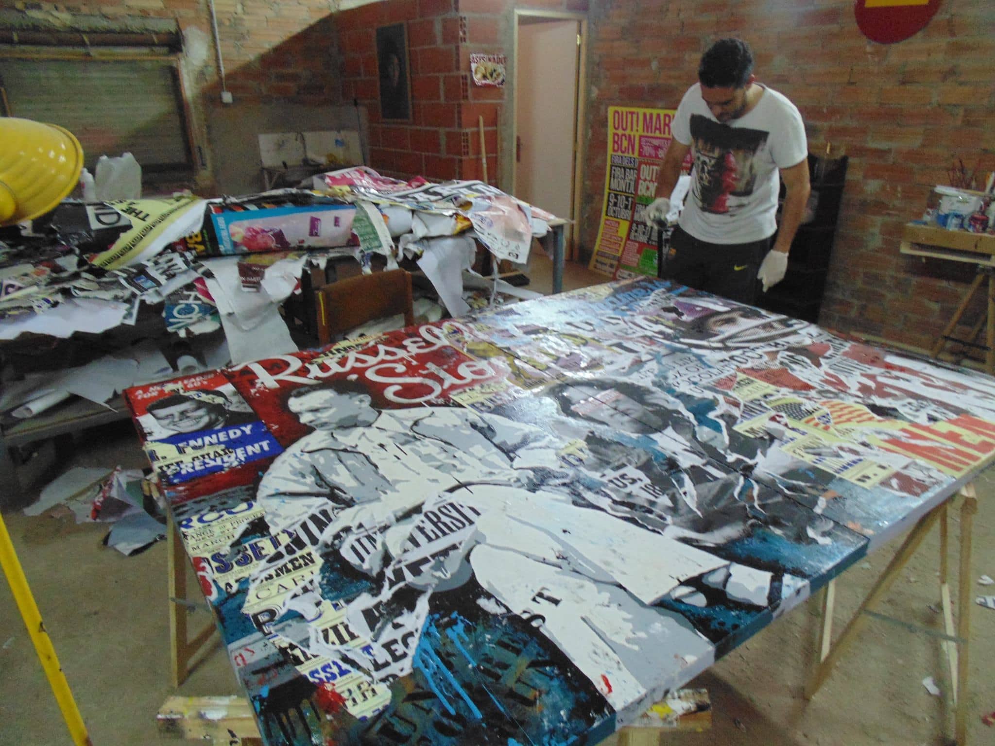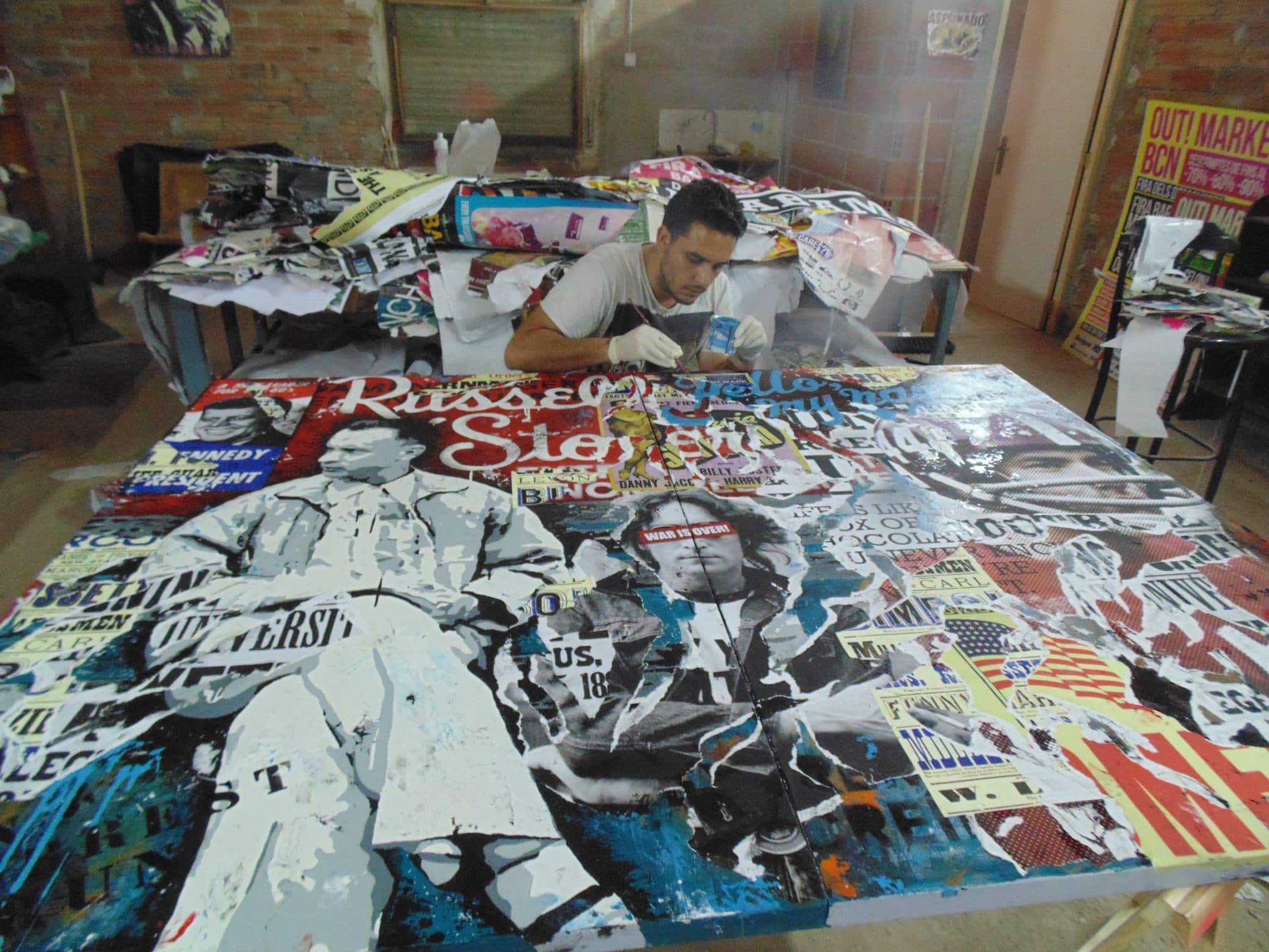 The iconic box of Russell Stover chocolates sneaks in as a symbol of chance and destiny. The entire background, formed by collages of worn American posters, reddish, blue, and white colors, evokes a dirty but alive wall, full of popular memory. The result is a visual explosion between nostalgia and urban pop, where each figure reinforces the idea that history is not always made by those who want to, but by those who simply run.