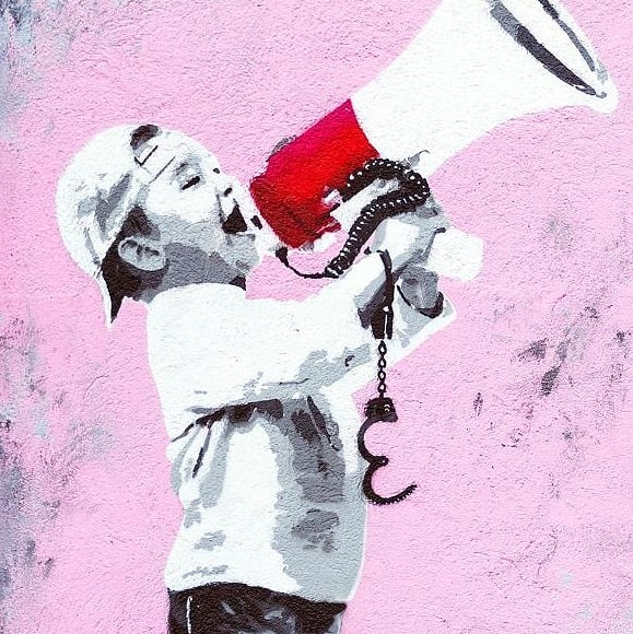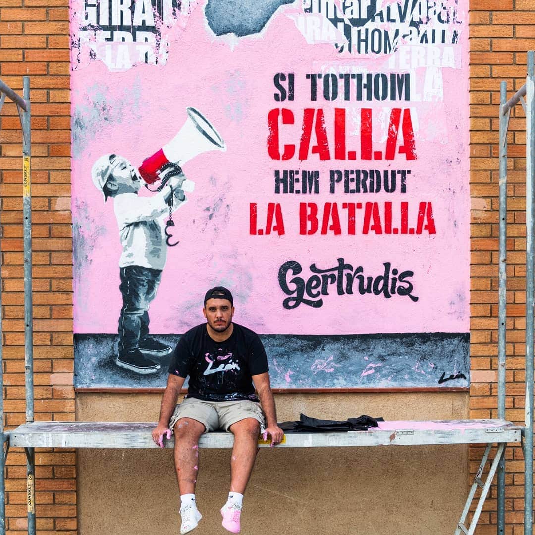 In this vibrant mural created by Alberto León for the Catalan musical group Gertrudis, urban art becomes a visual cry for freedom of expression and social participation. Against a worn pink background, a child holds a megaphone and raises his voice, symbolizing the power of the word and the need not to remain silent in the face of injustice.