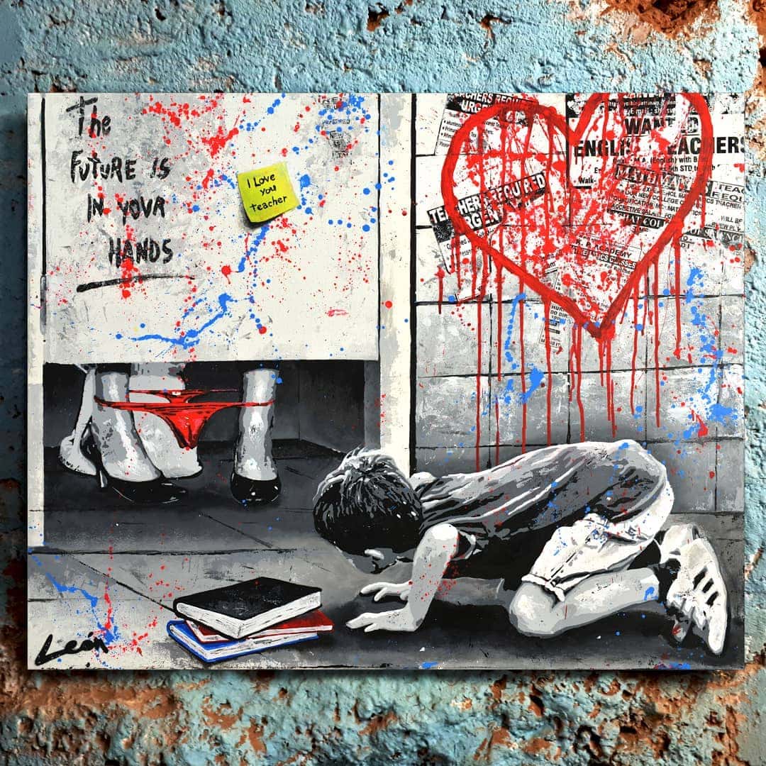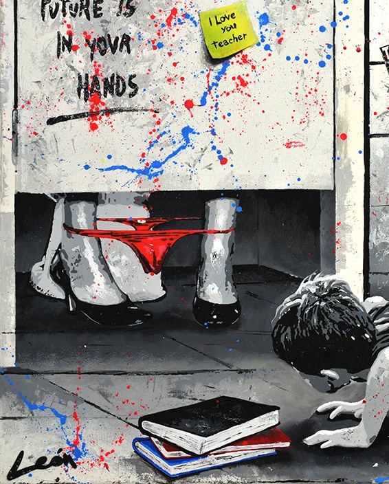 This piece portrays a mischievous and tender moment in the teachers’ bathroom. A child has snuck in to spy on his teacher from under the door, where her feet, ankles, and a slightly lowered red thong are visible. The child, half-lying on the floor with his head almost touching the ground, has put his books aside to observe. Right on the door, a handwritten note says “I love you teacher,” reflecting that mixture of admiration and childish fascination.