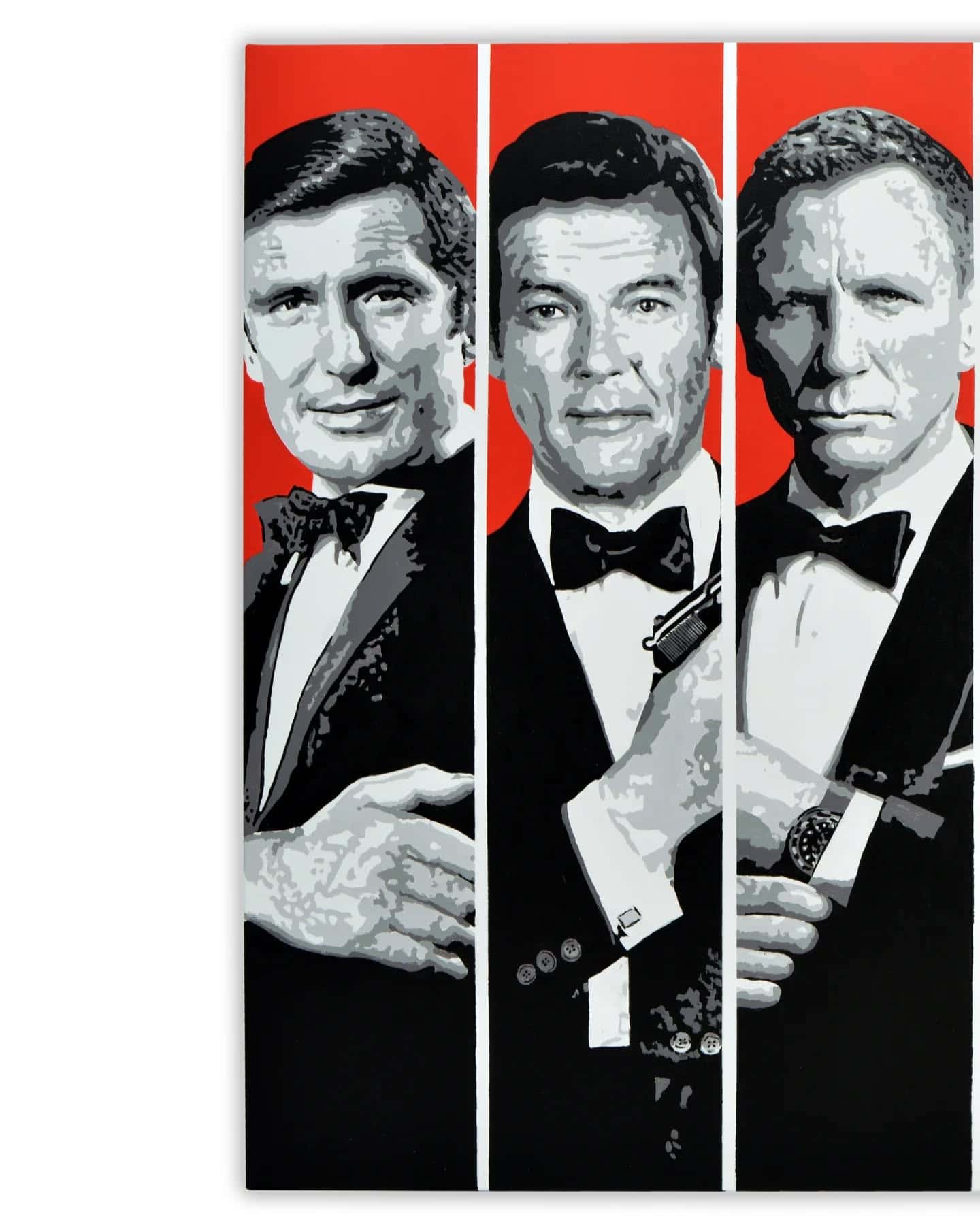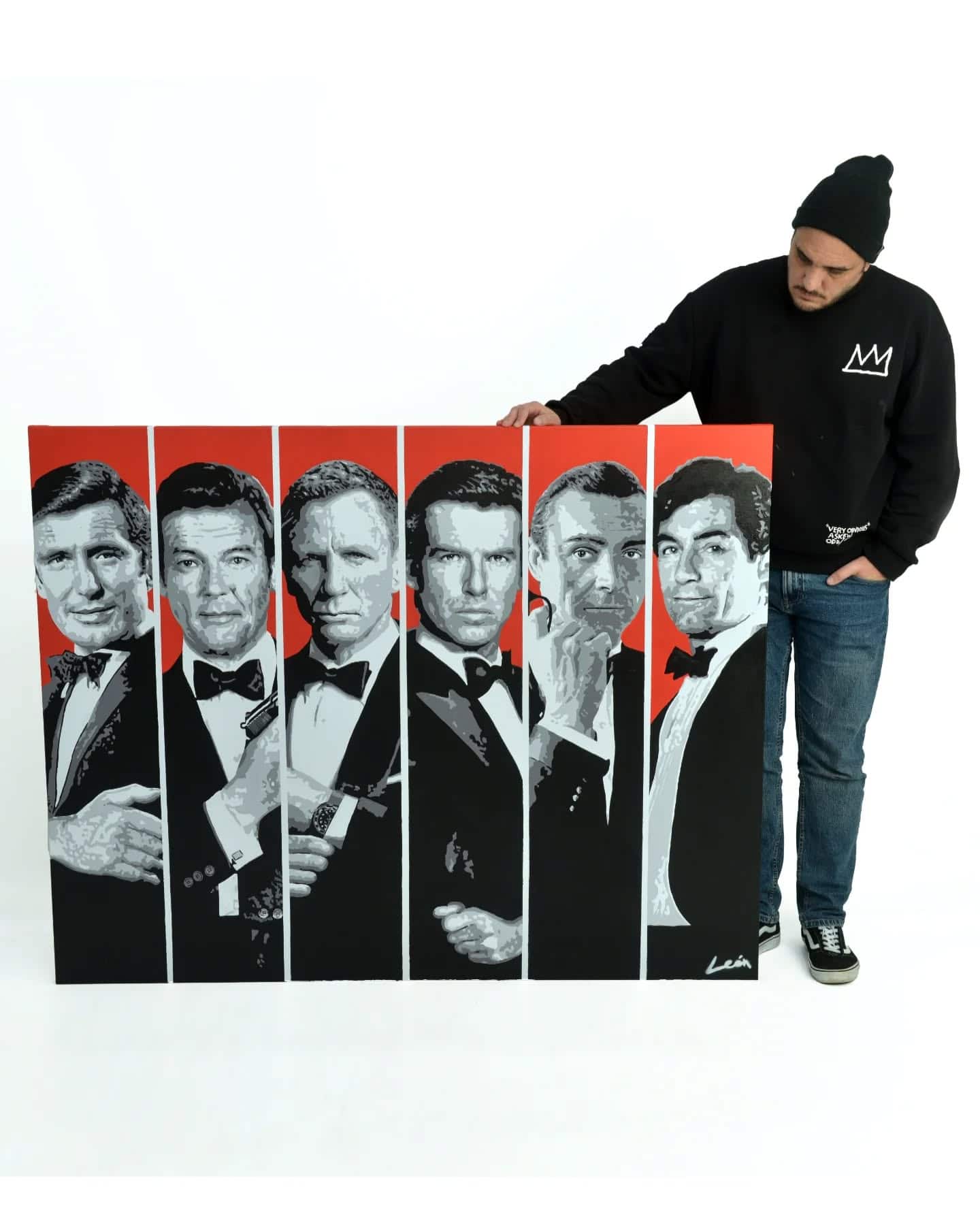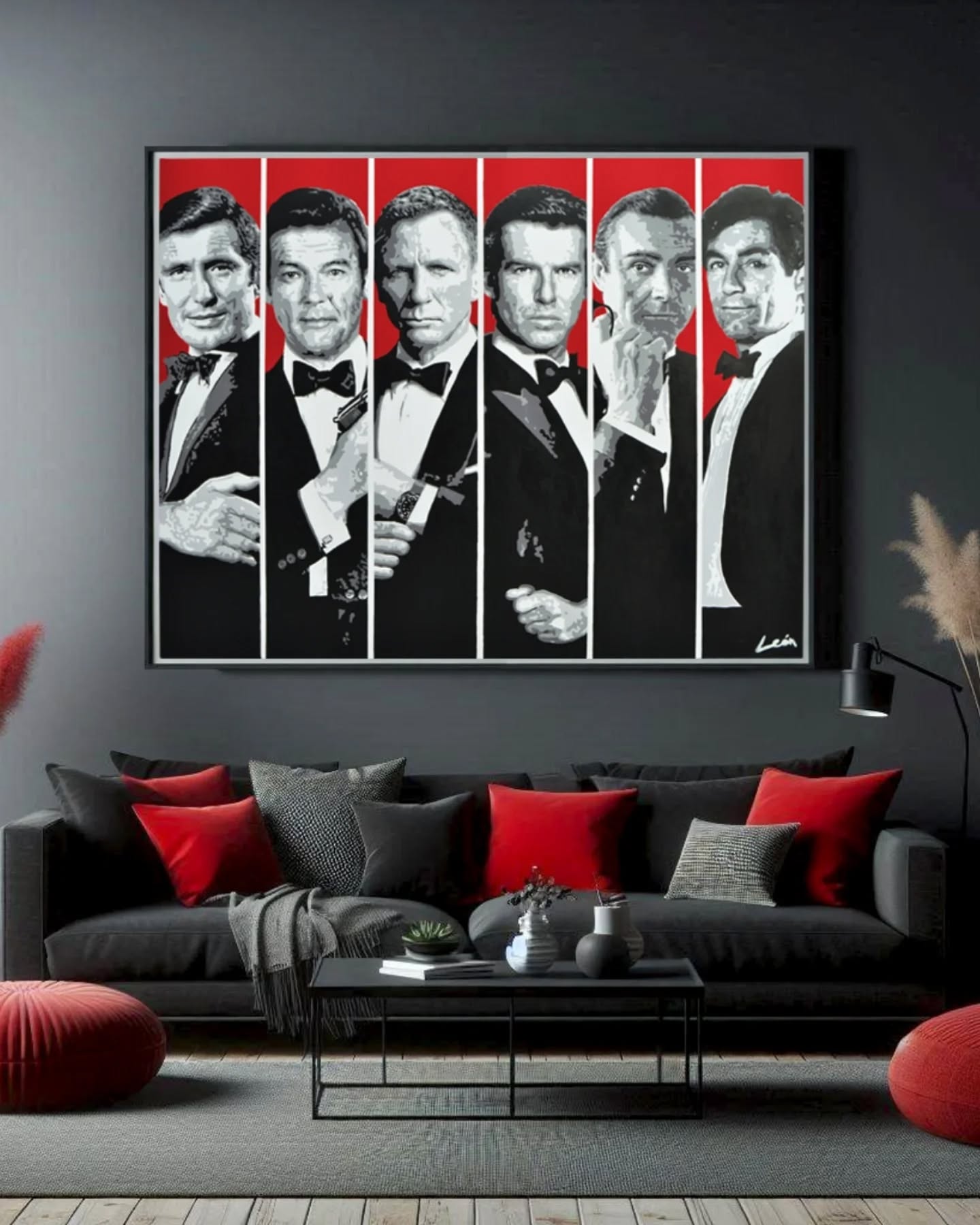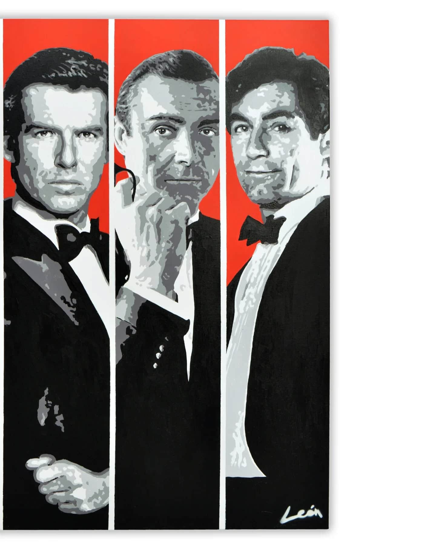 With a style close to pop art, León uses a reduced palette of blacks, grays, and whites on a vibrant red background, achieving a contrast of great visual force. Each actor appears framed in a vertical segment, as if they were individual frames that together build the legend of Bond. The elegant gestures, the tuxedo, and the attitudes of each reinforce the iconic image of the character: sophisticated, seductive, and enigmatic.