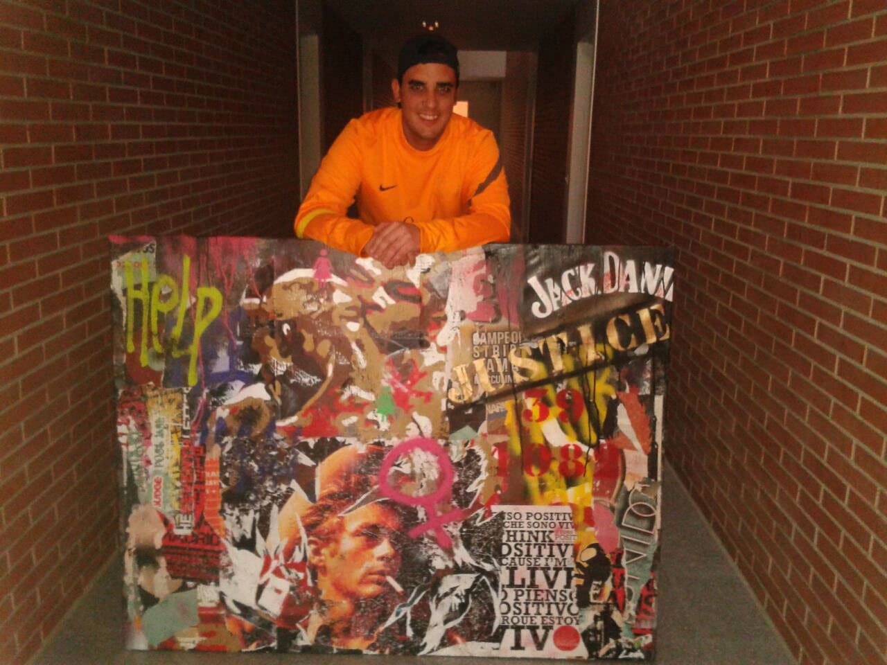 Alberto León’s first large painting, created in 2012 and measuring 146 cm, is an intense and somewhat chaotic mix where multiple concepts and references converge. It features iconic images such as James Dean, Tyson’s bite on Holyfield, and the symbol of women, all integrated with modern and old posters, words written in spray paint, and an explosion of paint and color.