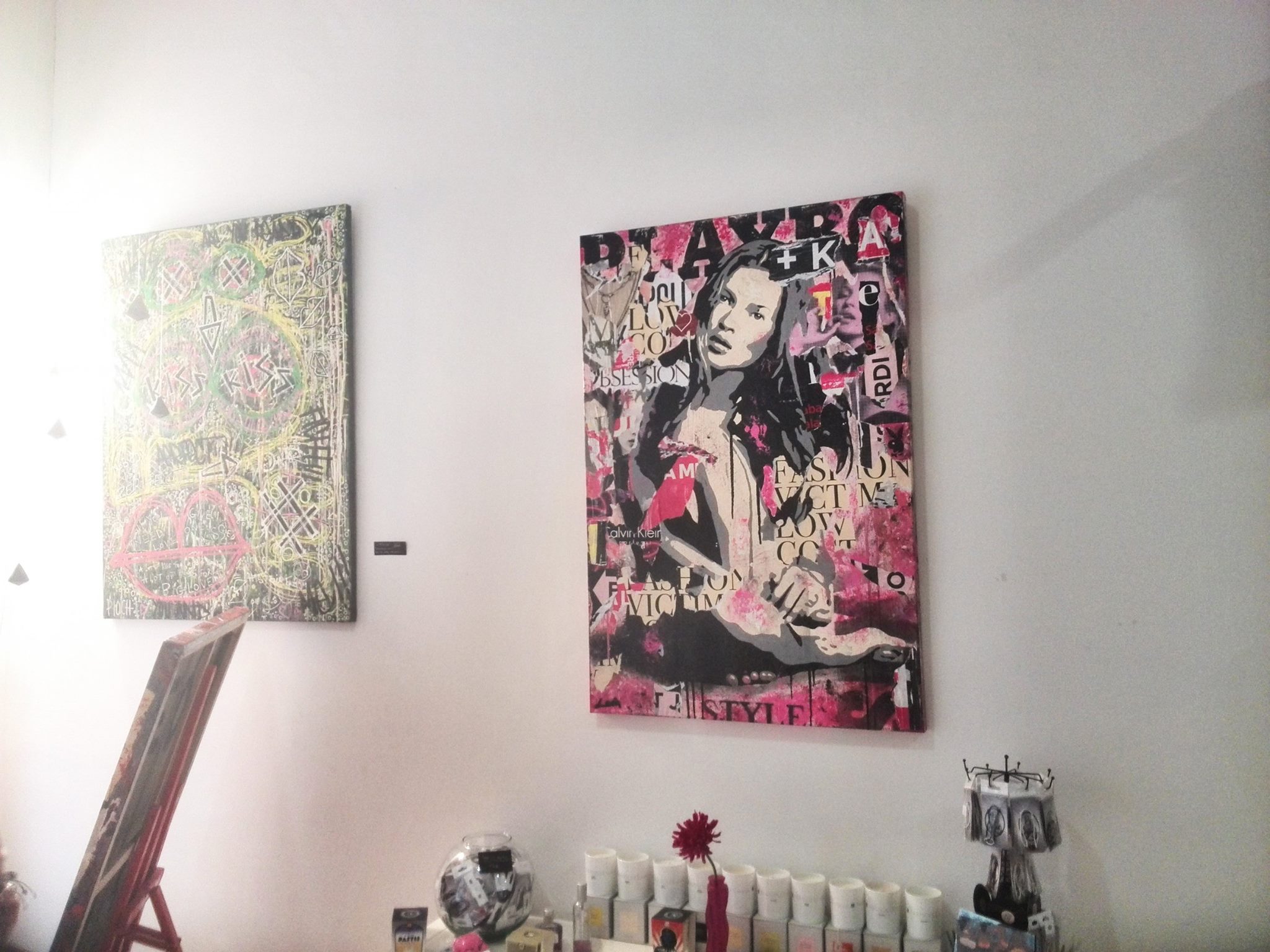 In Fashion Victim, Alberto León portrays Kate Moss on a vertical canvas where pink dominates the scene in different shades, enveloping the work with a mixture of elegance and provocation. Kate appears seated, integrated into a composition of torn posters, typographies, and textures, as if she were part of an urban wall full of visual messages.