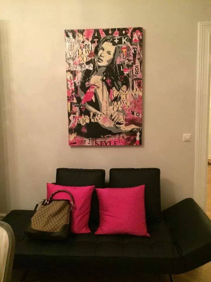 The word PLAYBOY appears at the top, referring to the media imagery that surrounded her figure for years. León does not present Kate as a catwalk icon, but as a product and victim of an industry that glorified and wore her out in equal parts. The work, with its graphic force and critical gaze, ended up hanging in a house in Oslo, carrying with it a reflection on beauty, consumption, and fame.