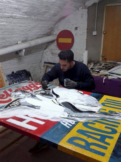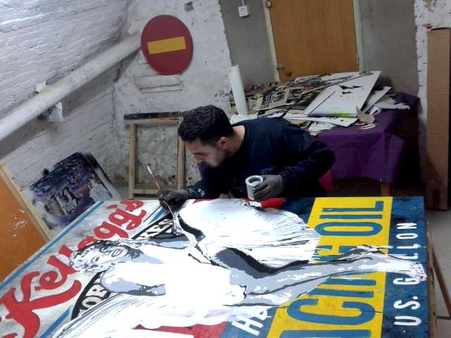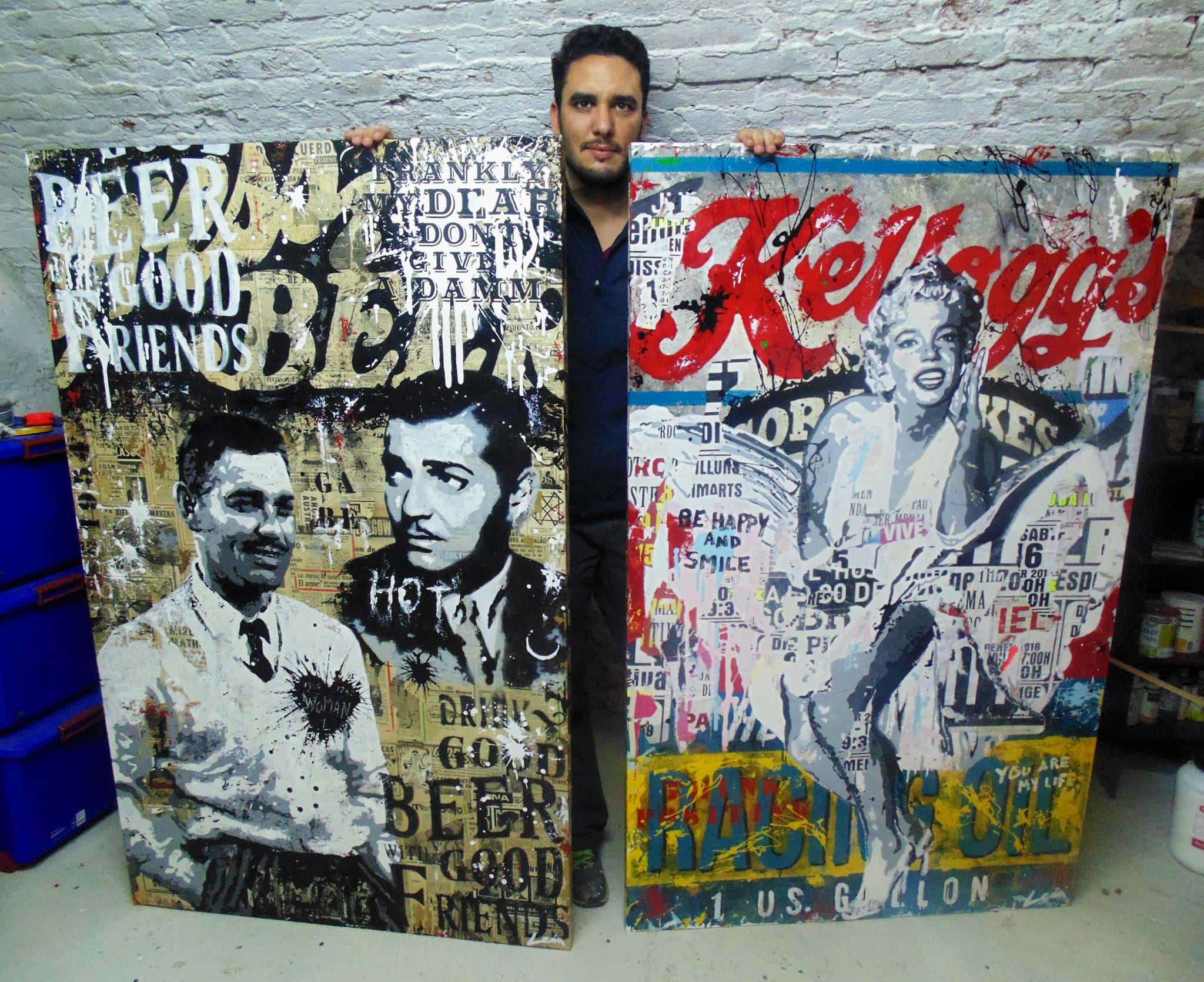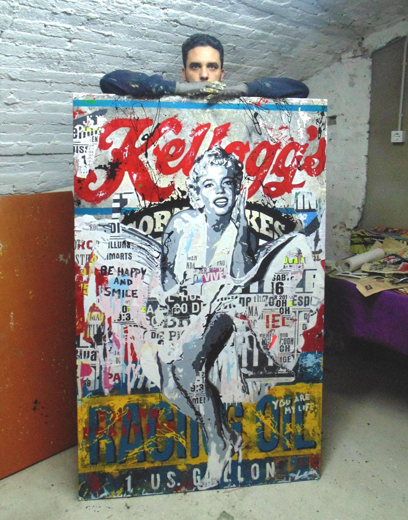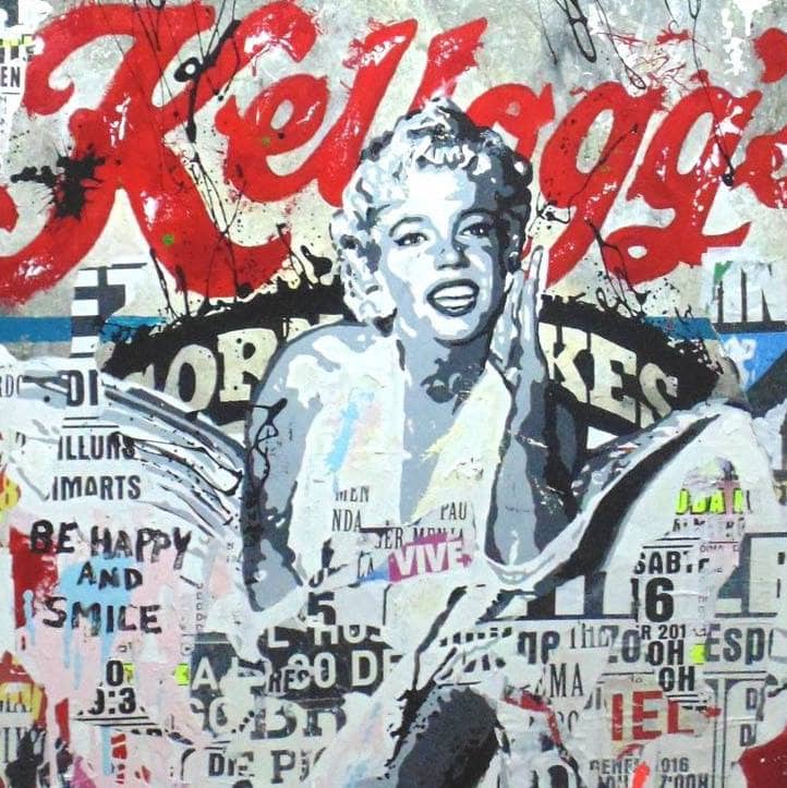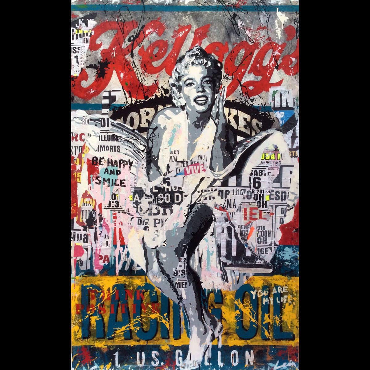 This piece features Marilyn Monroe in her iconic pose with the billowing dress, fused with a vintage poster that envelops and transforms the scene. Above, the red letters of Kellogg’s and below, the inscription of Racing Oil add a classic advertising touch that interacts with the pop and urban image. The worn background, with bright reds, blues, and yellows, creates a vibrant but aged contrast, as if time had painted over an urban postcard full of history and style. The result is an elegant and fresh tribute, where vintage meets the energy of street art.
