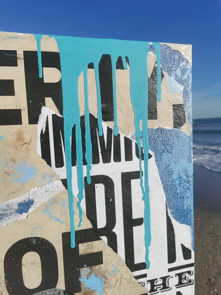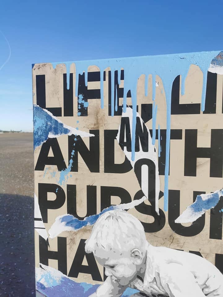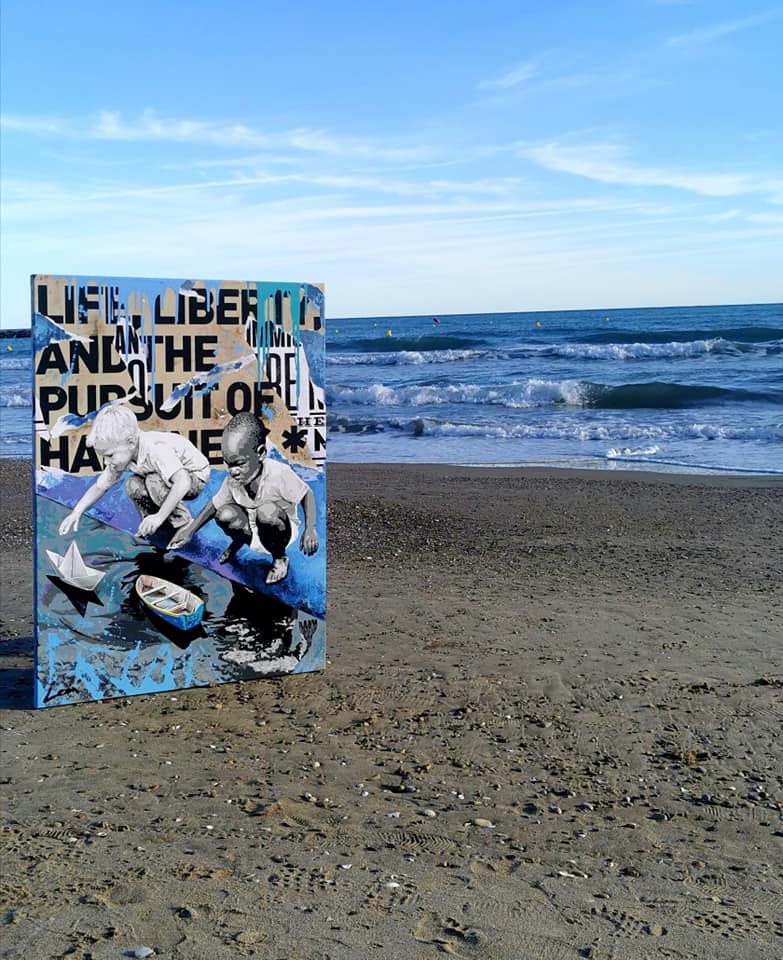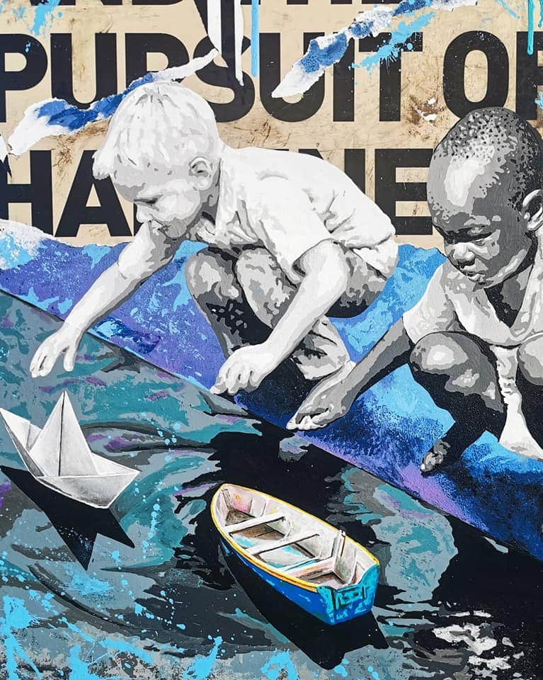 The background, with the fragmented phrase “Life, Liberty and the pursuit of Happiness”, underscores the contradiction between the universal right to freedom and happiness, and the real inequality that separates both children. The mix of realism and urban graffiti accentuates this contrast, turning the scene into a reflection on innocence, memory, and social justice.