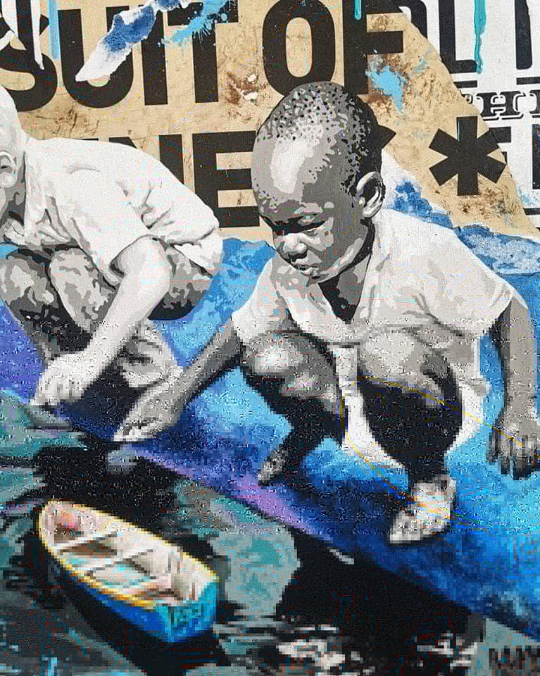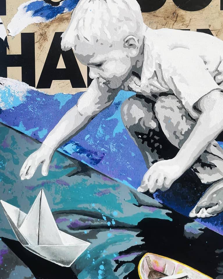Alberto León’s work “Paper Journey” (90 x 120 cm) depicts two children playing by the water’s edge, but with a background full of symbolism. The white child propels a fragile paper boat, a representation of imagination and childhood innocence, where play is experienced as a risk-free adventure. In contrast, the black child holds a small toy boat reminiscent of a raft, an object that in his imagination is not just fun, but a reflection of the harsh and dangerous journeys that many must face to seek a better future.