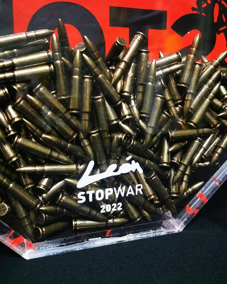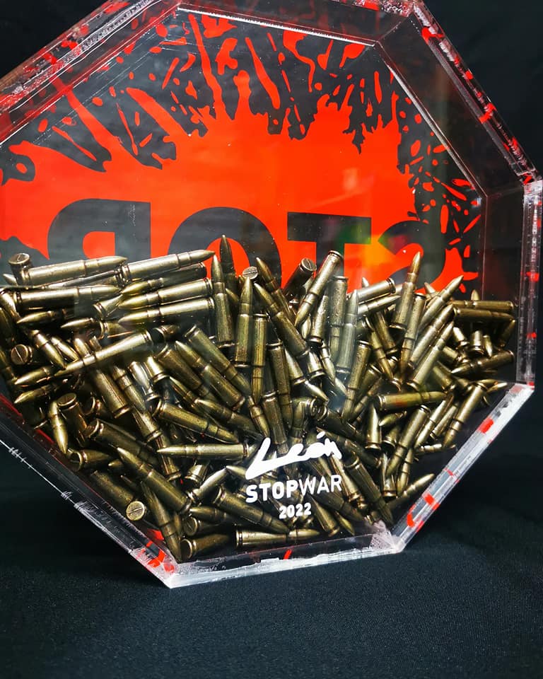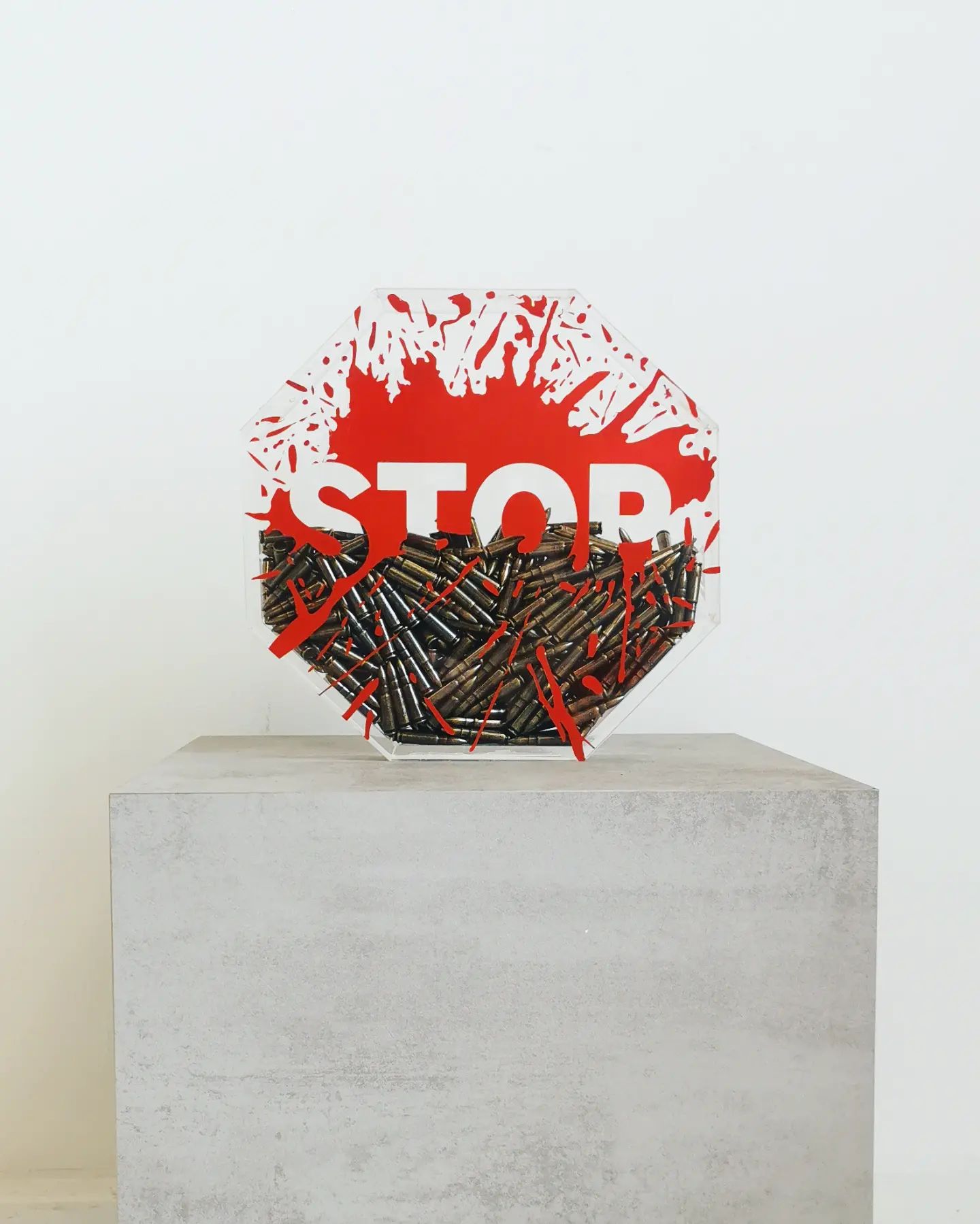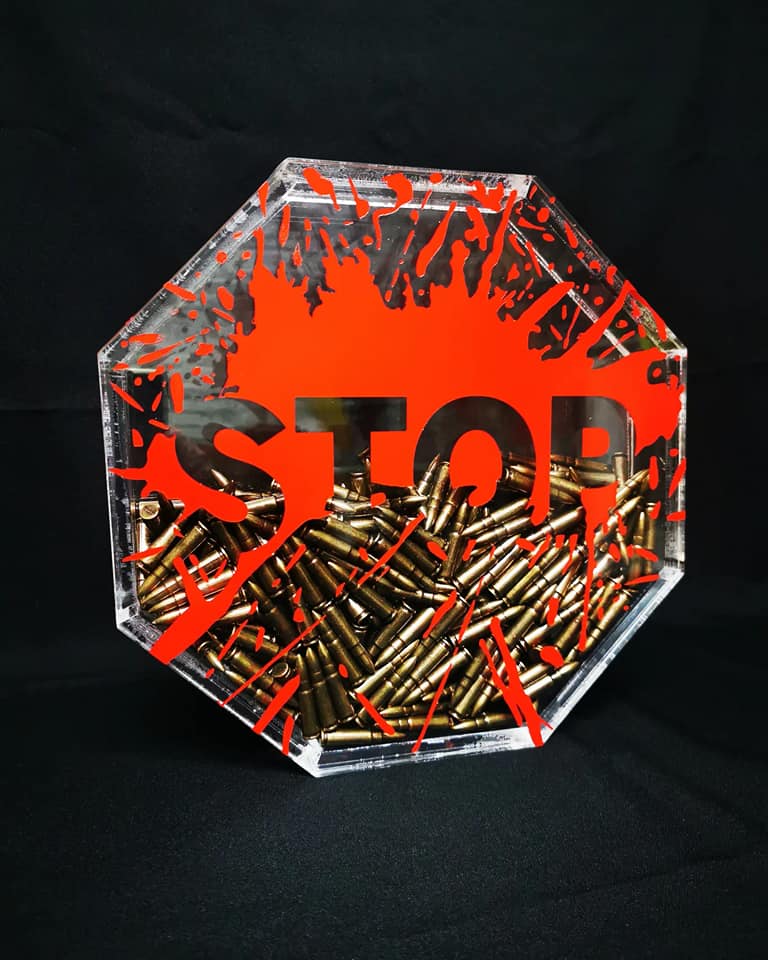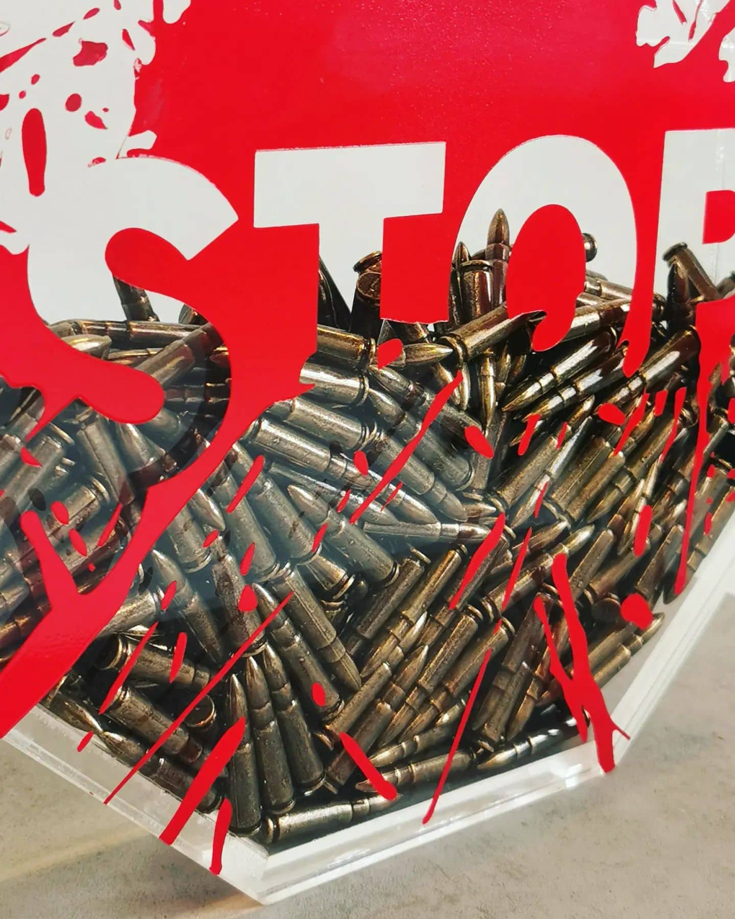 Transparent methacrylate sculpture, 10 mm thick, 32 x 32 x 8 cm, filled with 300 replicas of 49 mm high, 14 gr. Russian AK47 bullets.