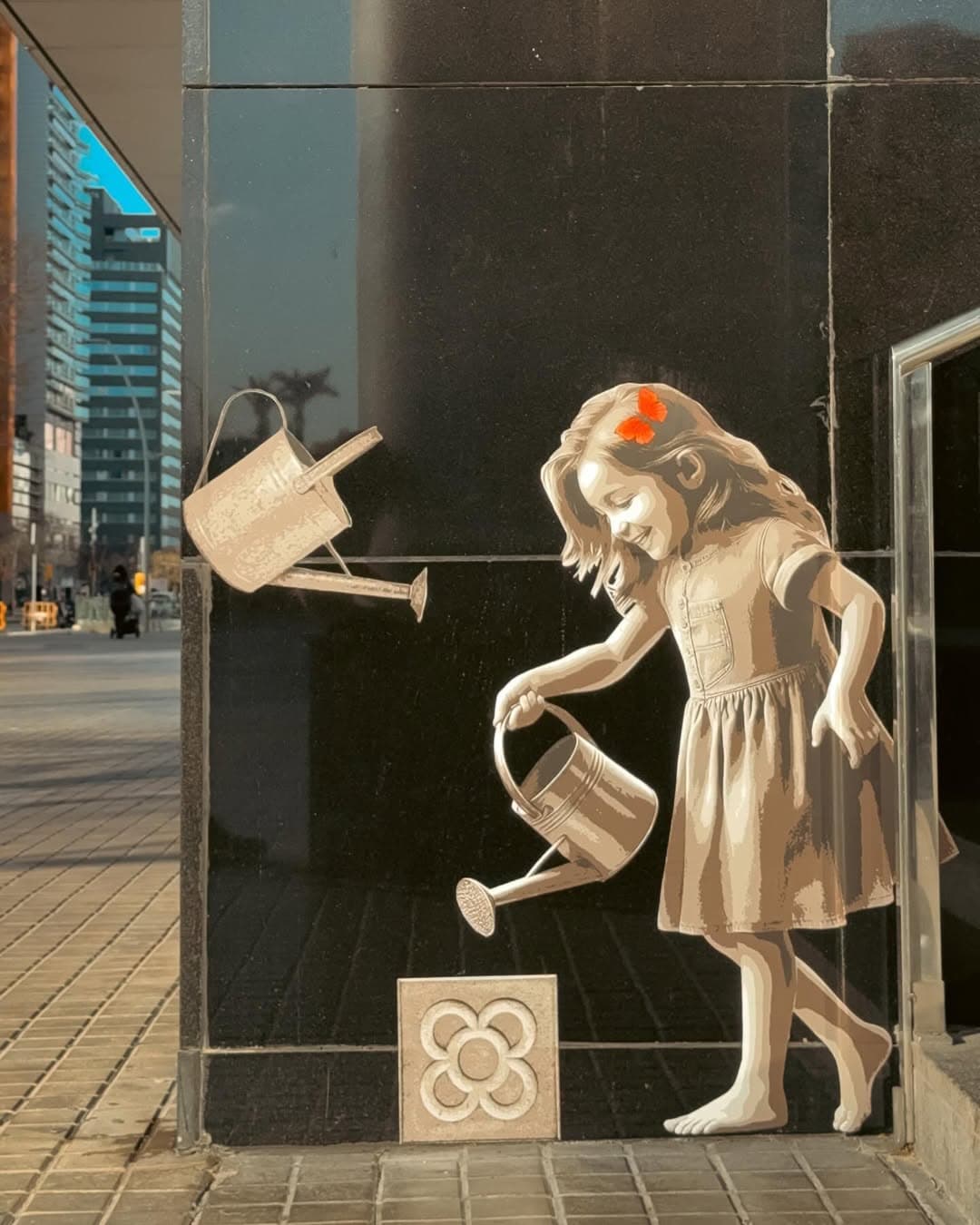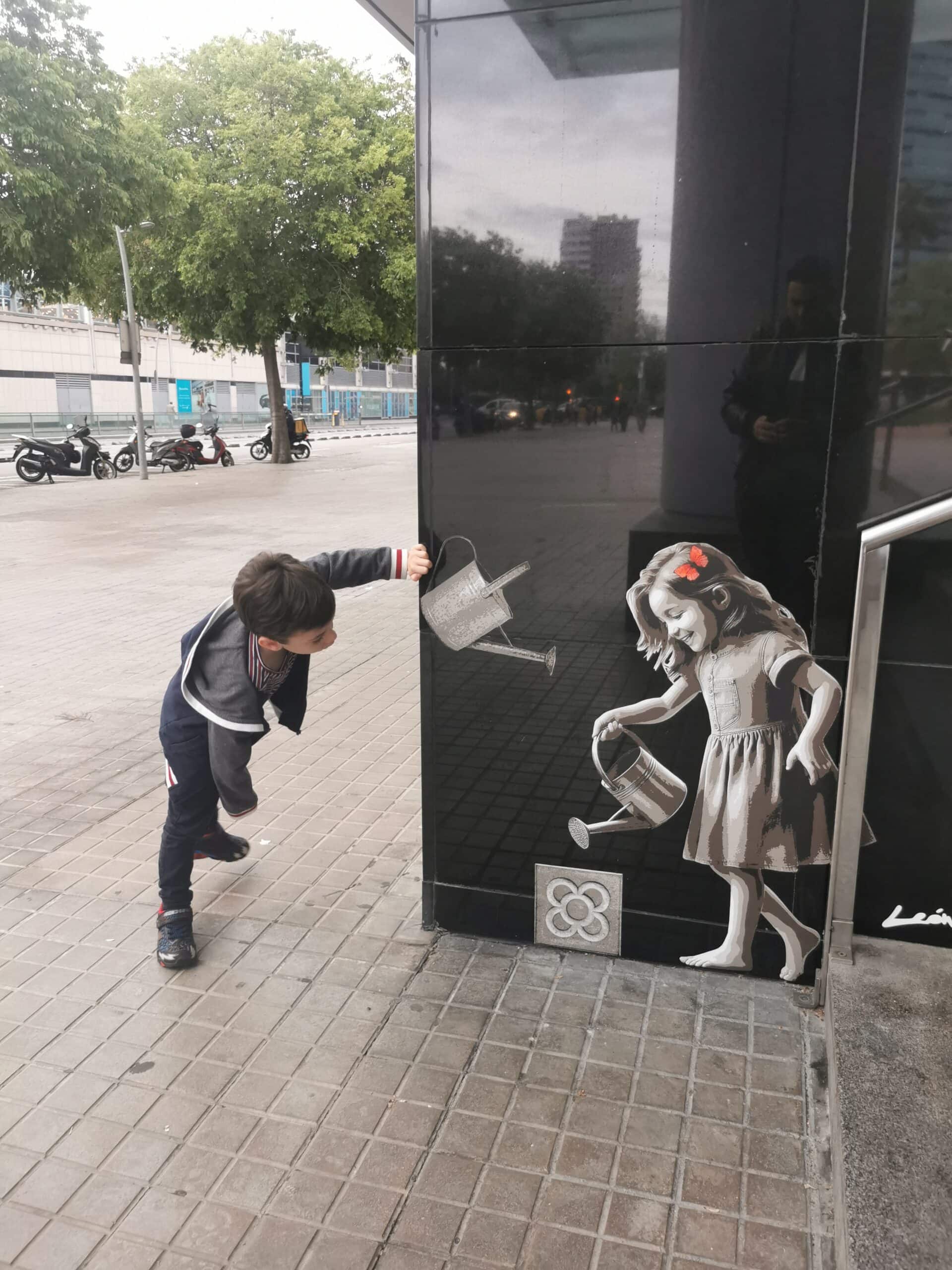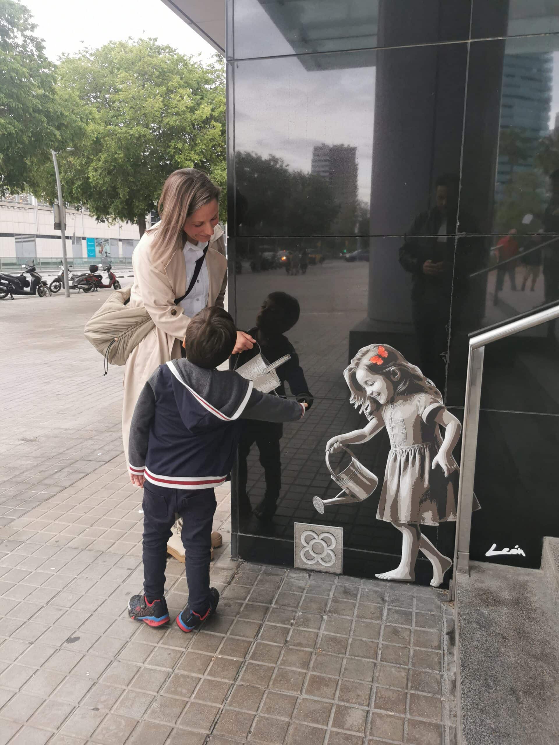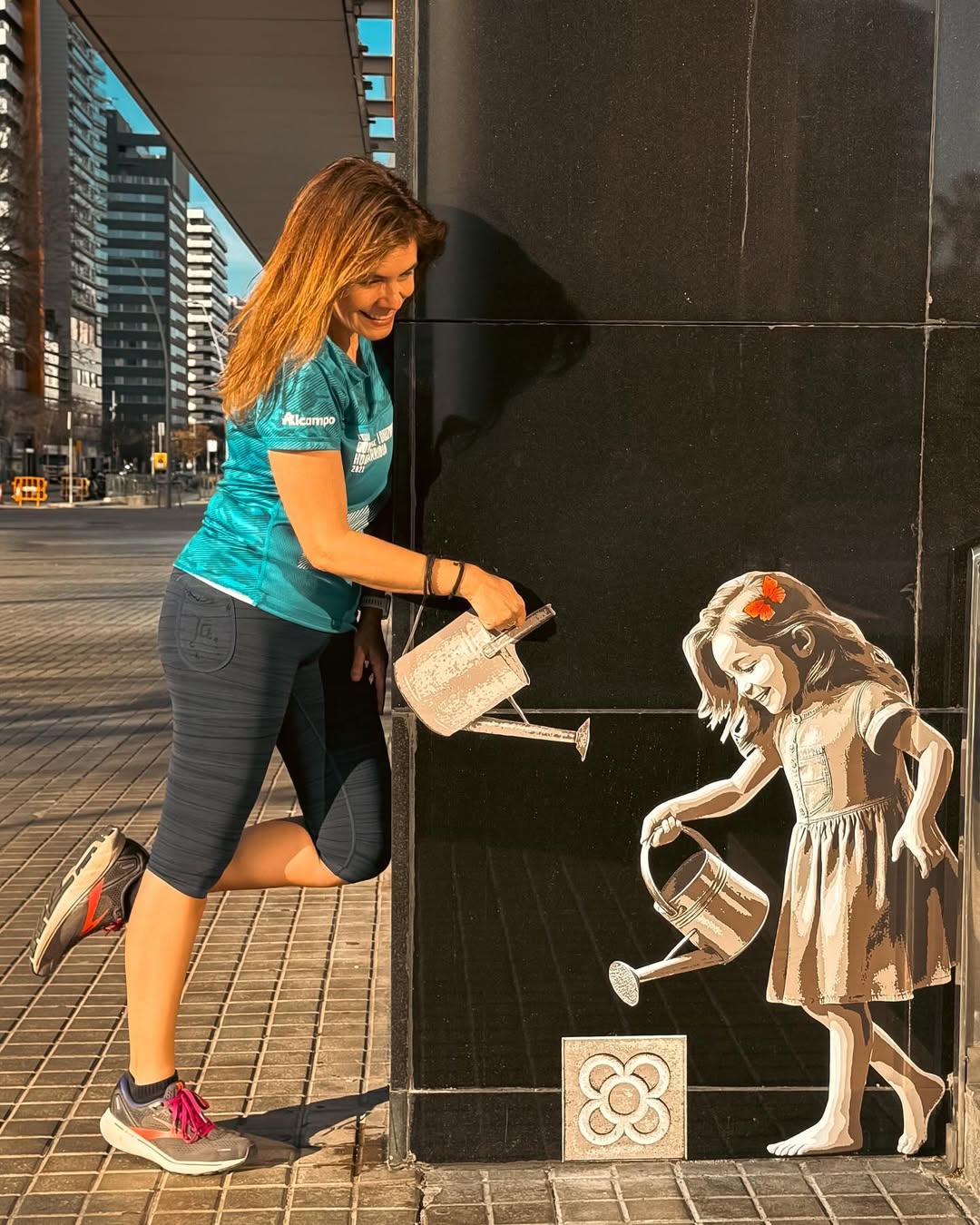 In the image, a woman interacts with a work by the artist Alberto León located at the entrance of the Hilton Diagonal Mar hotel. The piece shows a girl watering with a watering can, and thanks to the participation of the public, the scene comes to life. The woman holds a watering can that “completes” the action of the mural, as if both were watering together. The water symbolically falls on a rose from the famous Barcelona pavement, representing care and respect for the city, its identity, and its sustainability.