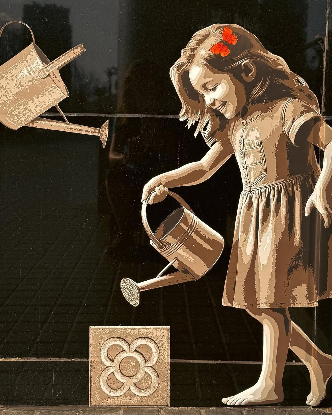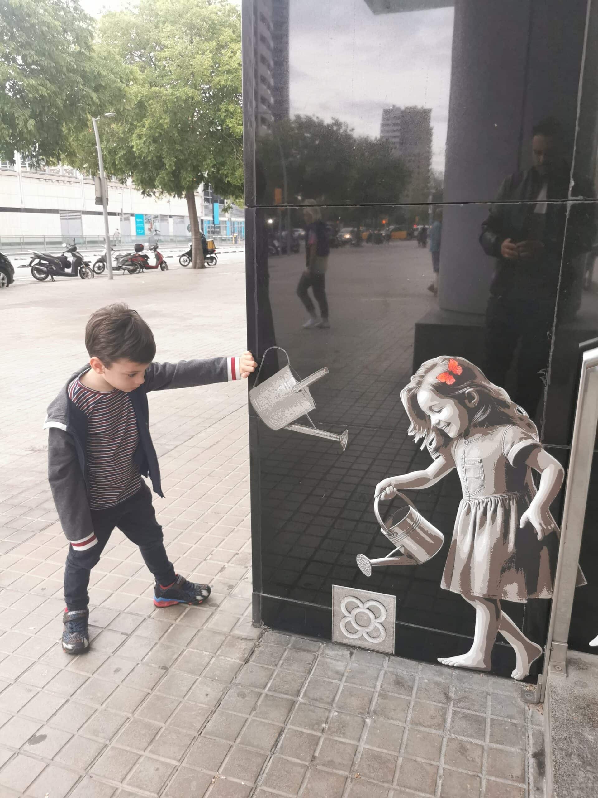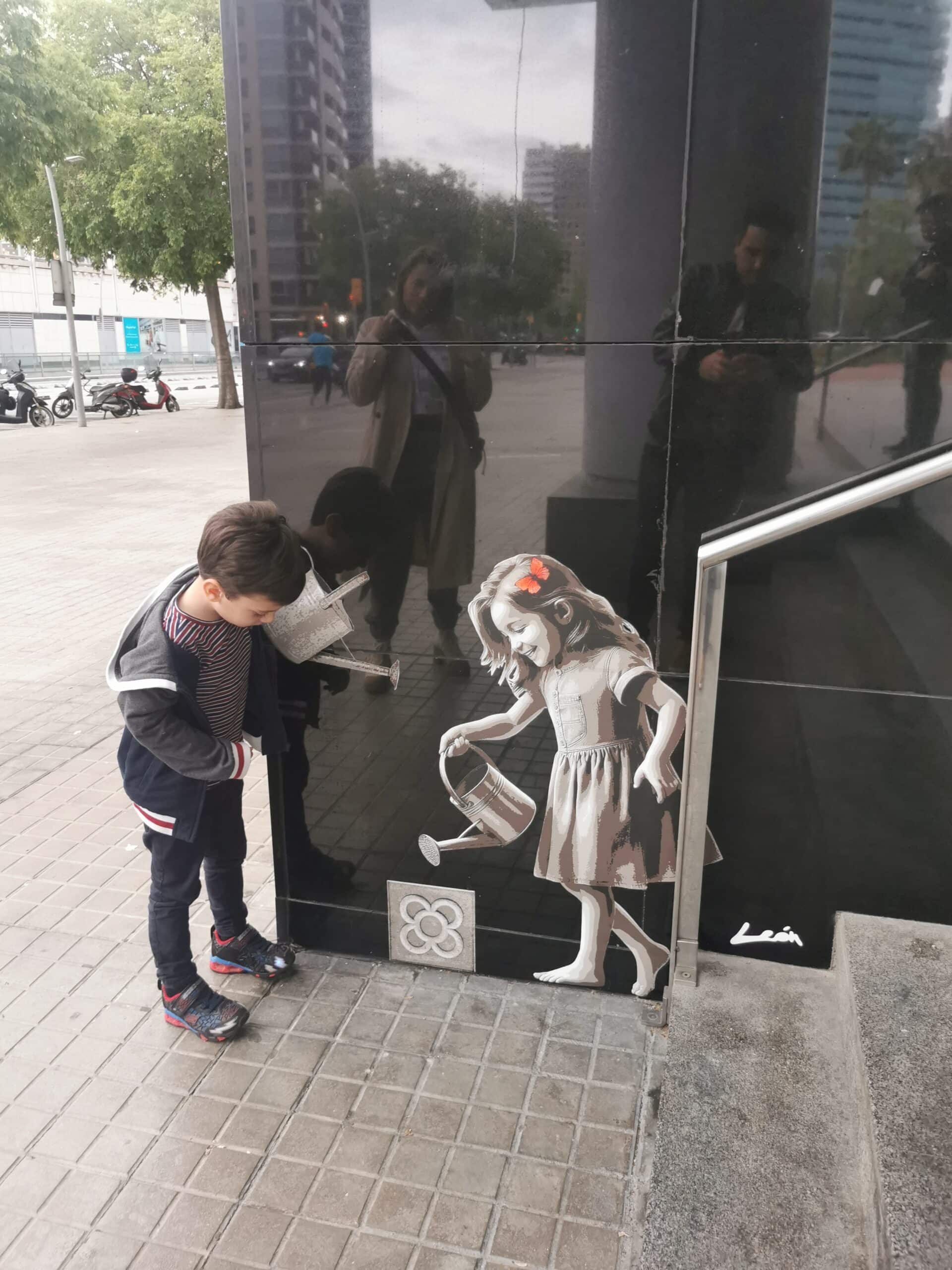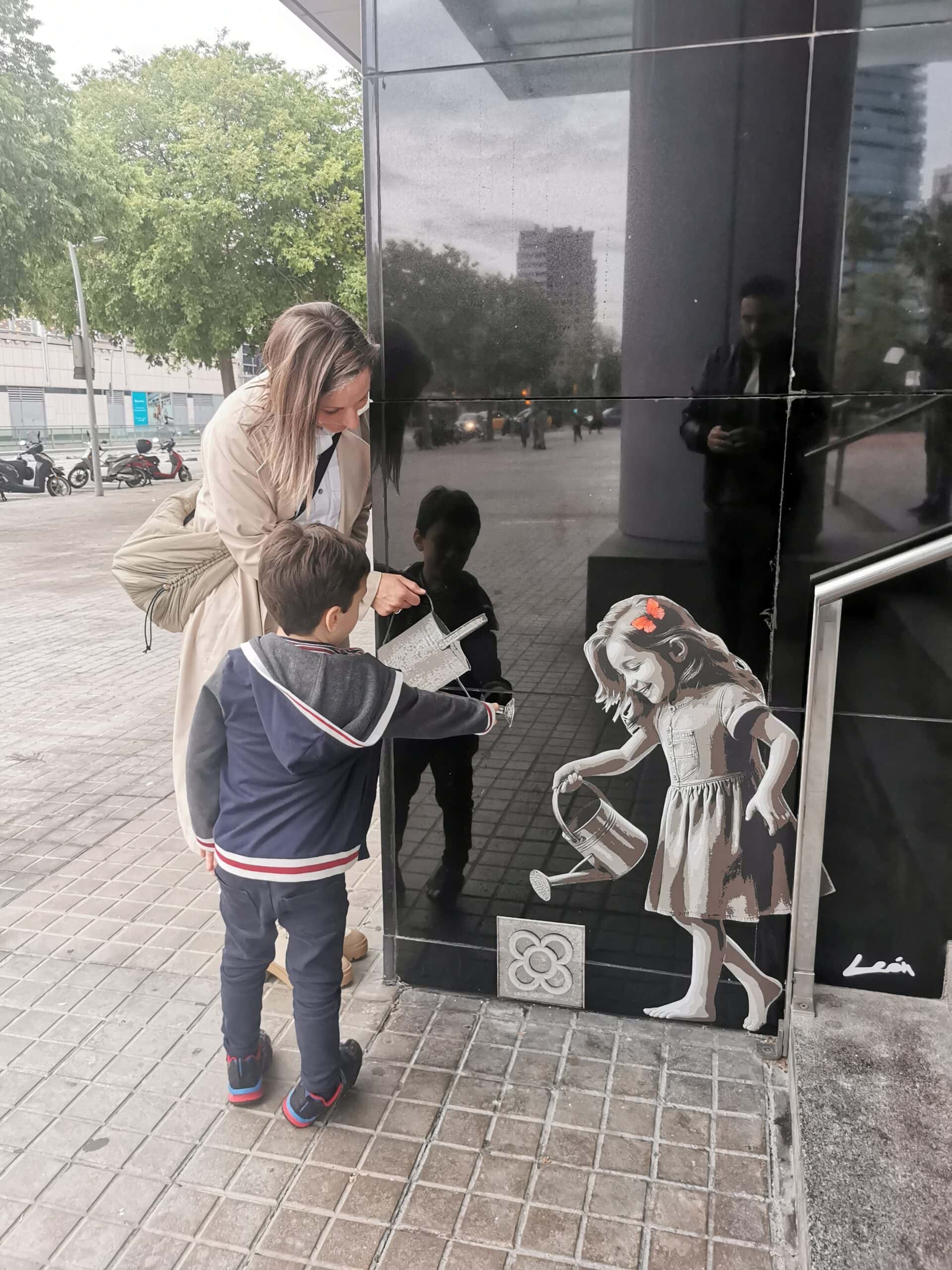 In the image, a woman interacts with a work by the artist Alberto León located at the entrance of the Hilton Diagonal Mar hotel. The piece shows a girl watering with a watering can, and thanks to the participation of the public, the scene comes to life. The woman holds a watering can that “completes” the action of the mural, as if both were watering together. The water symbolically falls on a rose from the famous Barcelona pavement, representing care and respect for the city, its identity, and its sustainability.