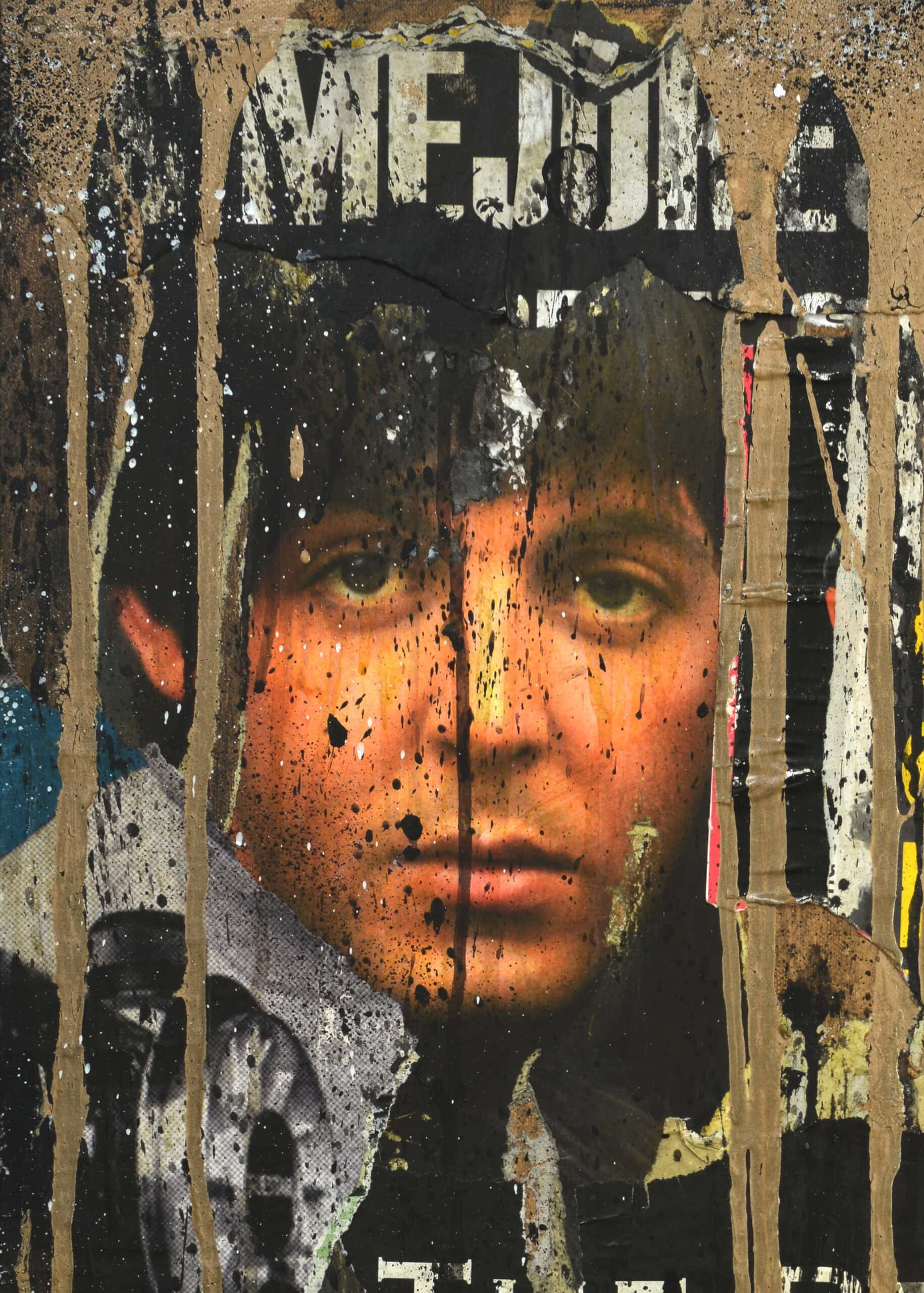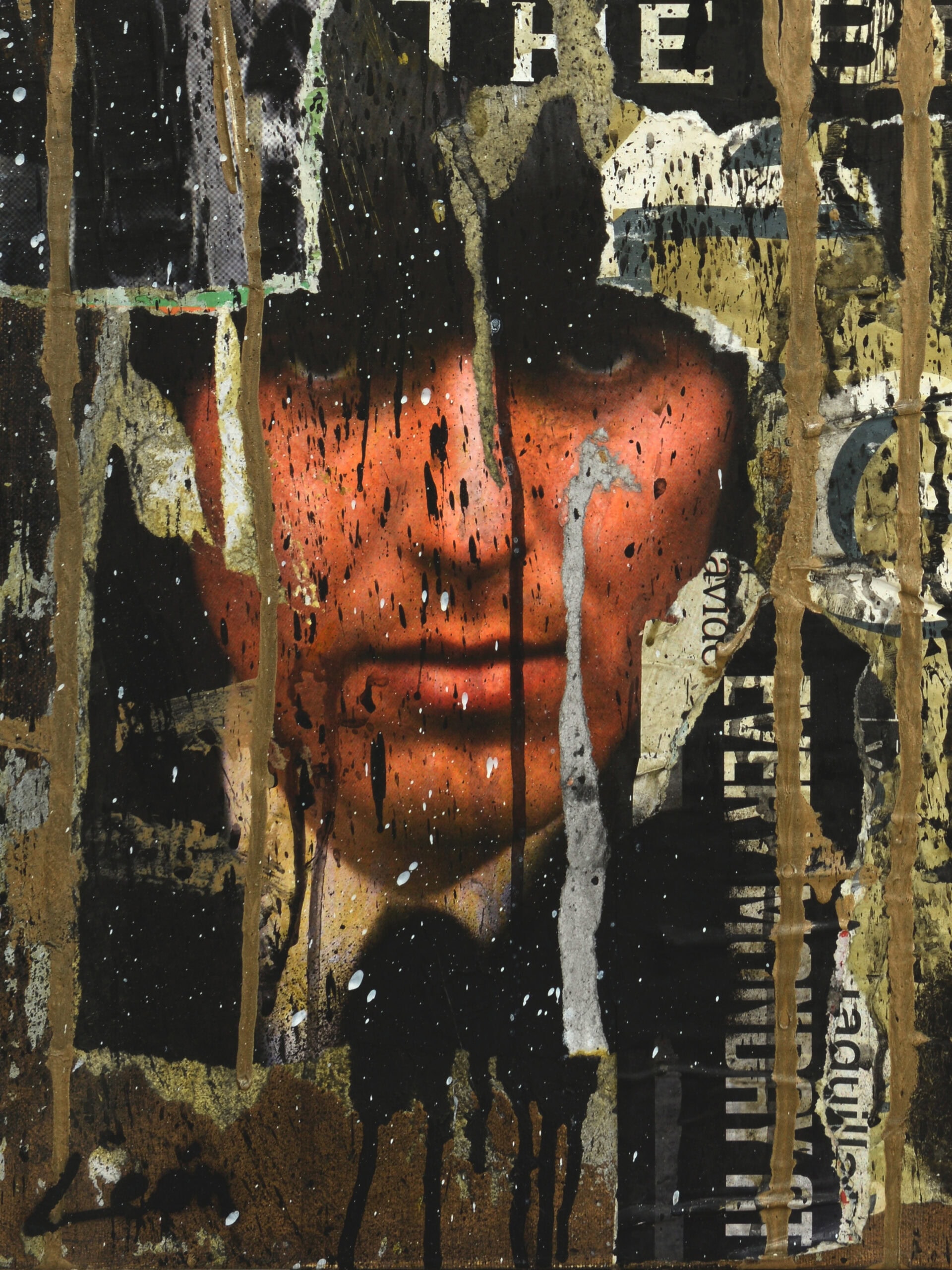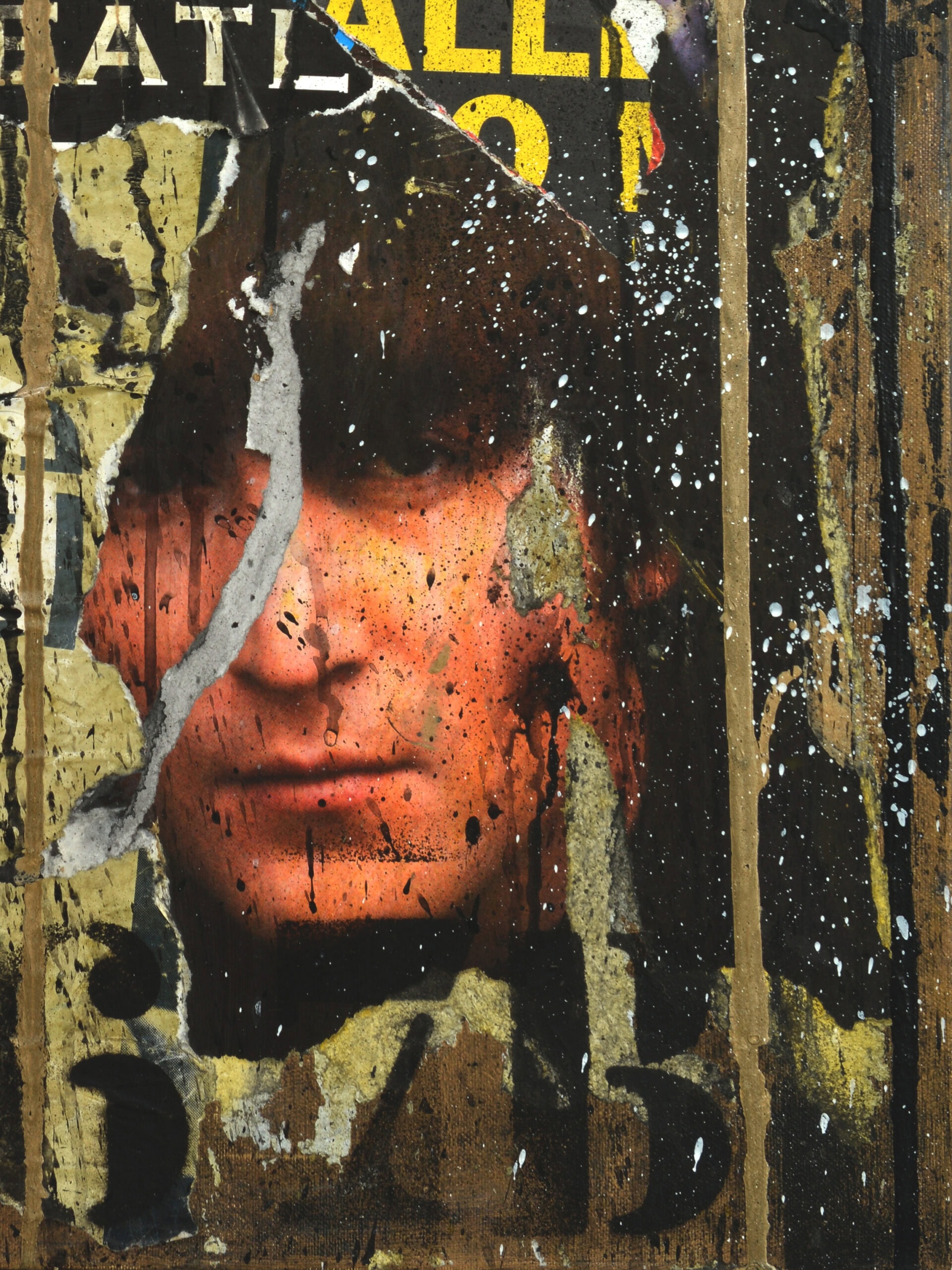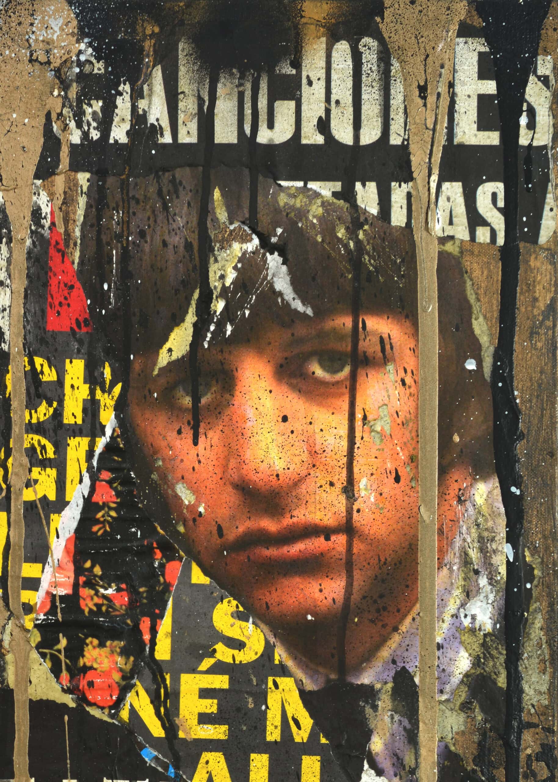 In this 60 x 80 cm canvas, Alberto León creates a sober and elegant piece, dominated by toasted golden and deep brown tones. The faces of the four members of The Beatles appear printed on paper and fused with fragments of torn posters, as if emerging from an old wall full of memories.