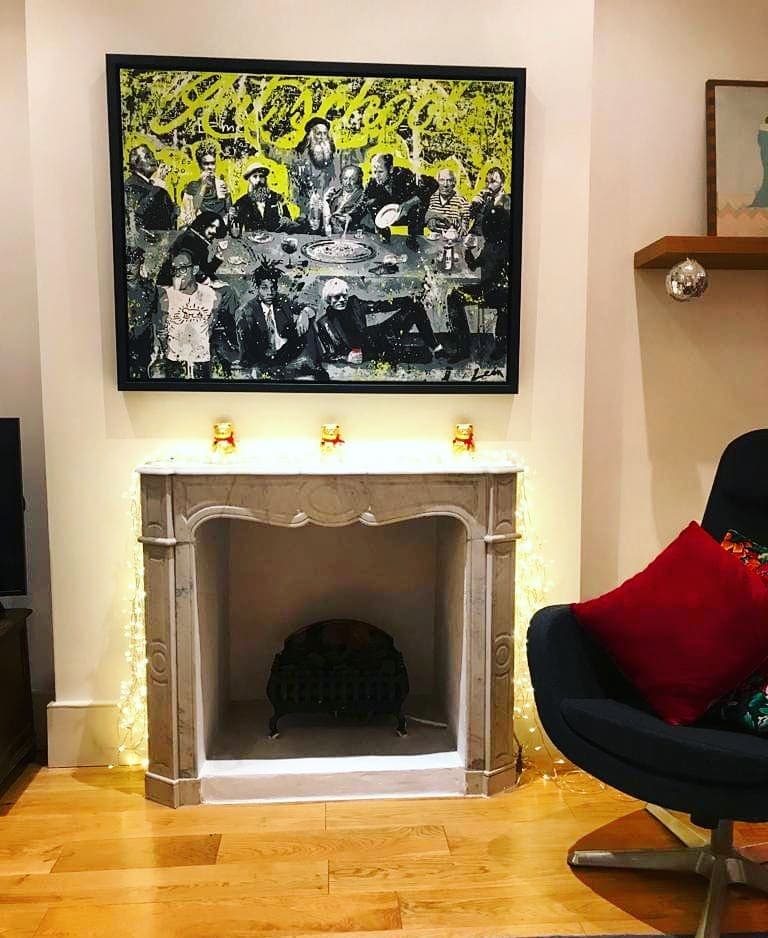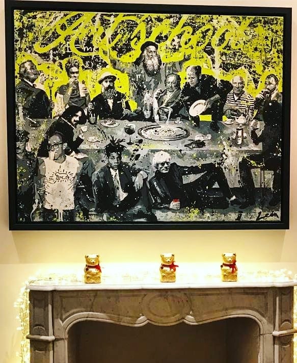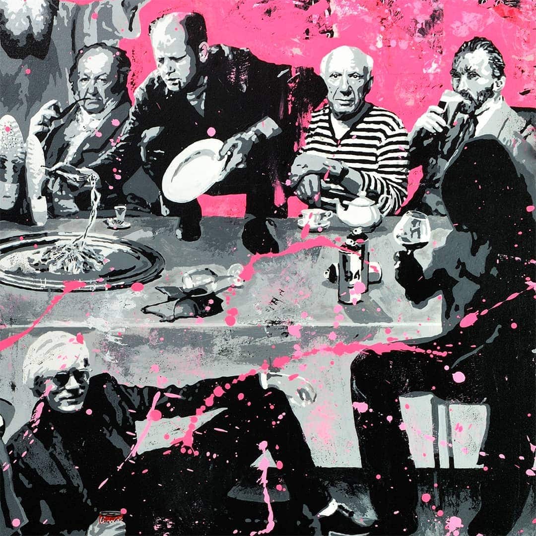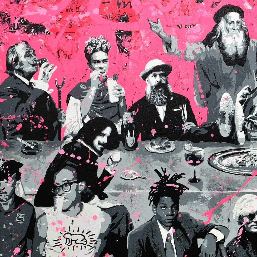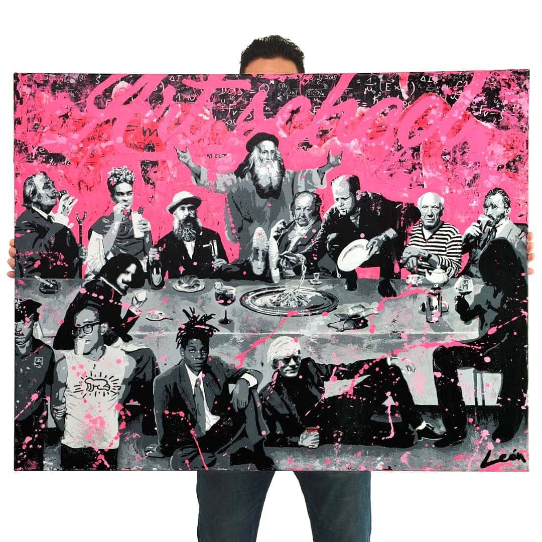 In this unique version of The Last Supper, Alberto León brings together his major artistic influences in a vibrant and chaotic scene, reimagining the iconic table with names like Dalí, Velázquez, Frida Kahlo, Monet, Goya, Picasso, Pollock, Van Gogh, Banksy, Warhol, Basquiat, Keith Haring, and, of course, Leonardo da Vinci presiding in the center.