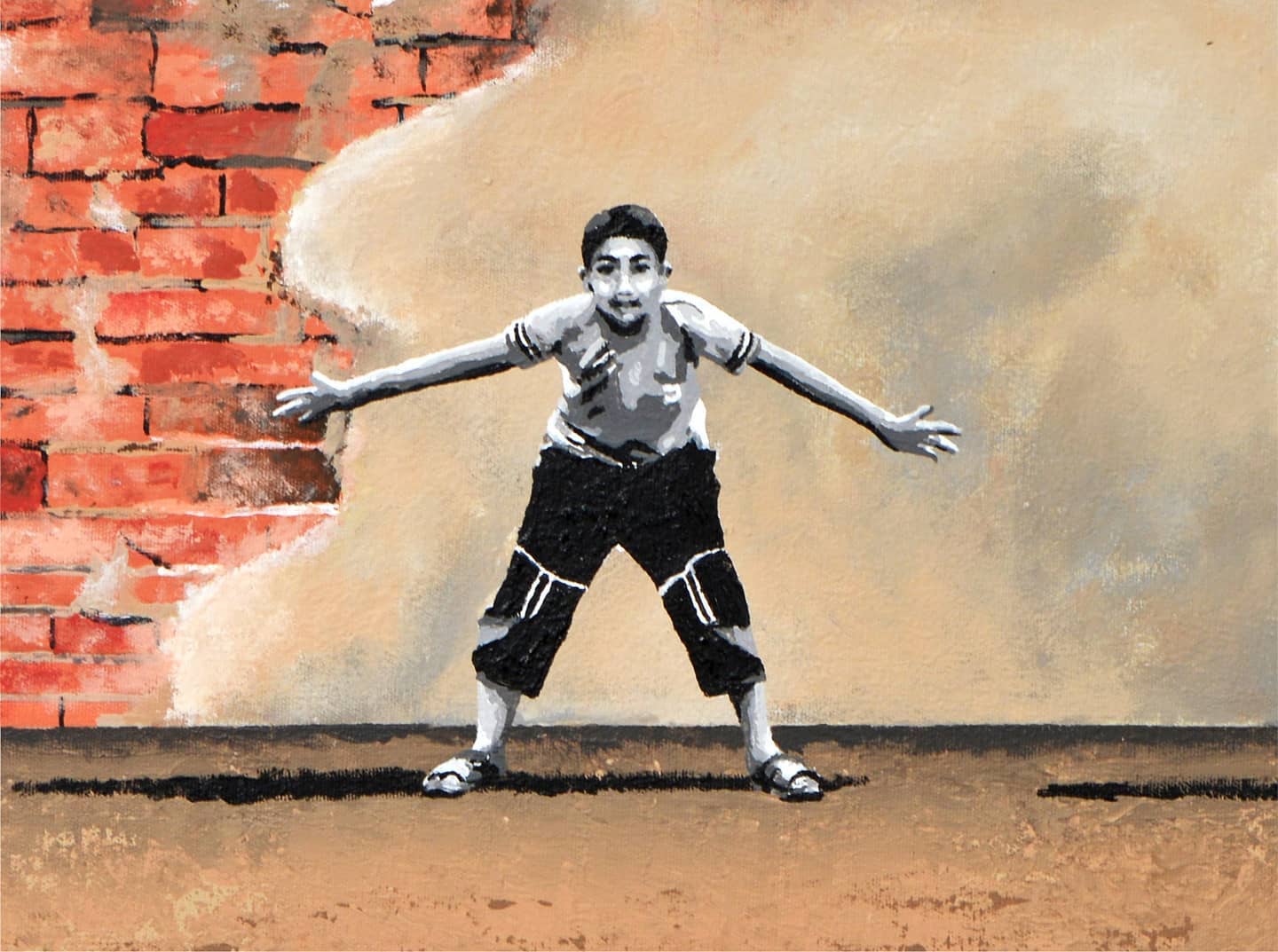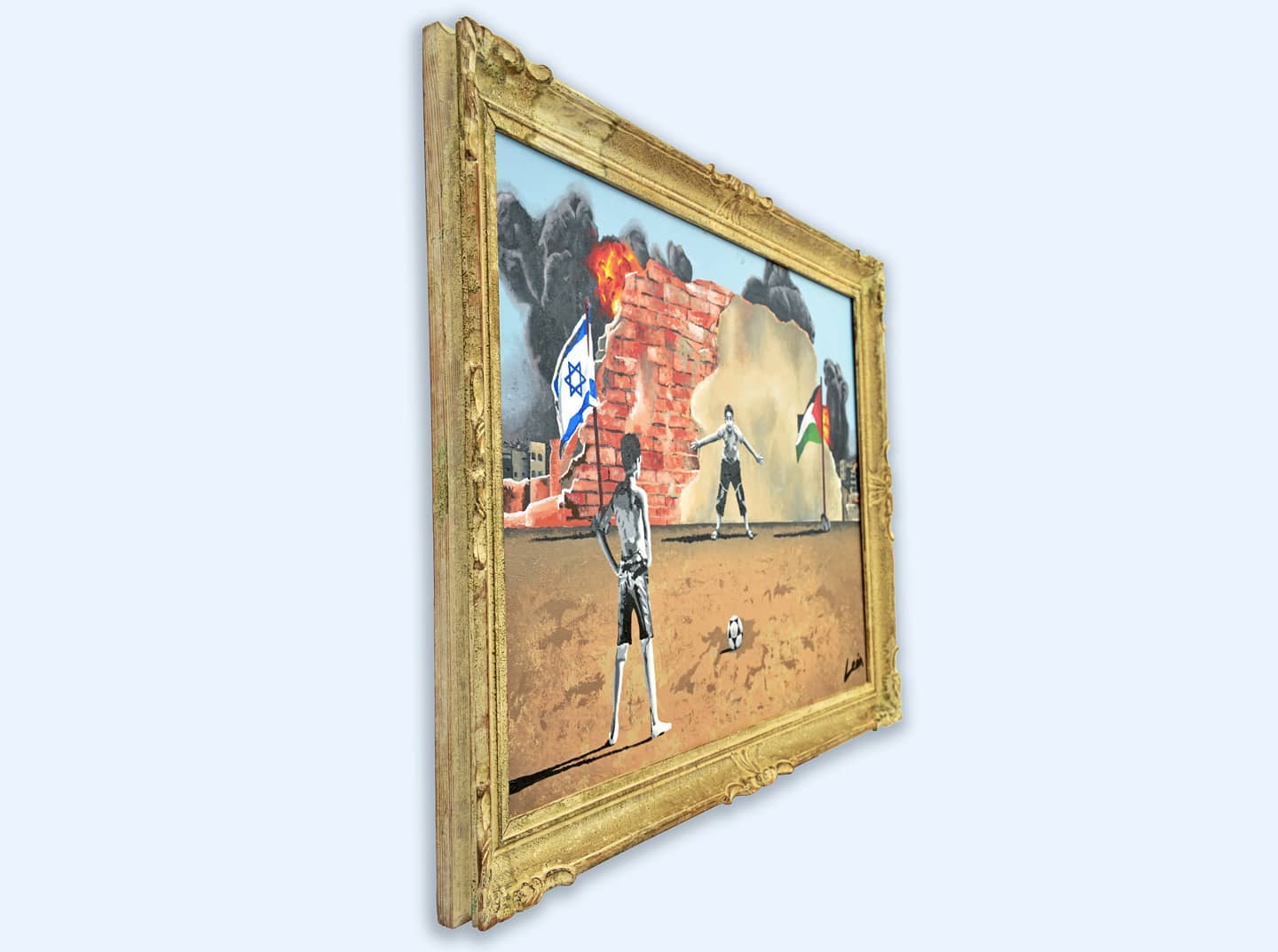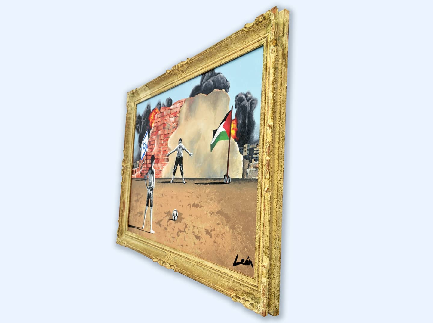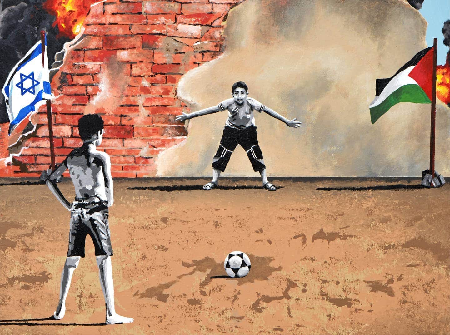 “The Penalty Kick” shows an Israeli boy kicking a penalty in front of a Palestinian goalkeeper, conveying a message of coexistence and peace in a context of conflict.