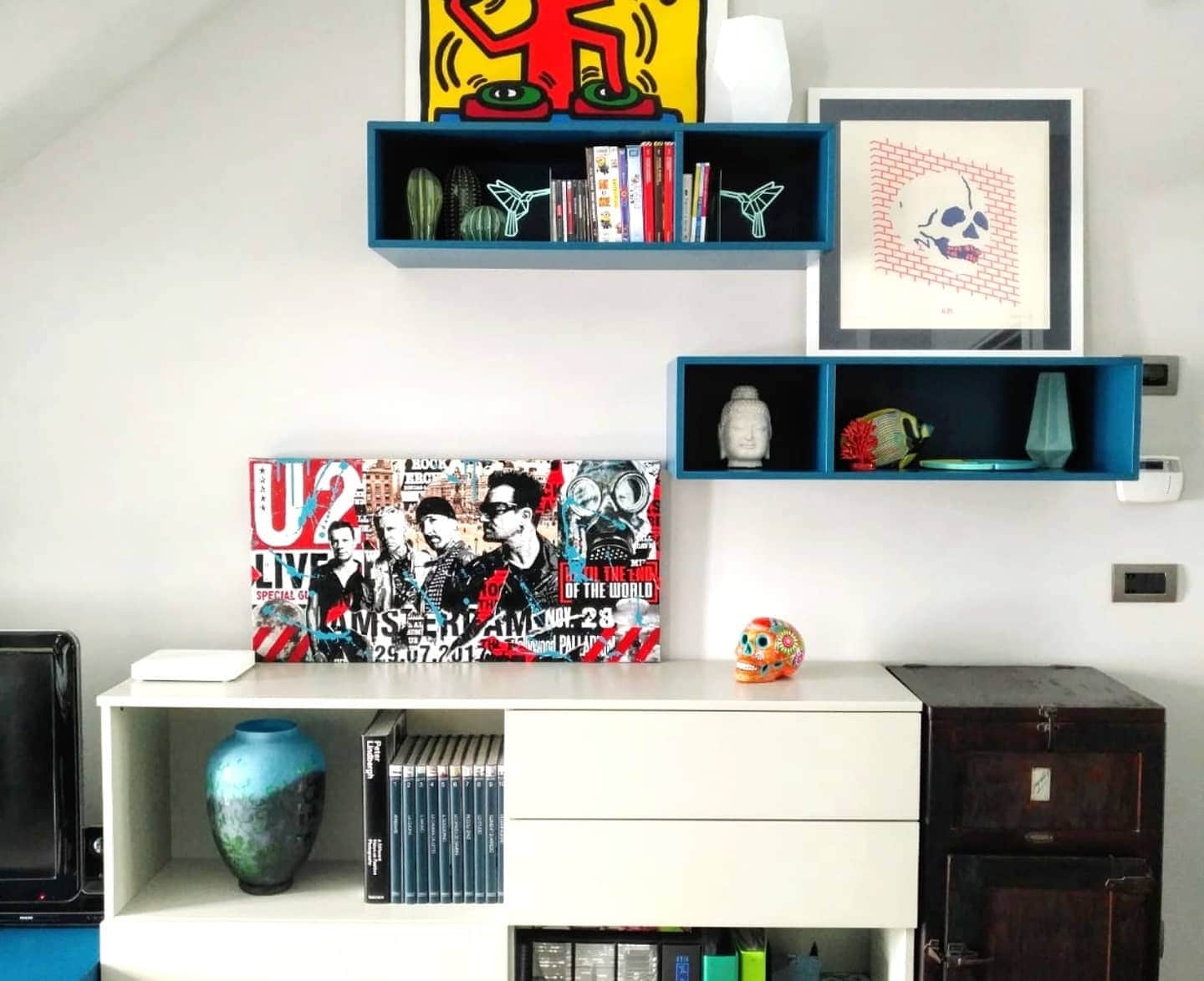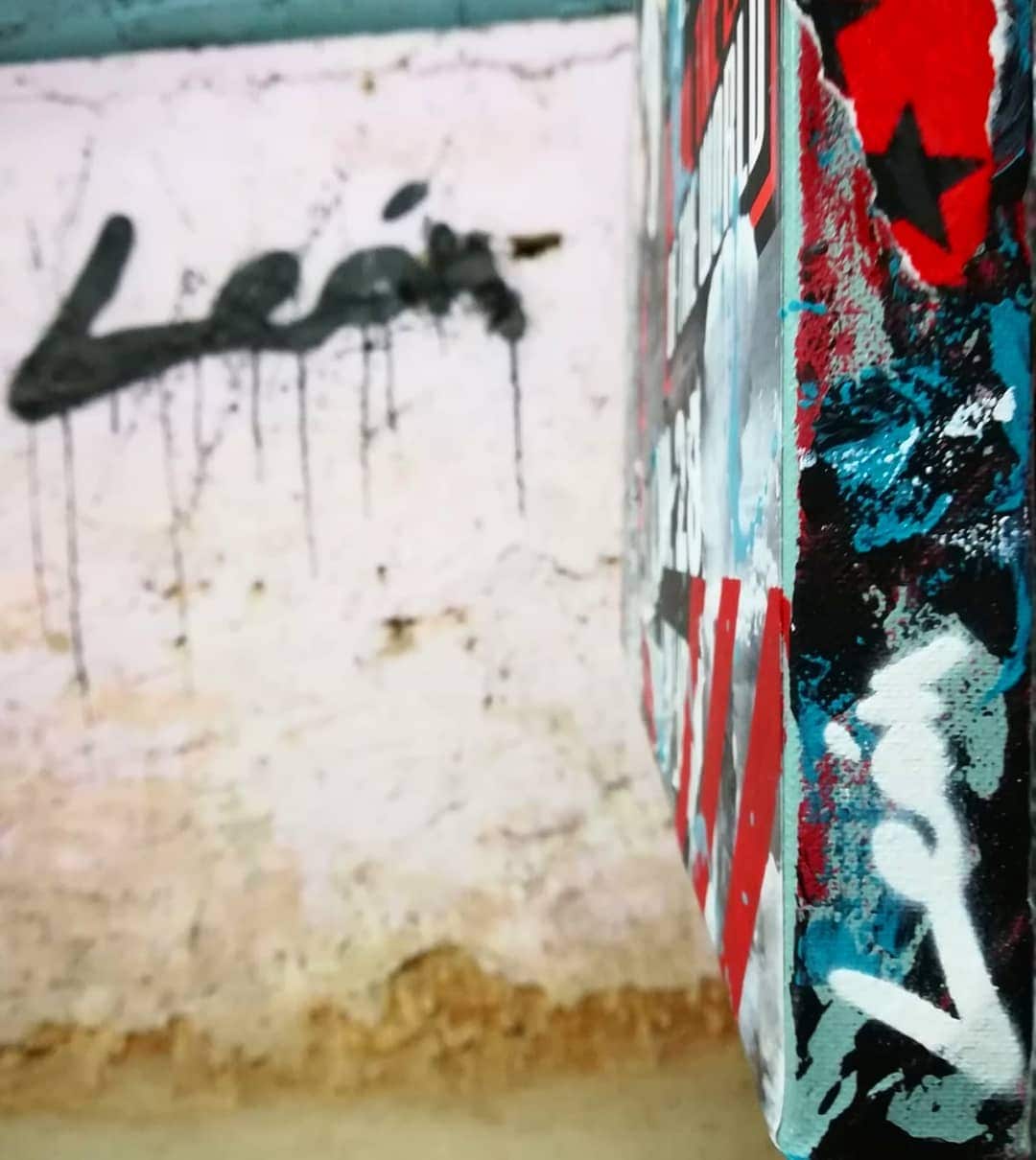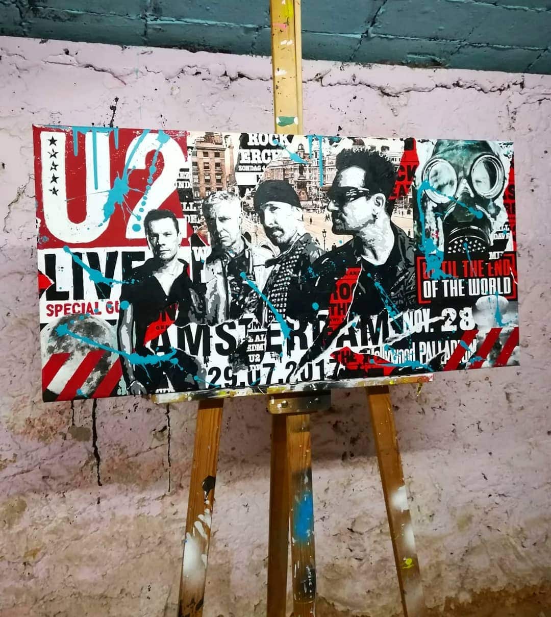 This horizontal canvas by Alberto León portrays the band U2 in a scene full of visual tension. In a palette dominated by whites, blacks, and an intense red, the unexpected presence of a man in a gas mask bursts into the image, providing a provocative and critical tone. The work, far from being a simple tribute, mixes the language of rock with a disturbing atmosphere, where the iconic becomes uncomfortable and transgressive.