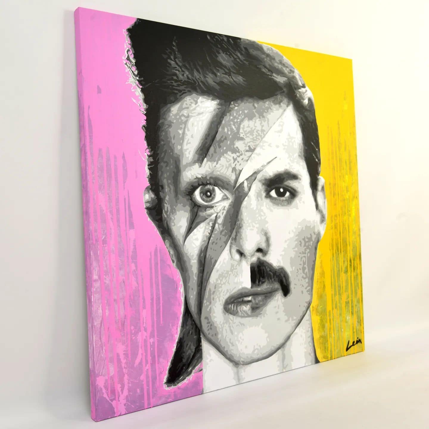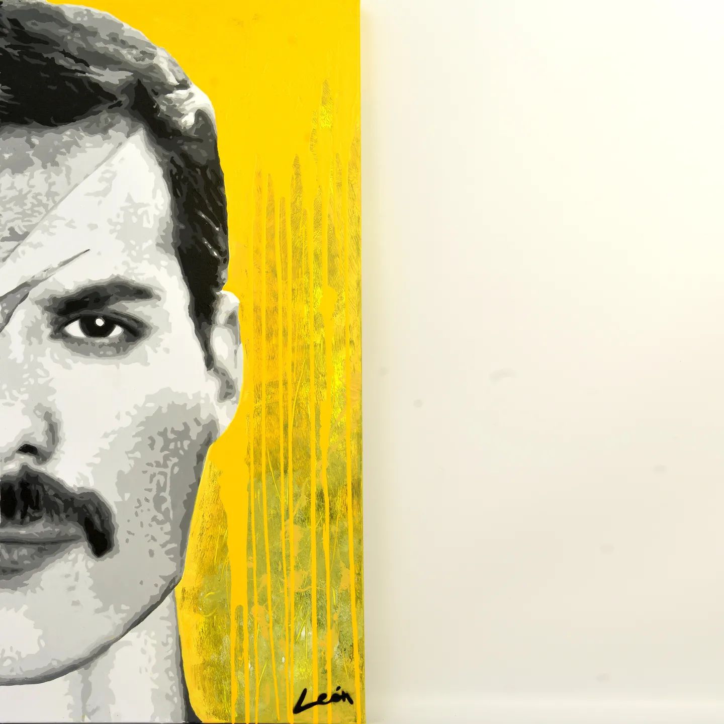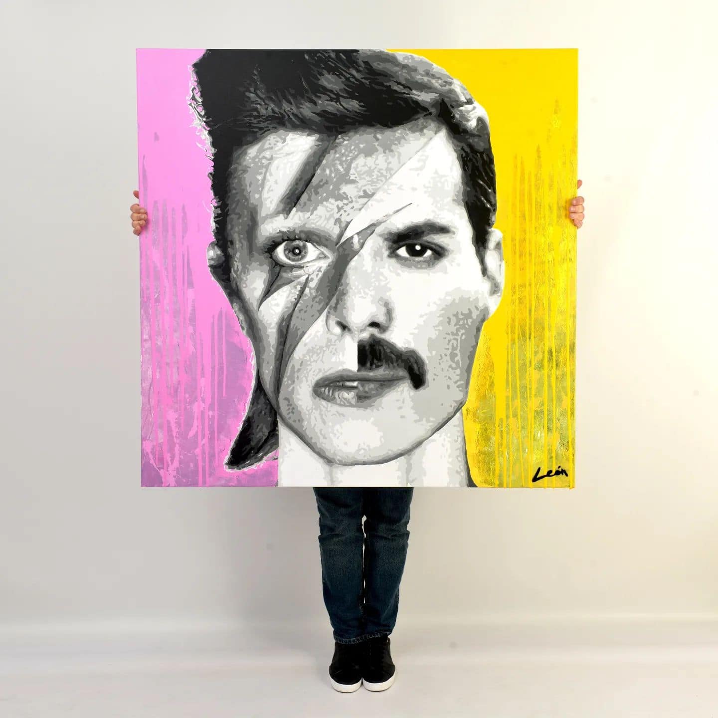 In Under Pressure, Alberto León merges the faces of David Bowie and Freddie Mercury into one, creating a striking image that symbolizes the artistic and emotional union of two musical icons. The contrast between the two profiles highlights their stylistic differences, but the symmetry of the whole conveys harmony and shared strength. The title reinforces the symbolic weight: pressure, duality, and genius converge on a single canvas.