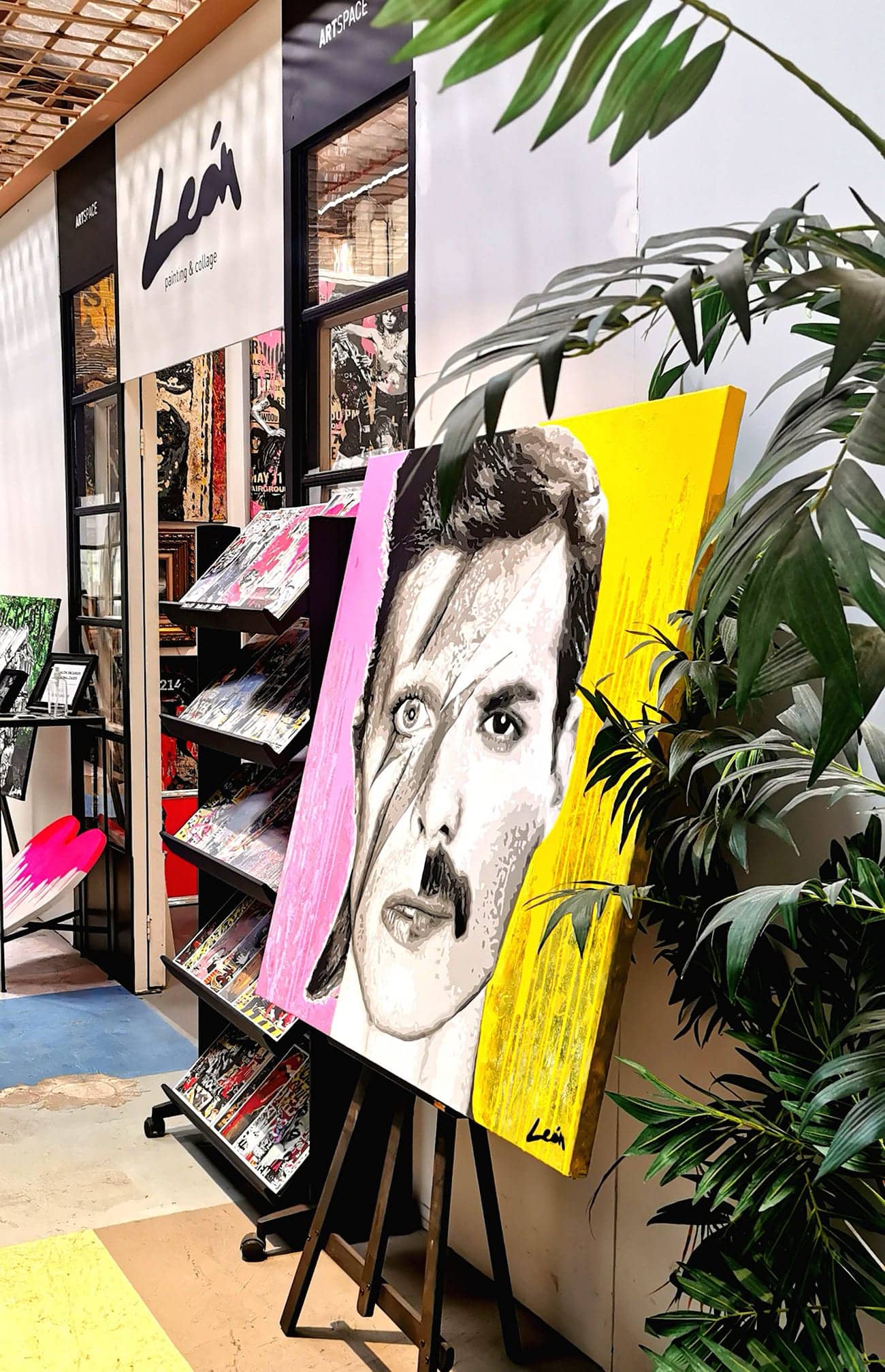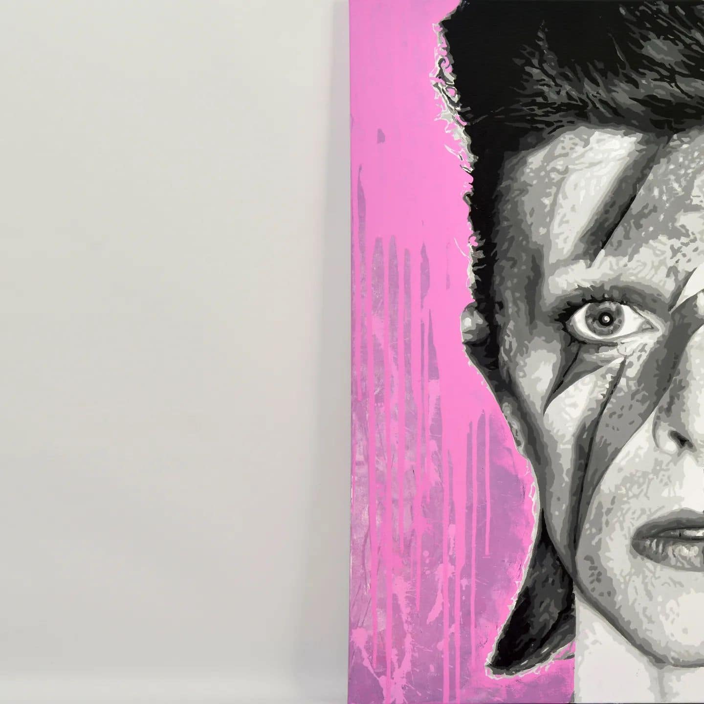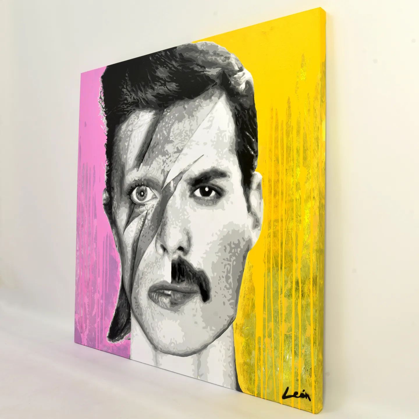 In Under Pressure, Alberto León merges the faces of David Bowie and Freddie Mercury into one, creating a striking image that symbolizes the artistic and emotional union of two musical icons. The contrast between the two profiles highlights their stylistic differences, but the symmetry of the whole conveys harmony and shared strength. The title reinforces the symbolic weight: pressure, duality, and genius converge on a single canvas.