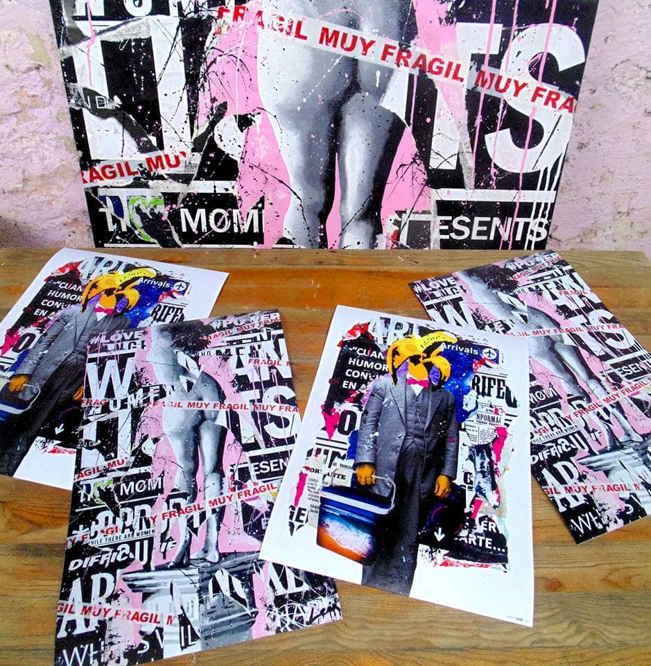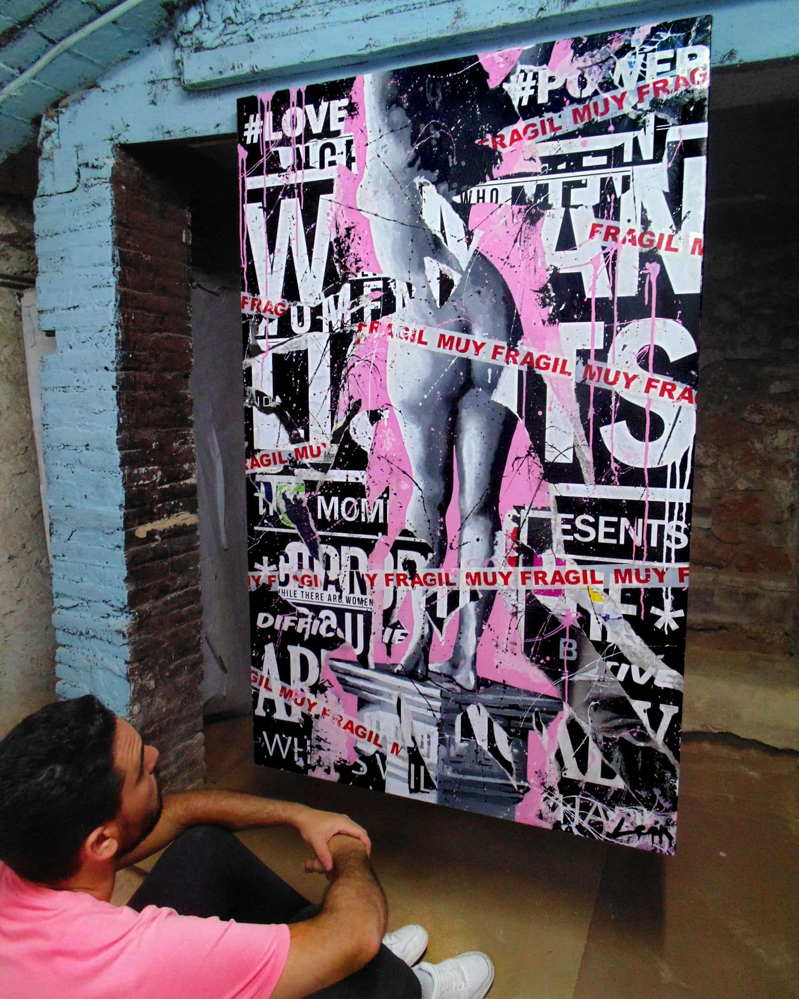 On a pedestal, a female figure with her back turned becomes the absolute center of the scene. Her silhouette, elegant and firm, contrasts with the delicacy of a ribbon that wraps around her body and carries a clear word: fragile. But far from speaking of weakness, the term is redefined, as a poetic alert to everything that deserves to be protected. The background, a collage of neutral tones between black and white, is softened by a soft pink atmosphere that envelops the work in an emotional calm. The woman is not only represented, she is elevated: she is a symbol, she is a message, she is body, and she is a statement.