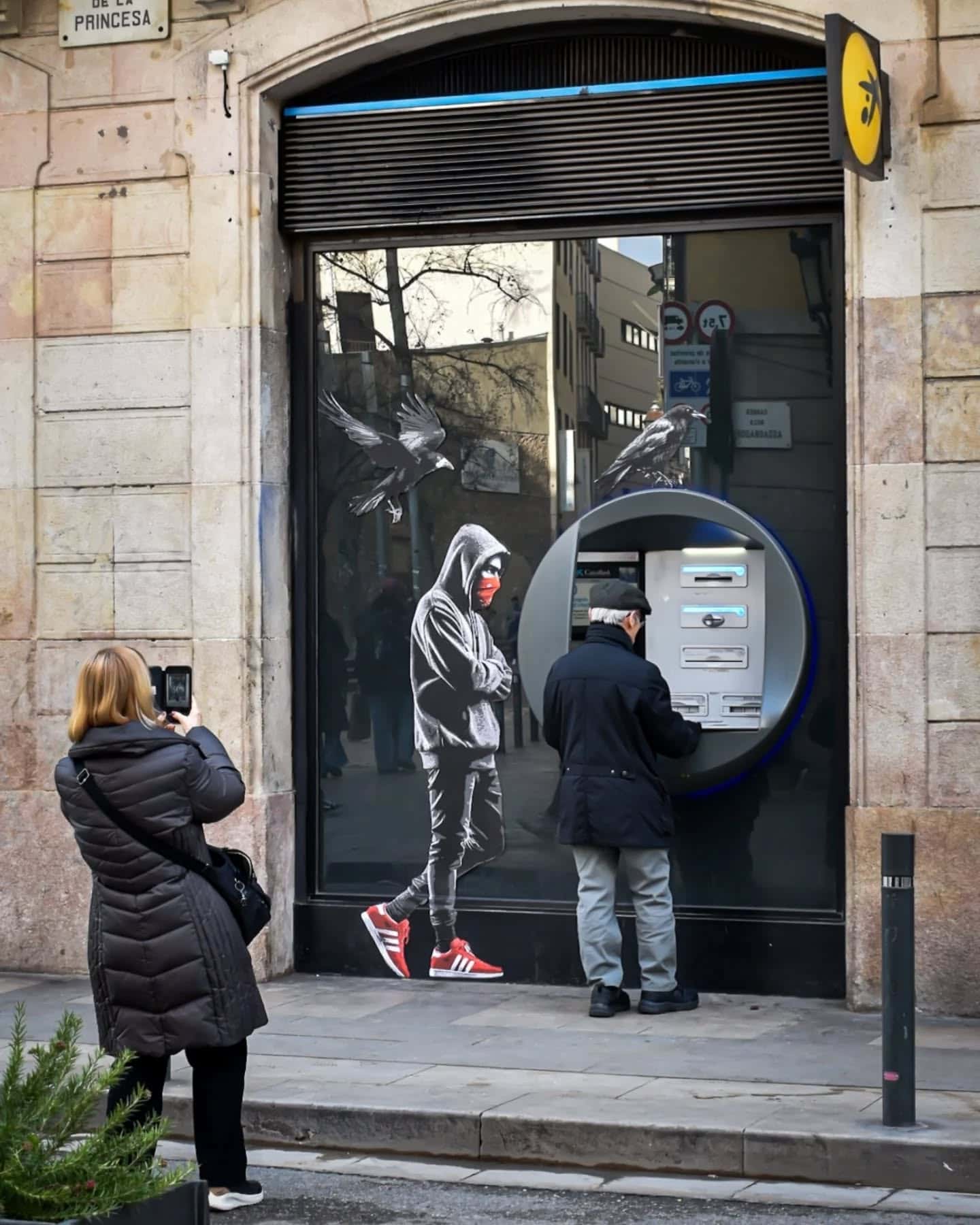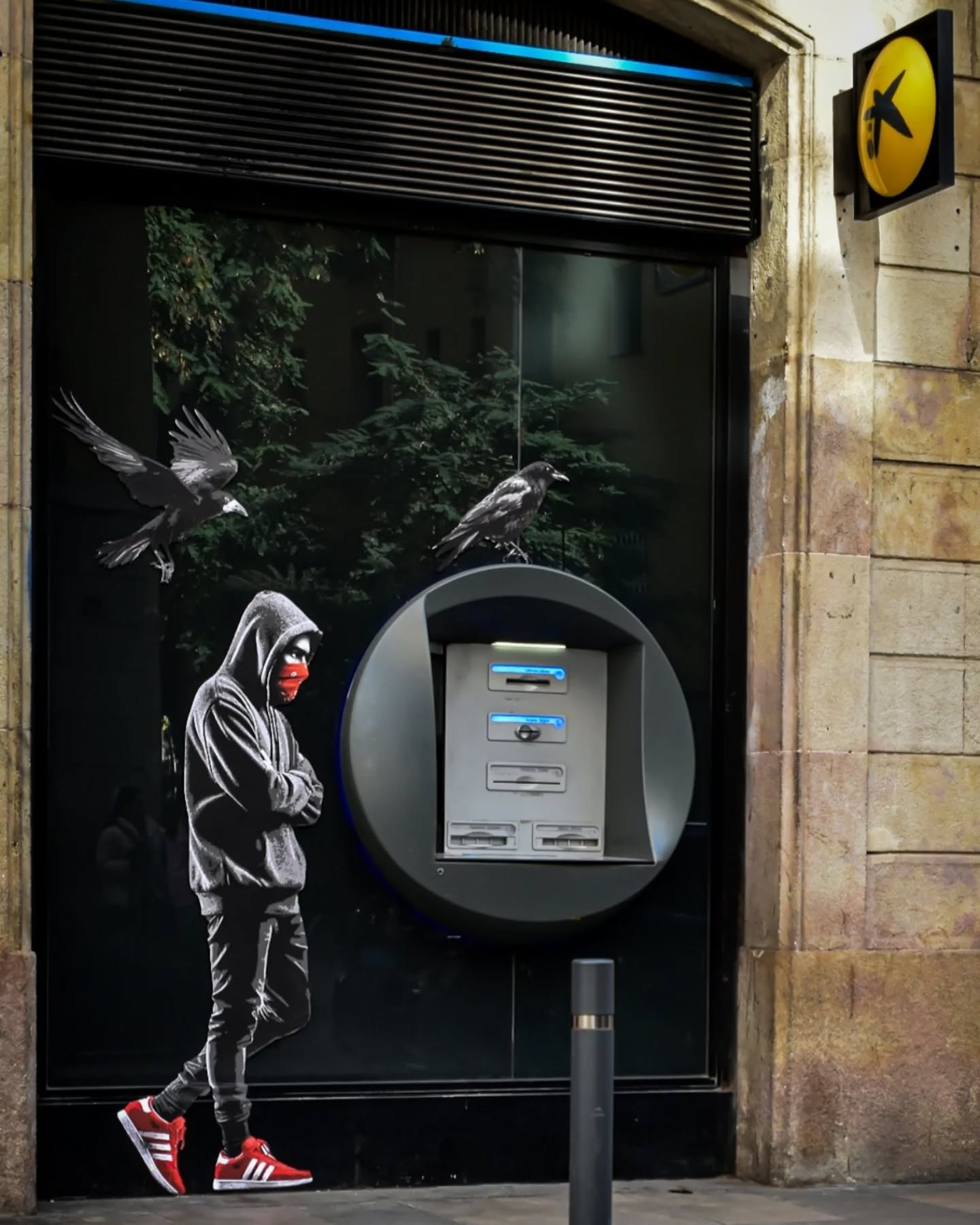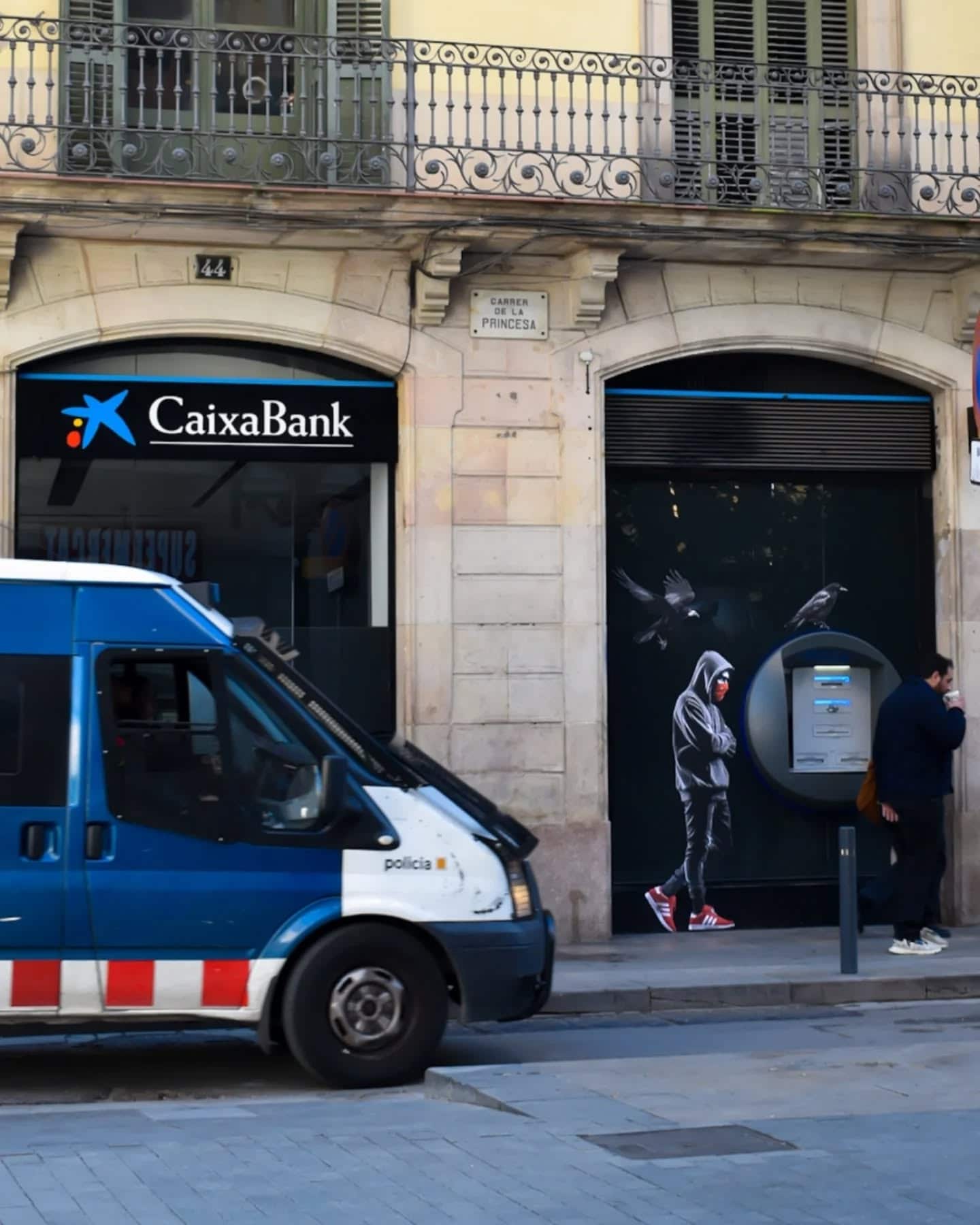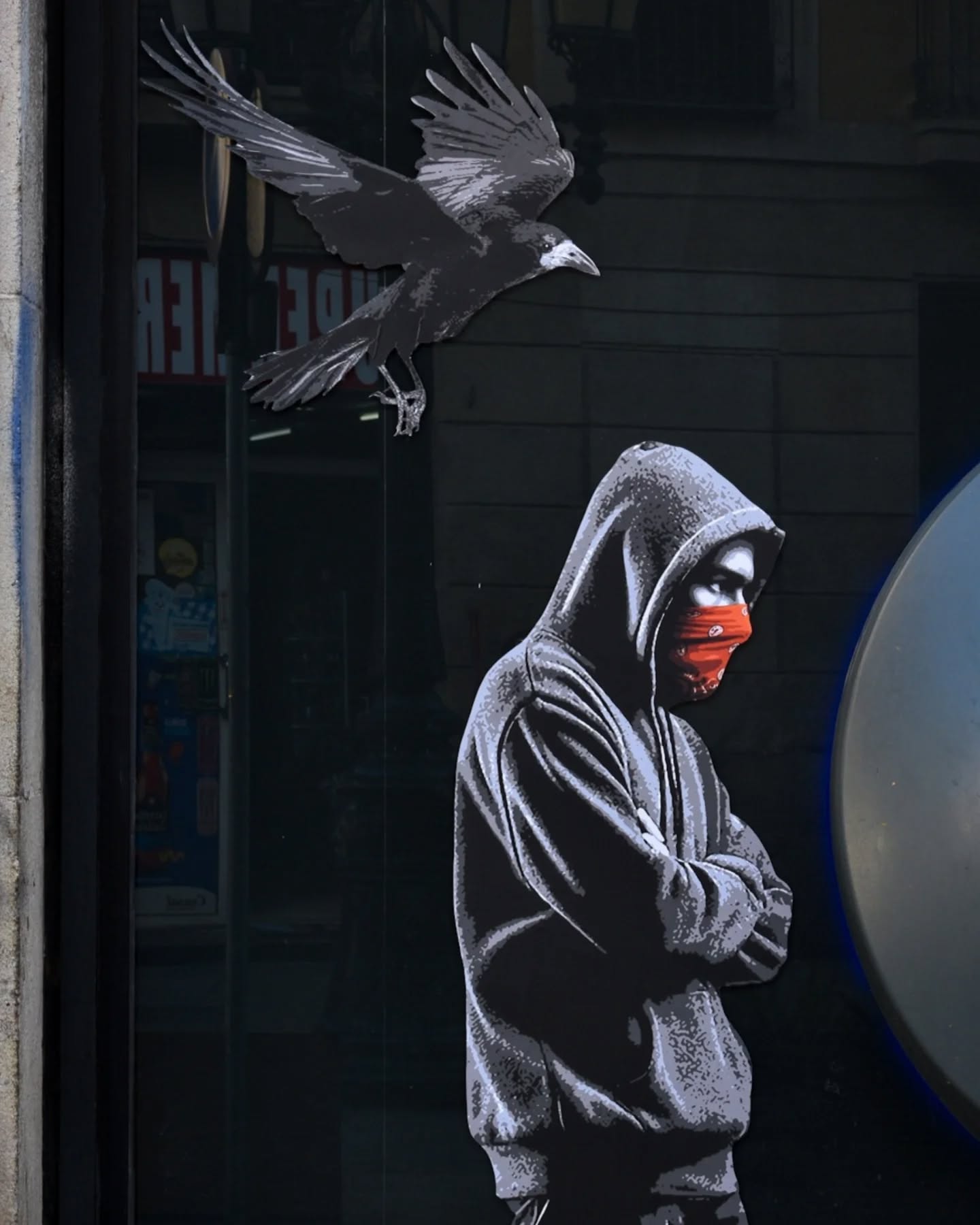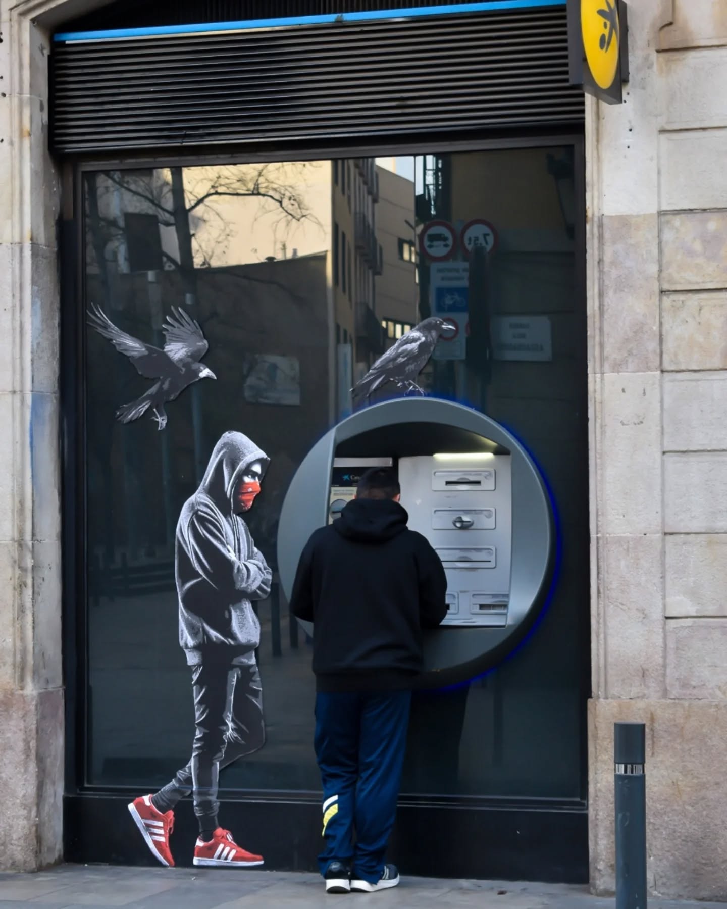 Contraste entre la belleza de Barcelona y la amenaza persistente, marcada por la delincuencia y la inseguridad. La postura relajada del delincuente, casi despreocupada, simboliza la normalización de estas situaciones en la vida diaria de la ciudad. Dos cuervos negros sobrevuelan la escena, símbolos tradicionales de mal augurio y peligro.