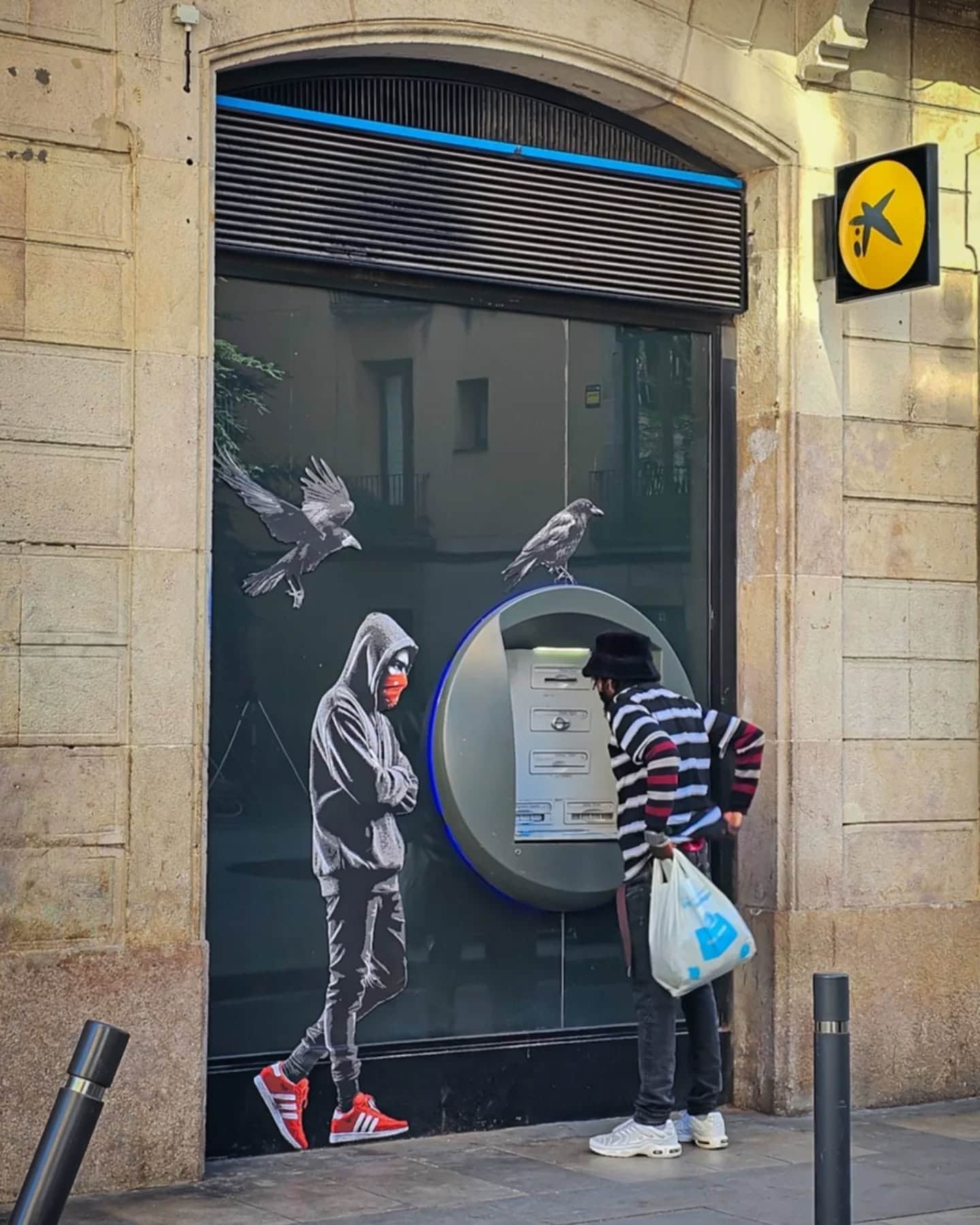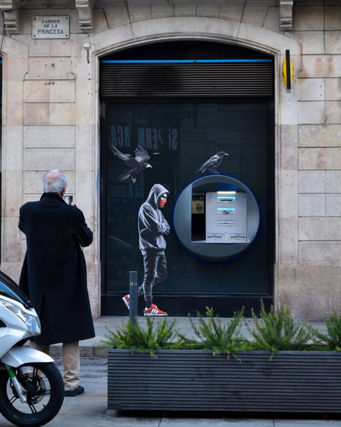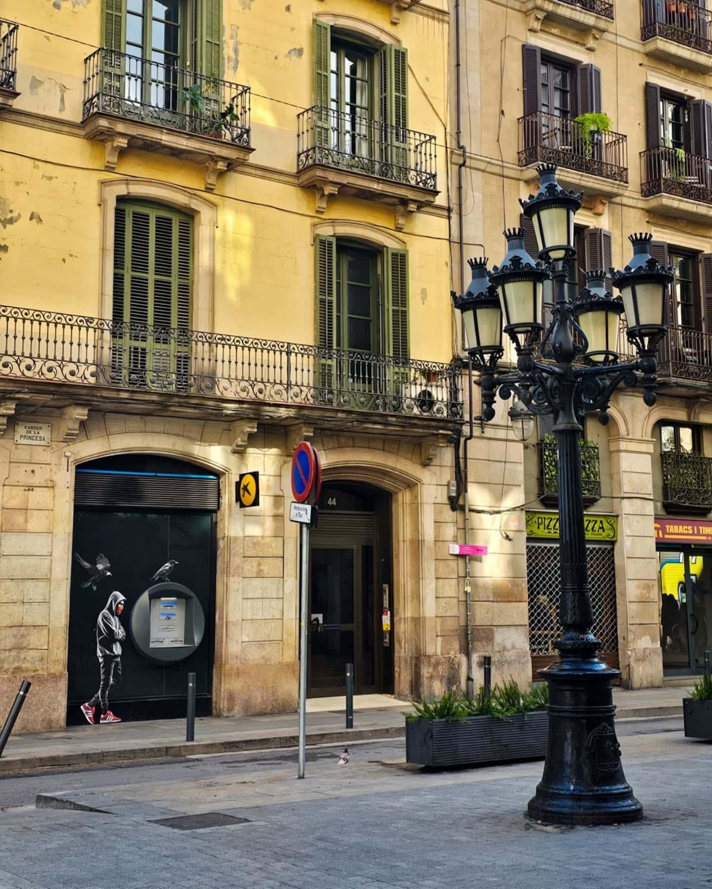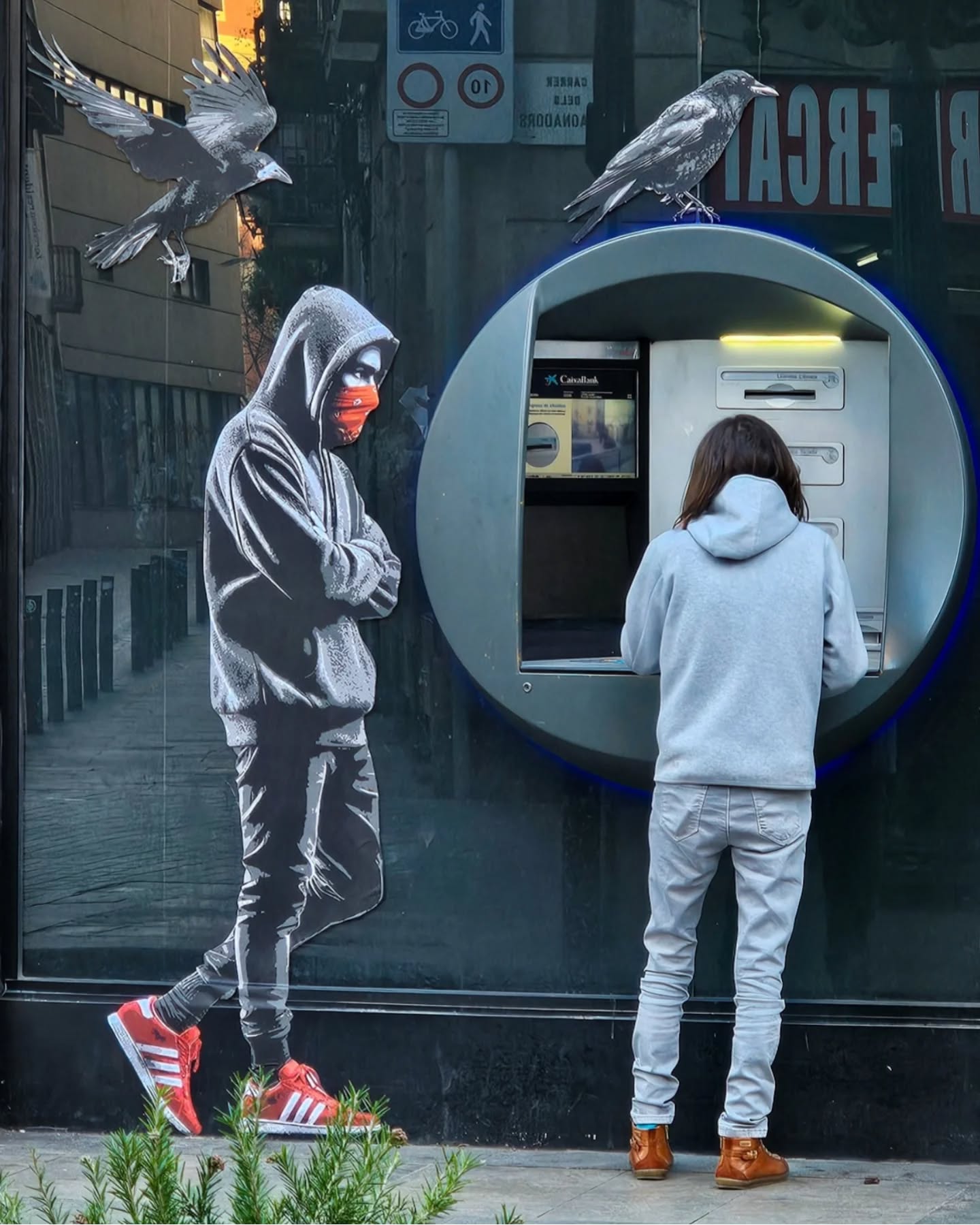 Contraste entre la belleza de Barcelona y la amenaza persistente, marcada por la delincuencia y la inseguridad. La postura relajada del delincuente, casi despreocupada, simboliza la normalización de estas situaciones en la vida diaria de la ciudad. Dos cuervos negros sobrevuelan la escena, símbolos tradicionales de mal augurio y peligro.