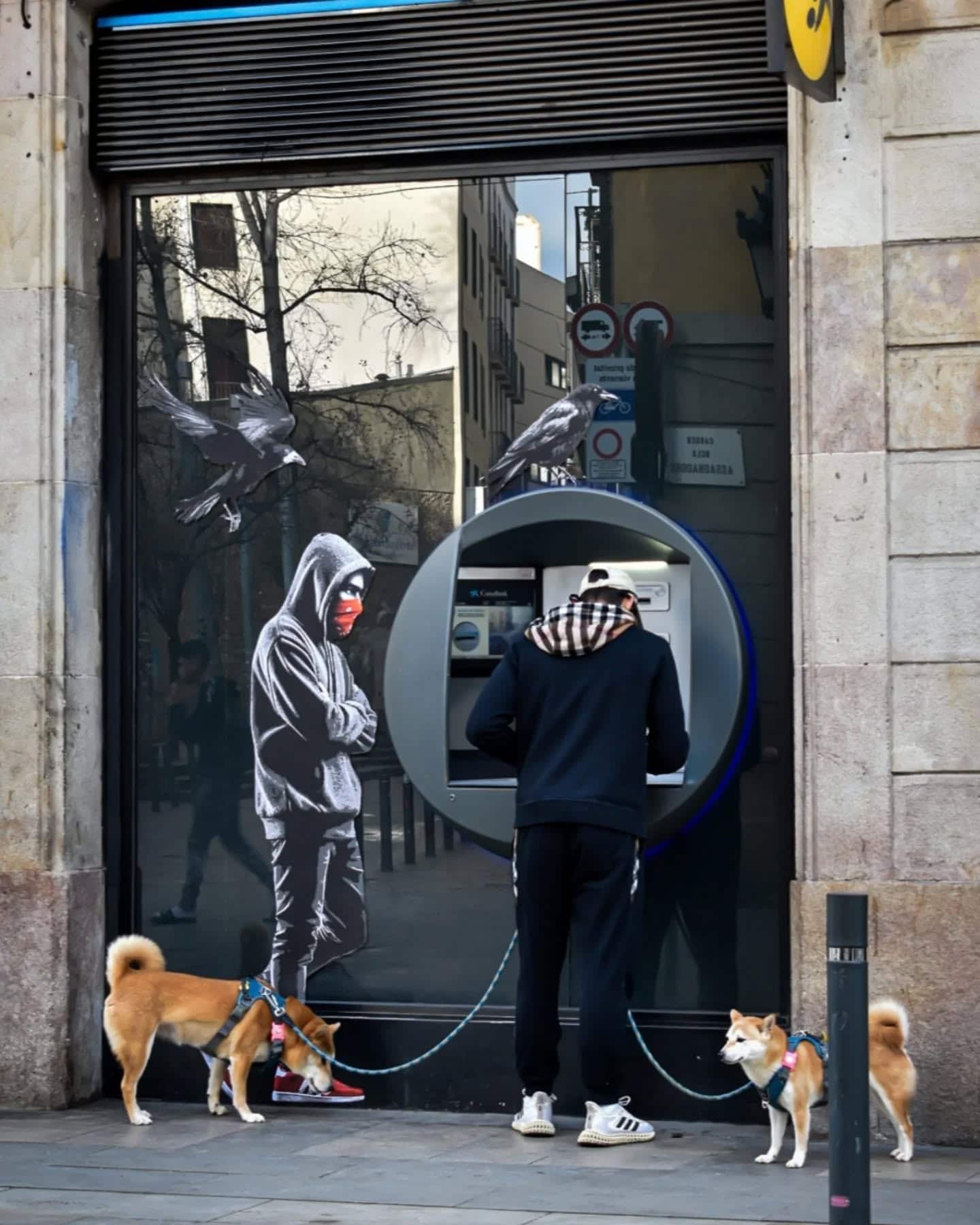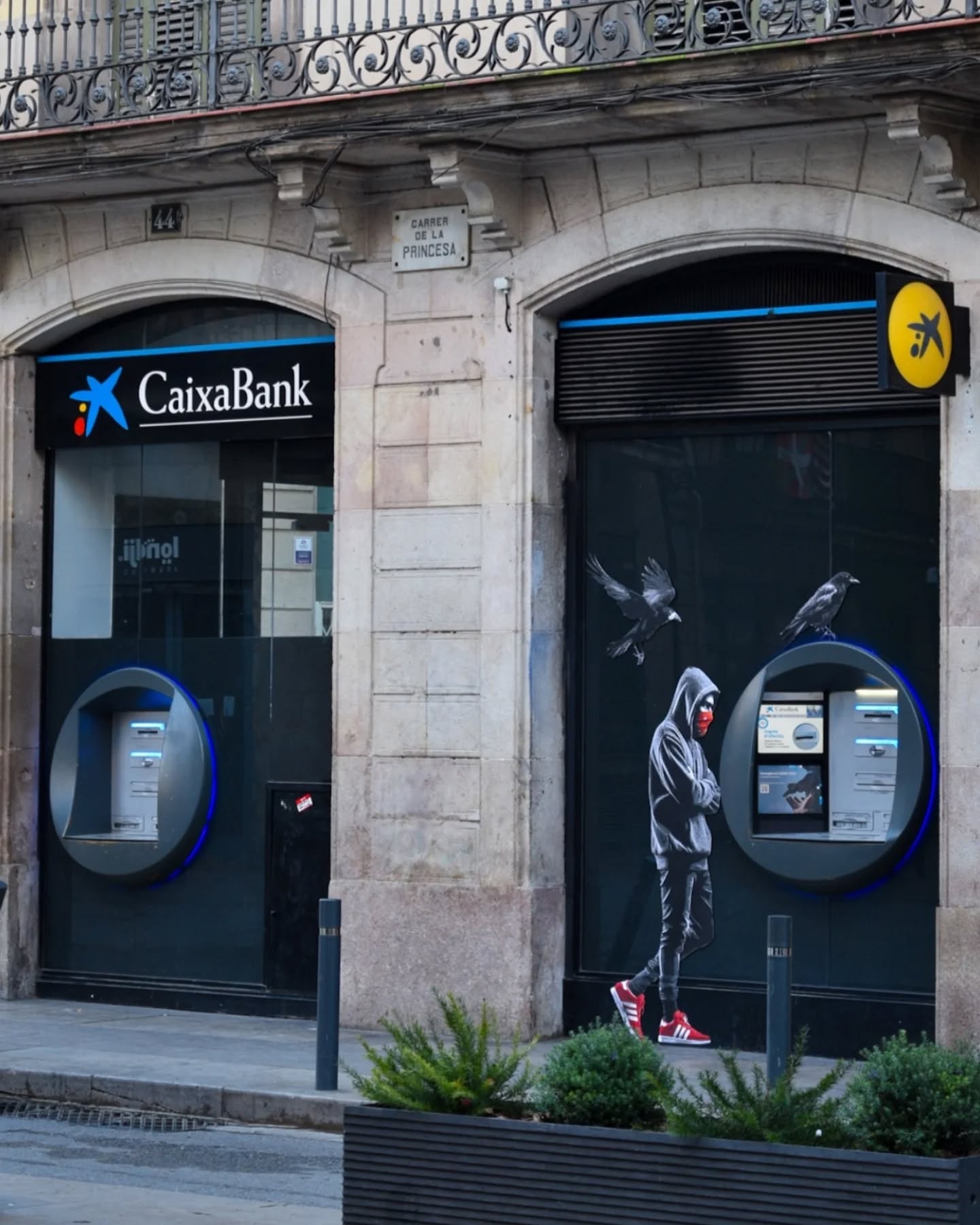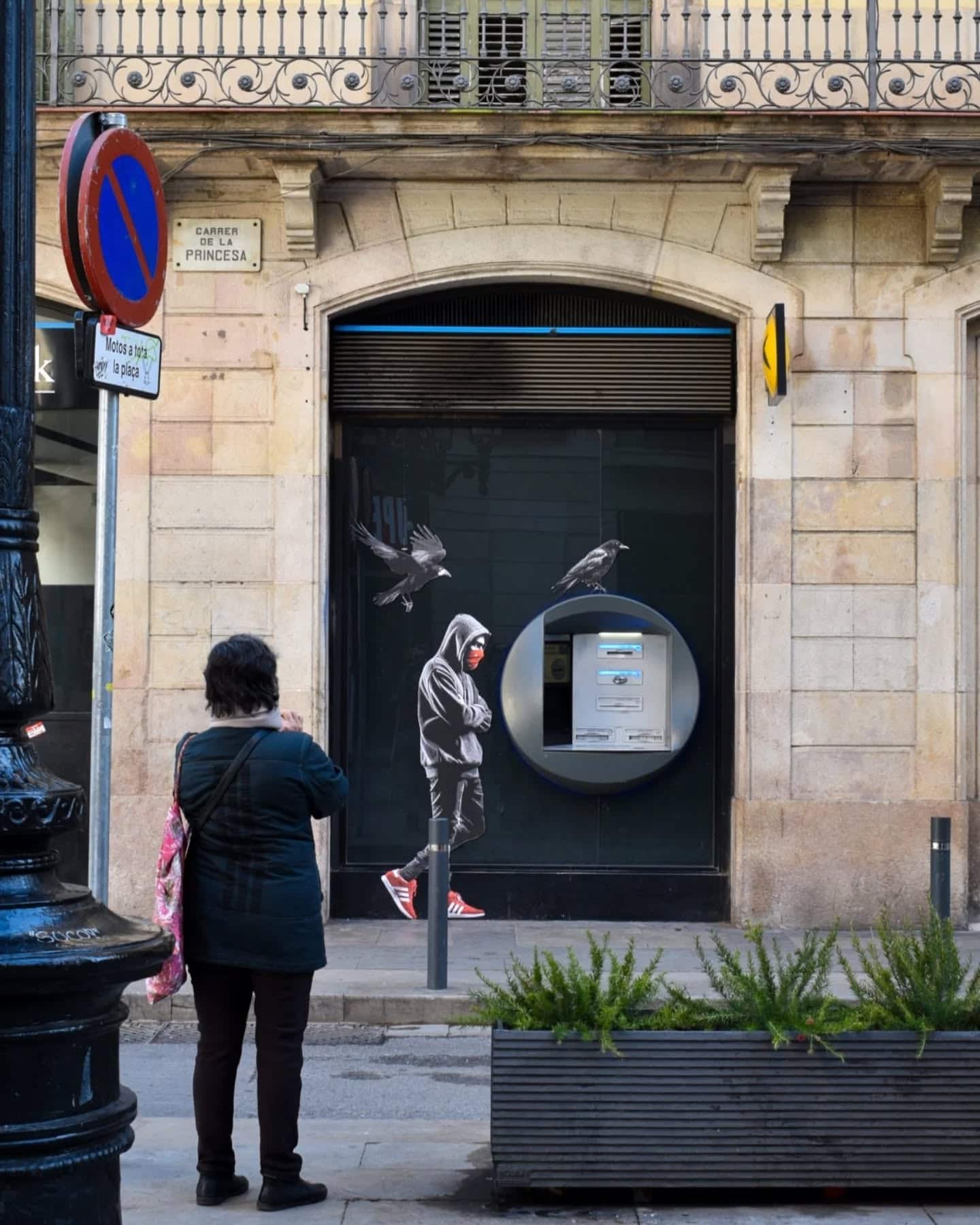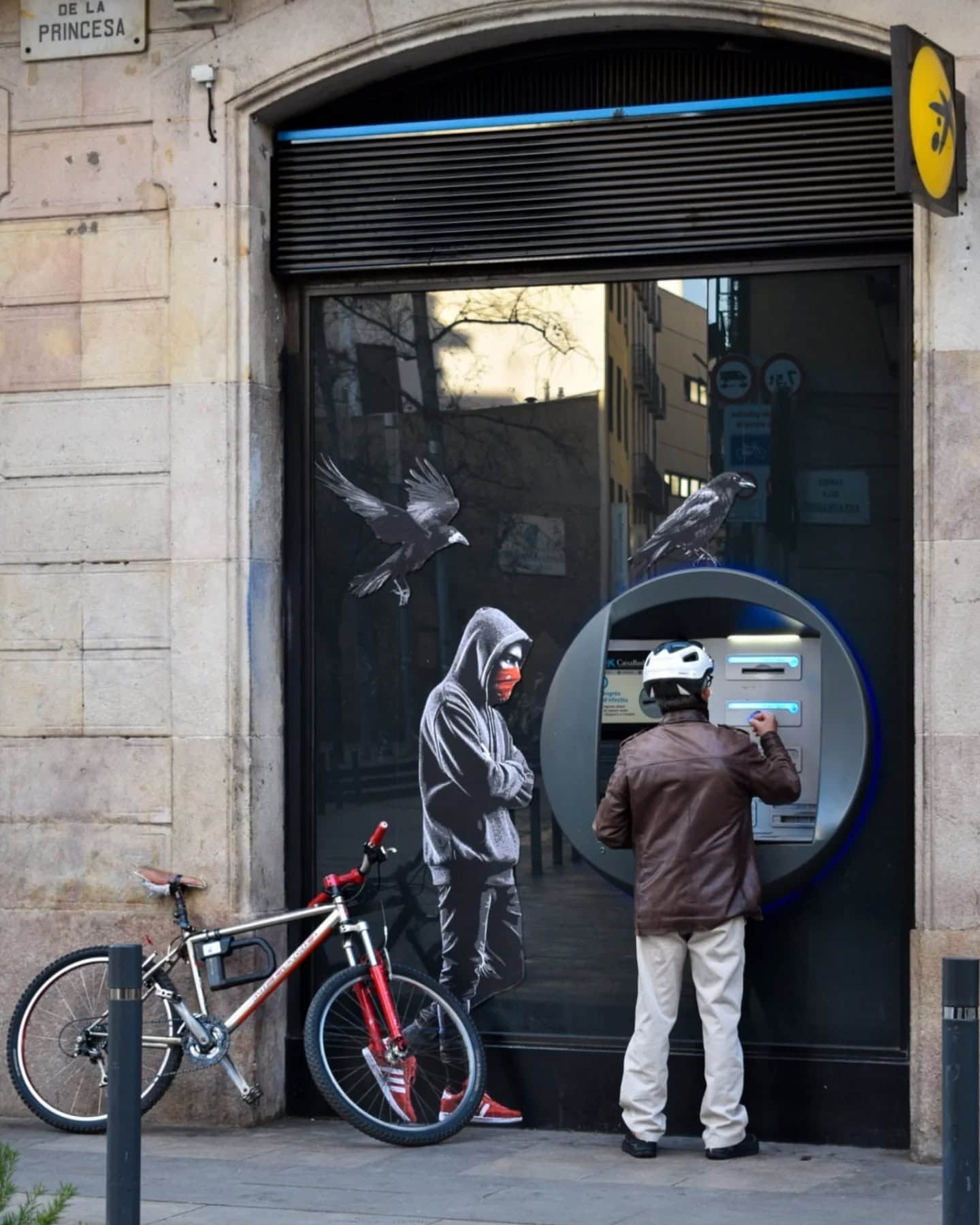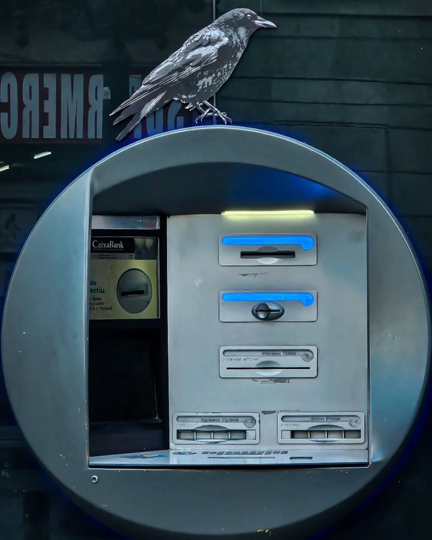 Contraste entre la belleza de Barcelona y la amenaza persistente, marcada por la delincuencia y la inseguridad. La postura relajada del delincuente, casi despreocupada, simboliza la normalización de estas situaciones en la vida diaria de la ciudad. Dos cuervos negros sobrevuelan la escena, símbolos tradicionales de mal augurio y peligro.