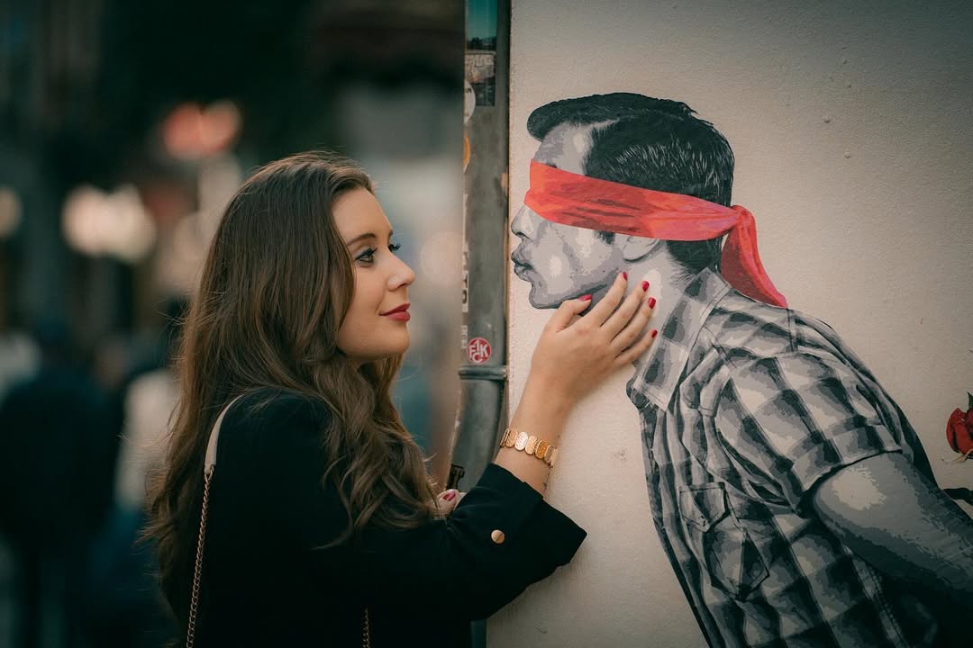 La venda roja representa el amor ciego, no importa el tipo de persona que se coloque en el muro, es una mirada hacia el alma, enfocarse más profundamente en lo excitante y divertido que puede ser un beso a ciegas y disfrutar el placer del momento.