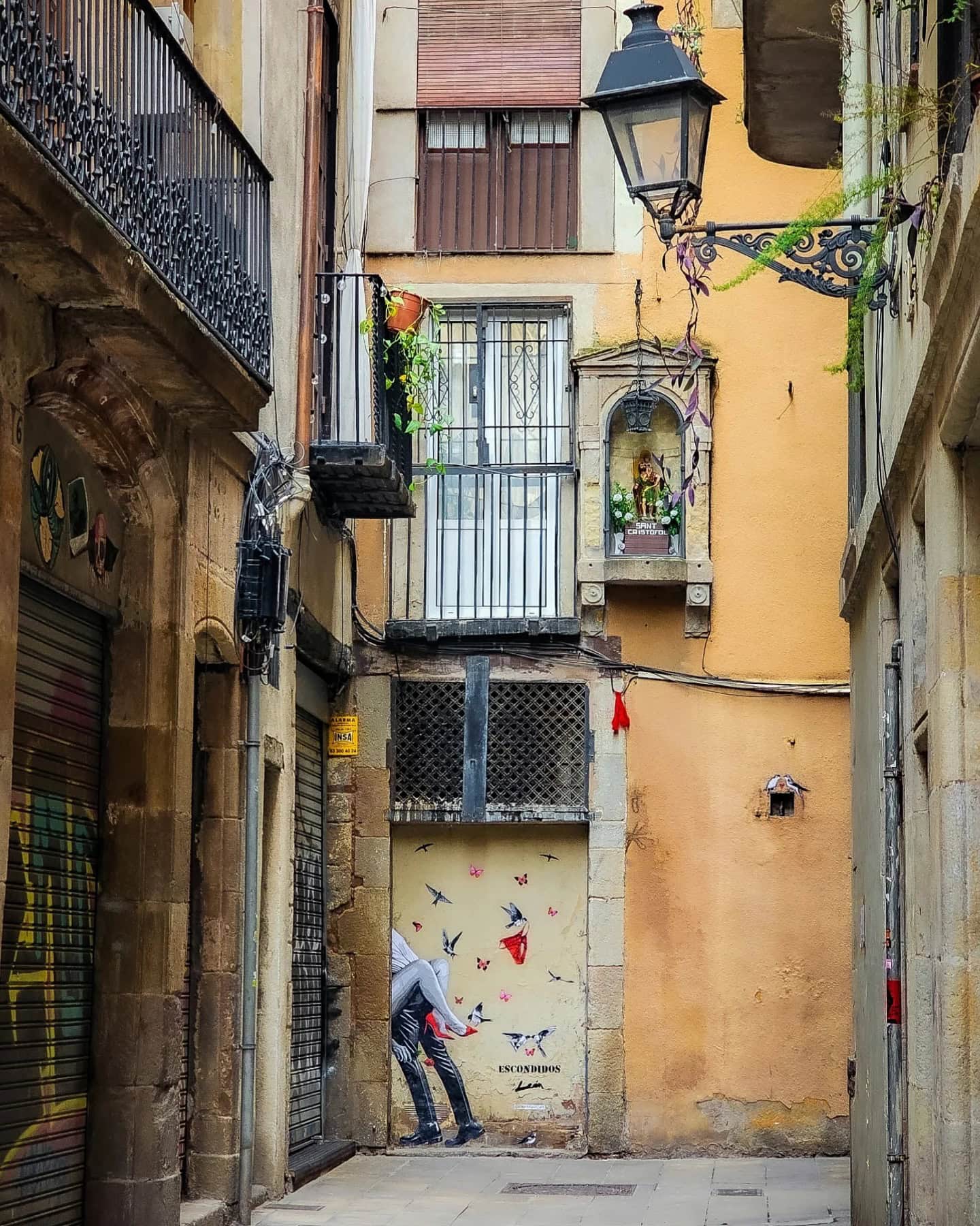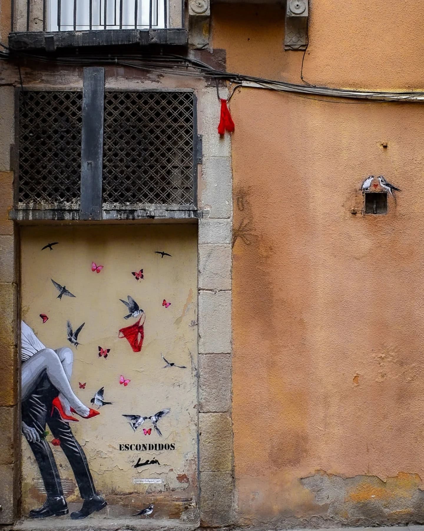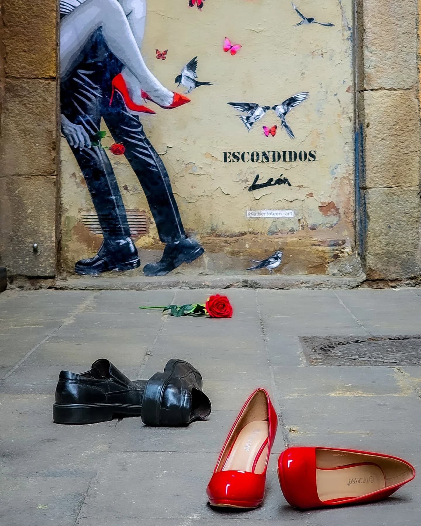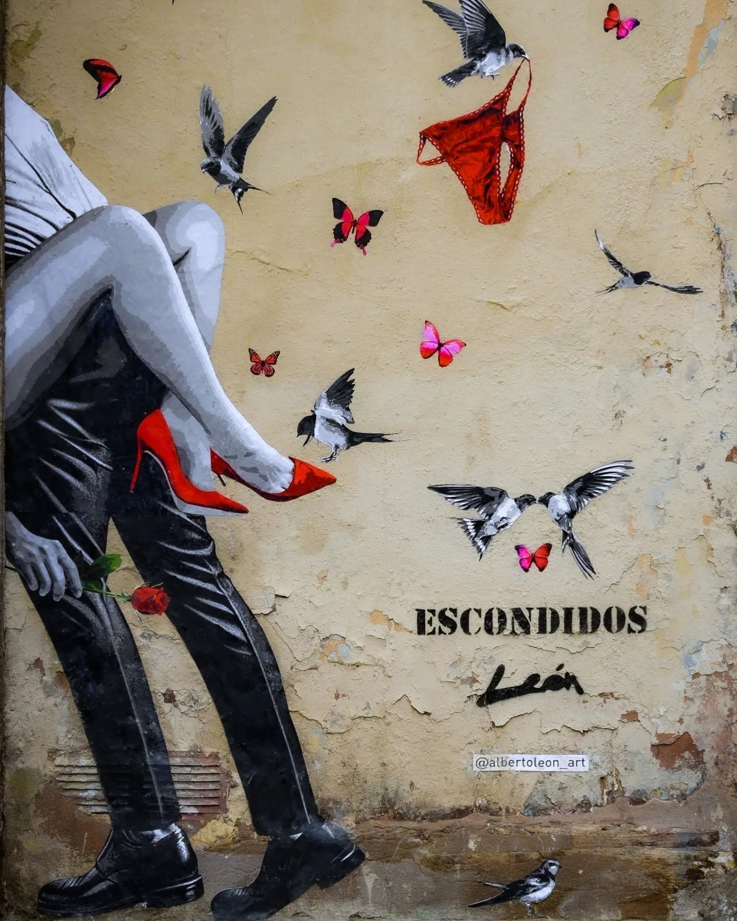 En Escondidos, Alberto León recurre a la sugerencia para construir una escena cargada de erotismo y simbolismo sin mostrar nada de forma explícita. Se ven las piernas abiertas de una mujer con tacones rojos y un hombre entre ellas, insinuando un acto sexual. No hay cuerpos completos, solo fragmentos, gestos y símbolos que invitan a la imaginación. Un tanga flota en el aire, sostenido por un pájaro, mientras varias golondrinas vuelan entre mariposas rojas que parecen surgir de la intensidad del momento.