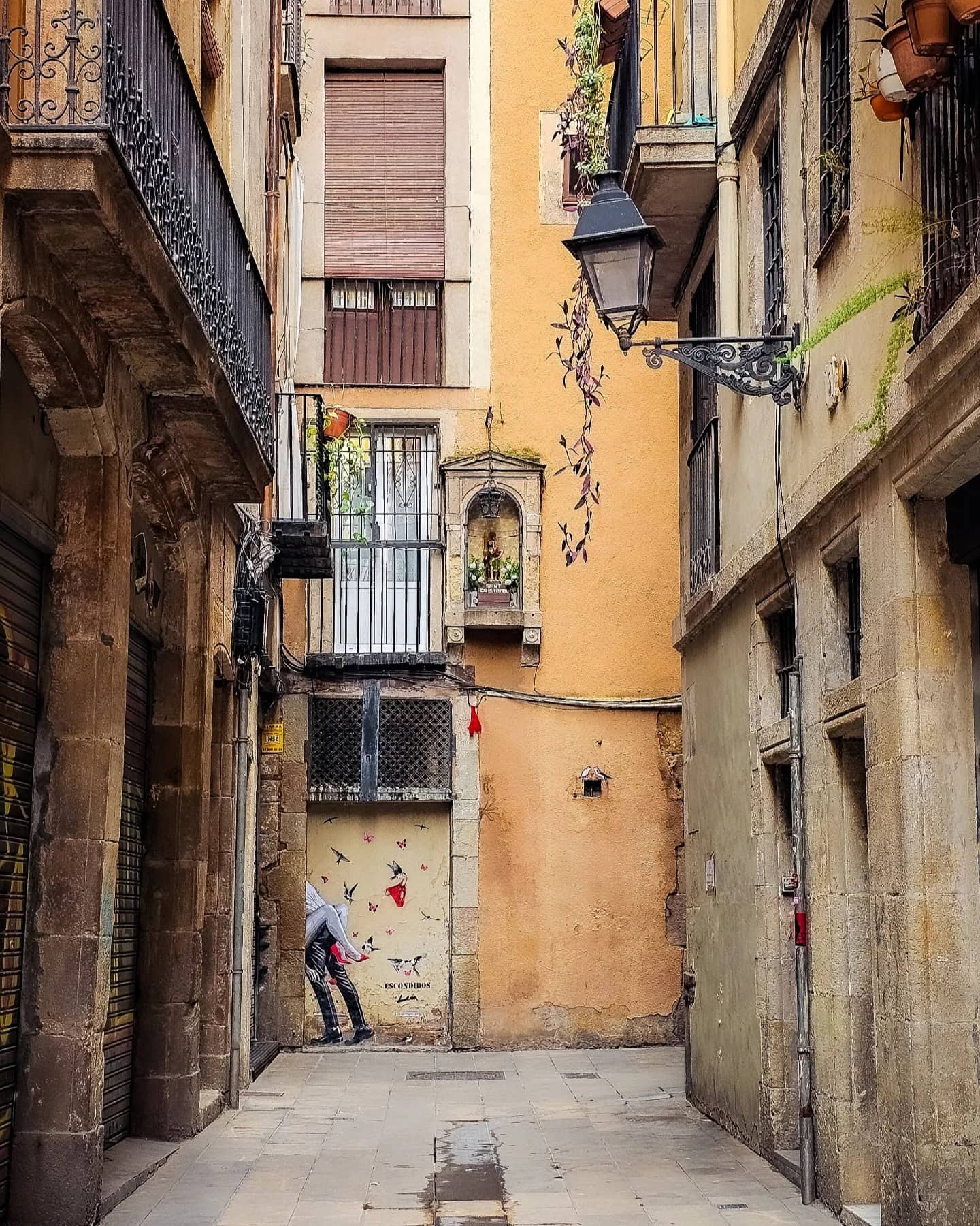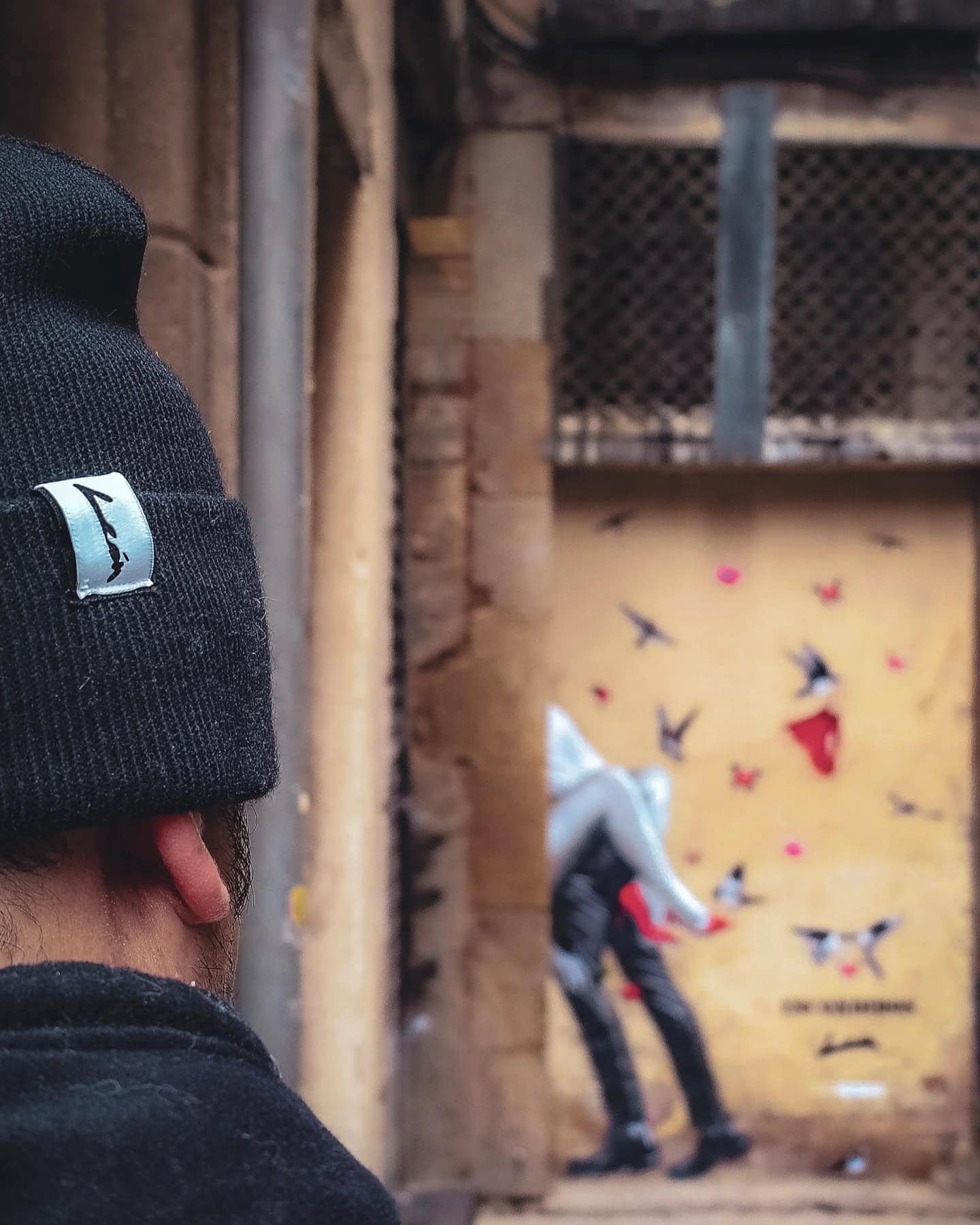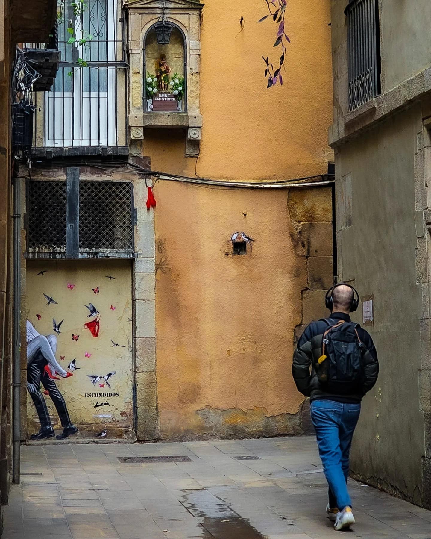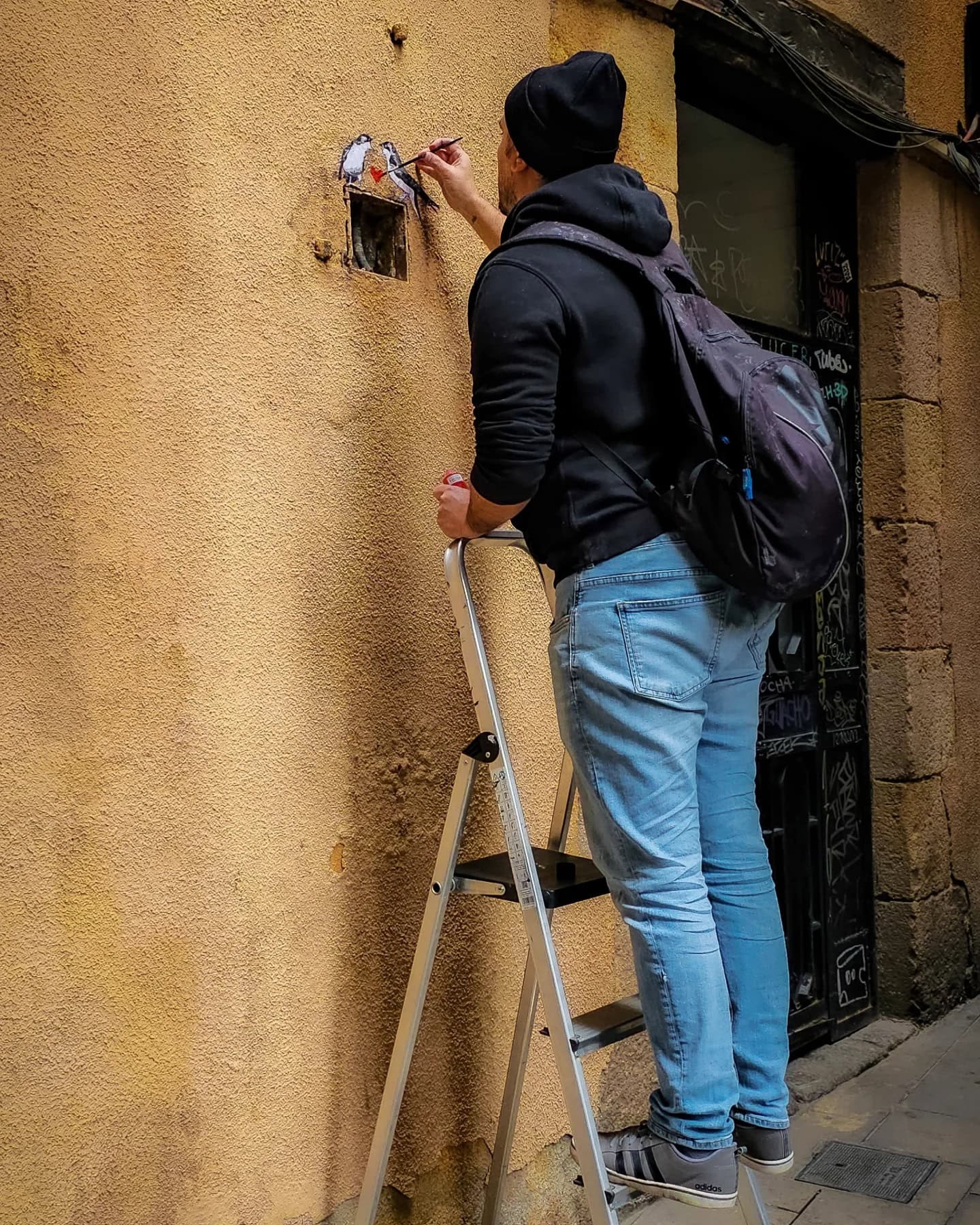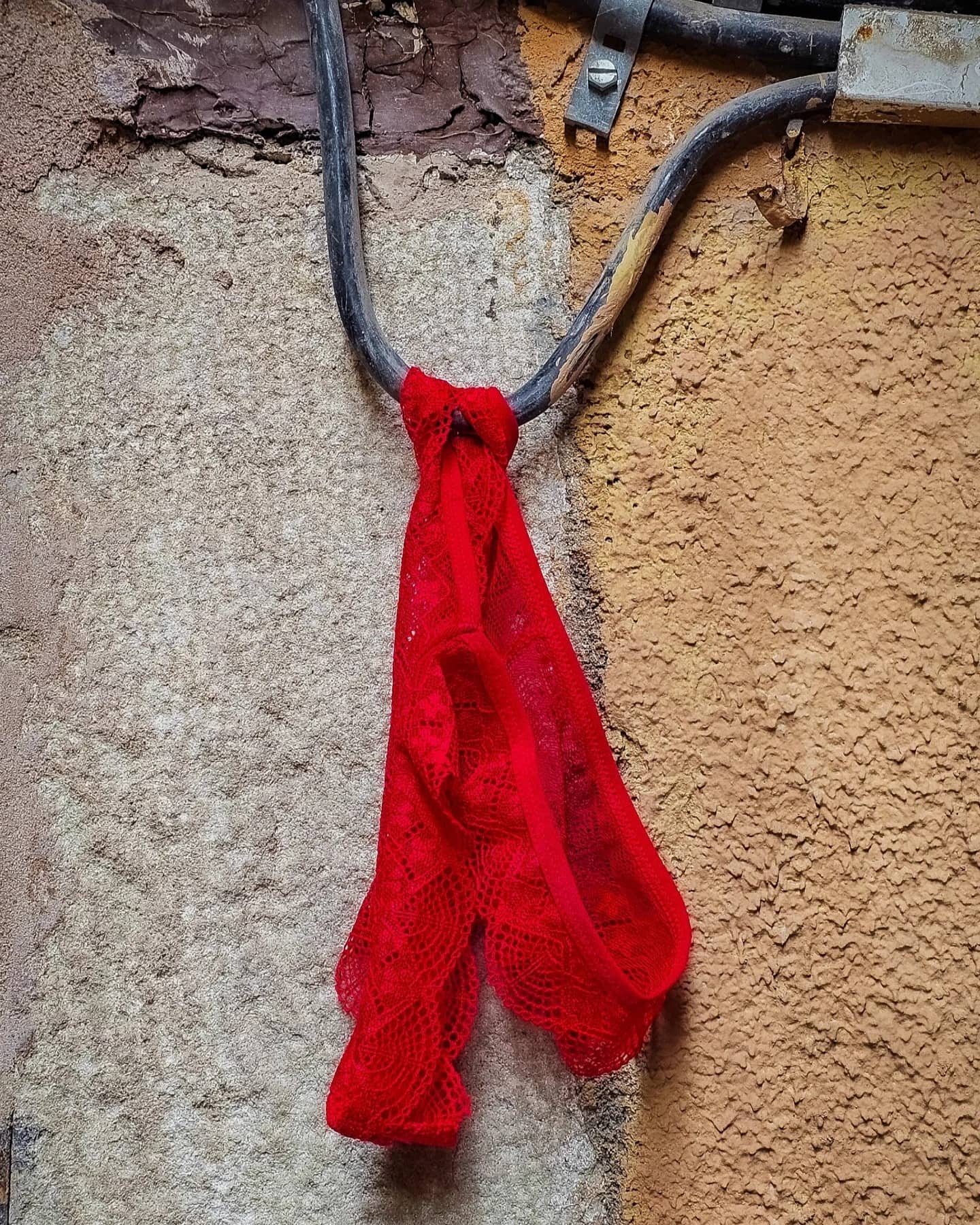 En Escondidos, Alberto León recurre a la sugerencia para construir una escena cargada de erotismo y simbolismo sin mostrar nada de forma explícita. Se ven las piernas abiertas de una mujer con tacones rojos y un hombre entre ellas, insinuando un acto sexual. No hay cuerpos completos, solo fragmentos, gestos y símbolos que invitan a la imaginación. Un tanga flota en el aire, sostenido por un pájaro, mientras varias golondrinas vuelan entre mariposas rojas que parecen surgir de la intensidad del momento.