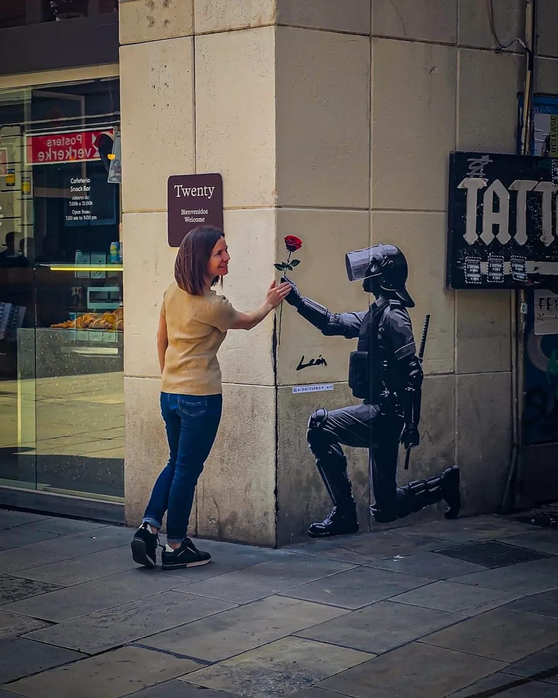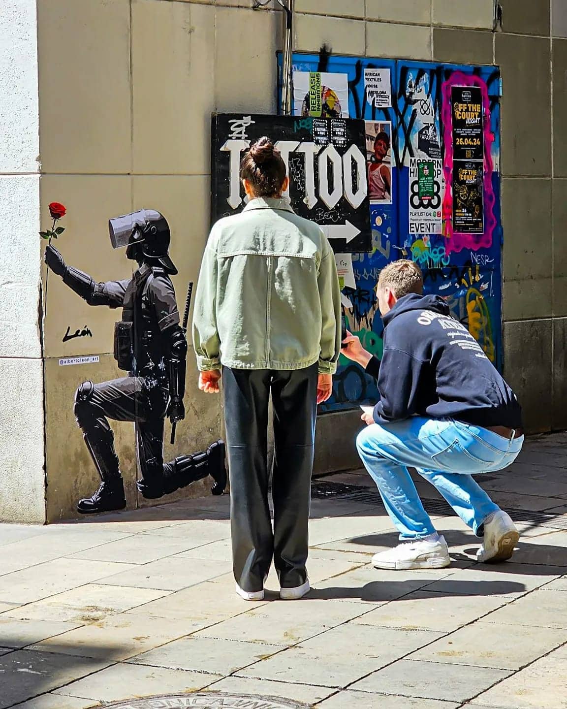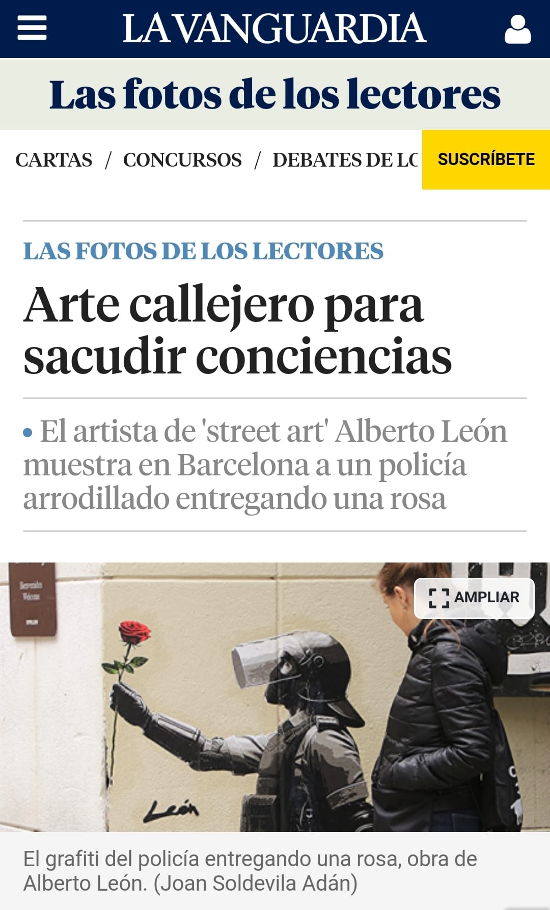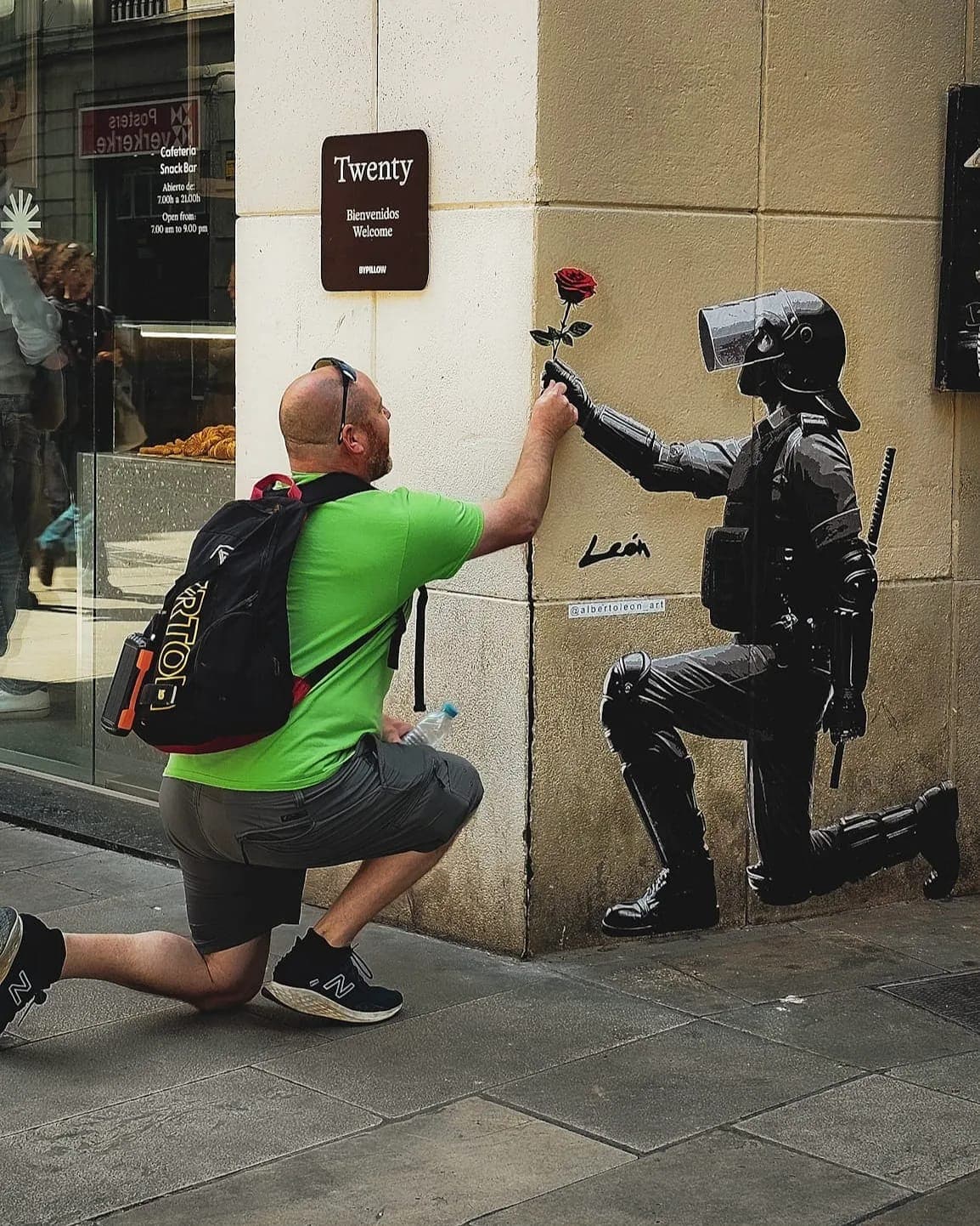 En esta obra, Alberto León presenta a un antidisturbios arrodillado en una esquina, sosteniendo una rosa como ofrenda. La escena, pensada para que el público pueda interactuar con la flor de forma romántica o afectiva, subraya un gesto de humanidad inesperado en una figura asociada habitualmente al conflicto y a la represión, especialmente en el contexto de los altercados del procés.