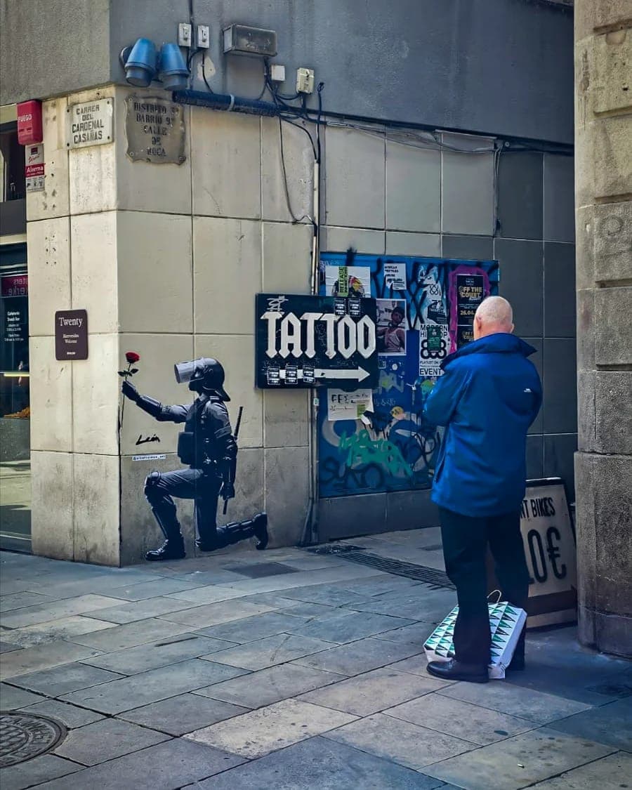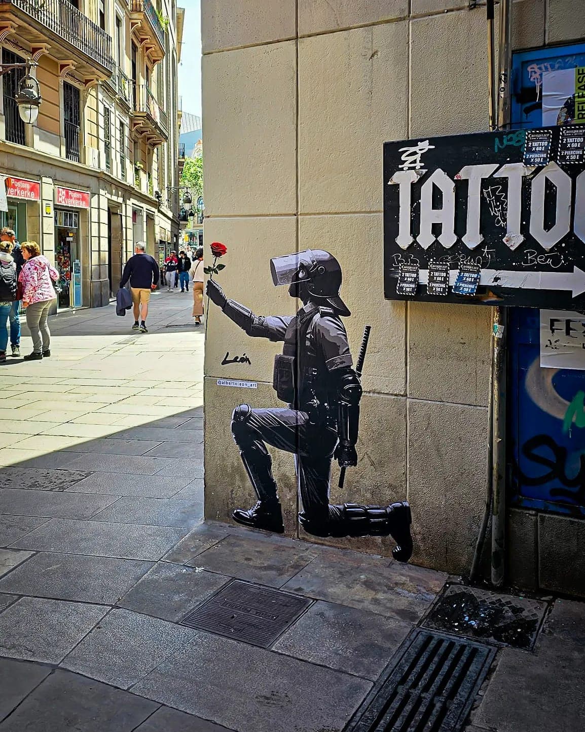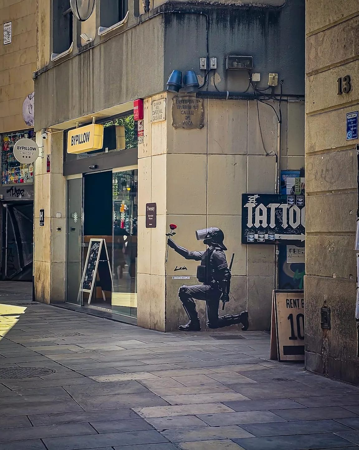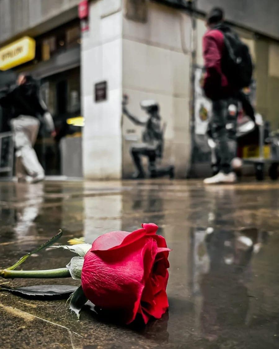 En esta obra, Alberto León presenta a un antidisturbios arrodillado en una esquina, sosteniendo una rosa como ofrenda. La escena, pensada para que el público pueda interactuar con la flor de forma romántica o afectiva, subraya un gesto de humanidad inesperado en una figura asociada habitualmente al conflicto y a la represión, especialmente en el contexto de los altercados del procés.