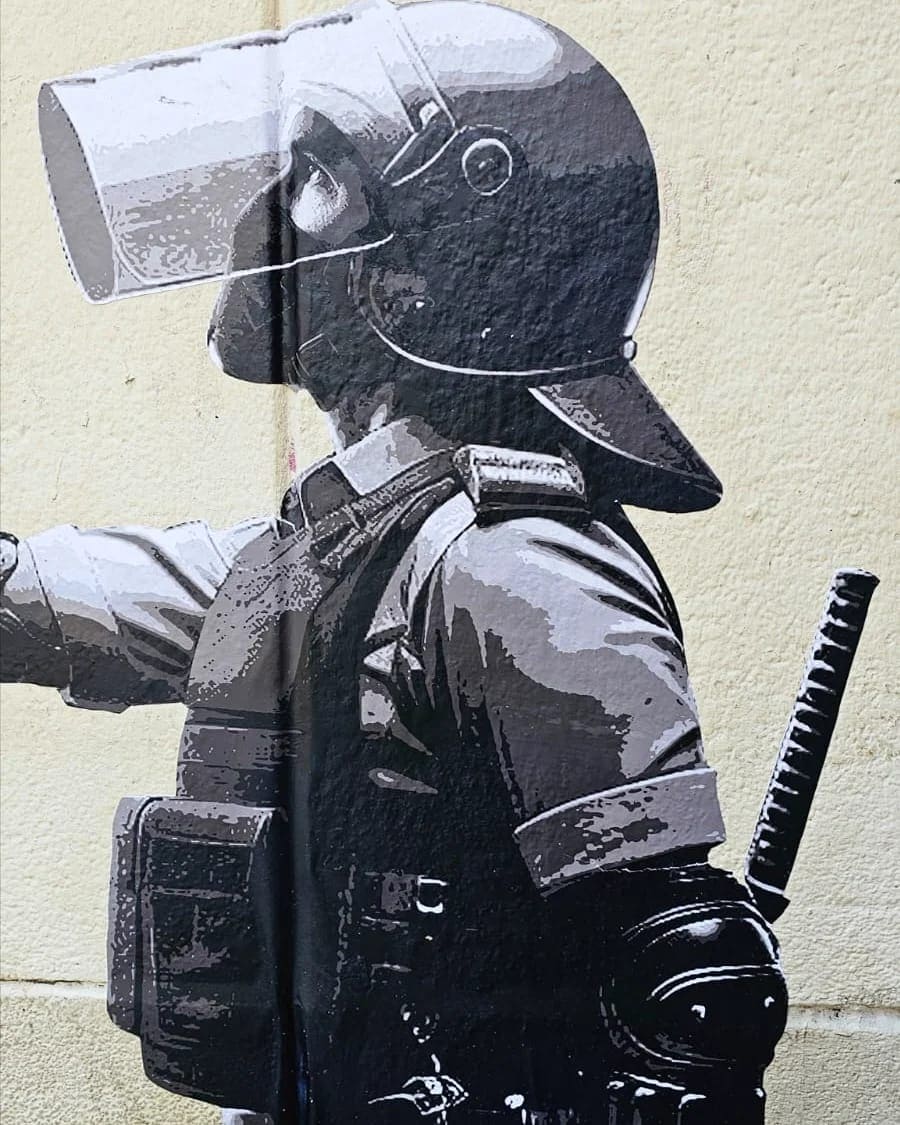 Lejos de la tensión y la violencia con que suelen representarse estos cuerpos policiales, aquí el agente aparece vulnerable, casi poético. León desactiva el símbolo del poder mediante un simple detalle: una flor. Sin exageraciones ni cinismo, la obra invita a mirar más allá del uniforme, sin borrar lo que representa, pero abriendo espacio para una lectura más compleja y empática.