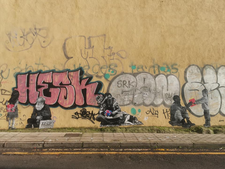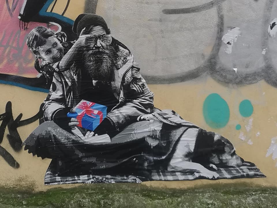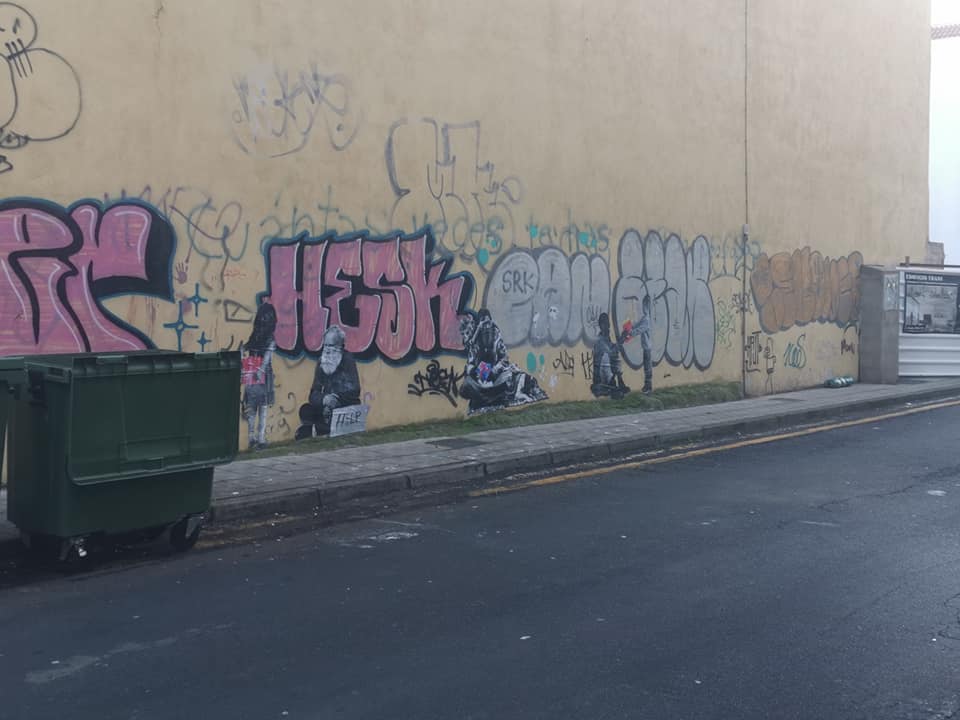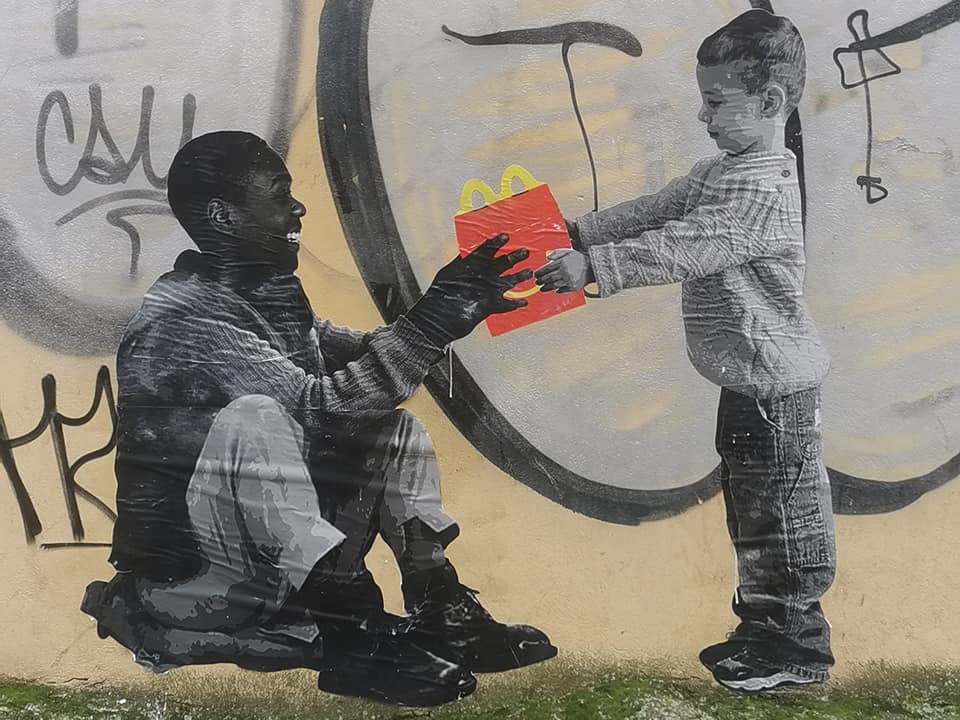 El contraste es poderoso: en lugar de que los Reyes Magos den regalos, aquí los reciben de los niños. El regalo en colores vivos simboliza esperanza y humanidad en medio de la marginalidad.