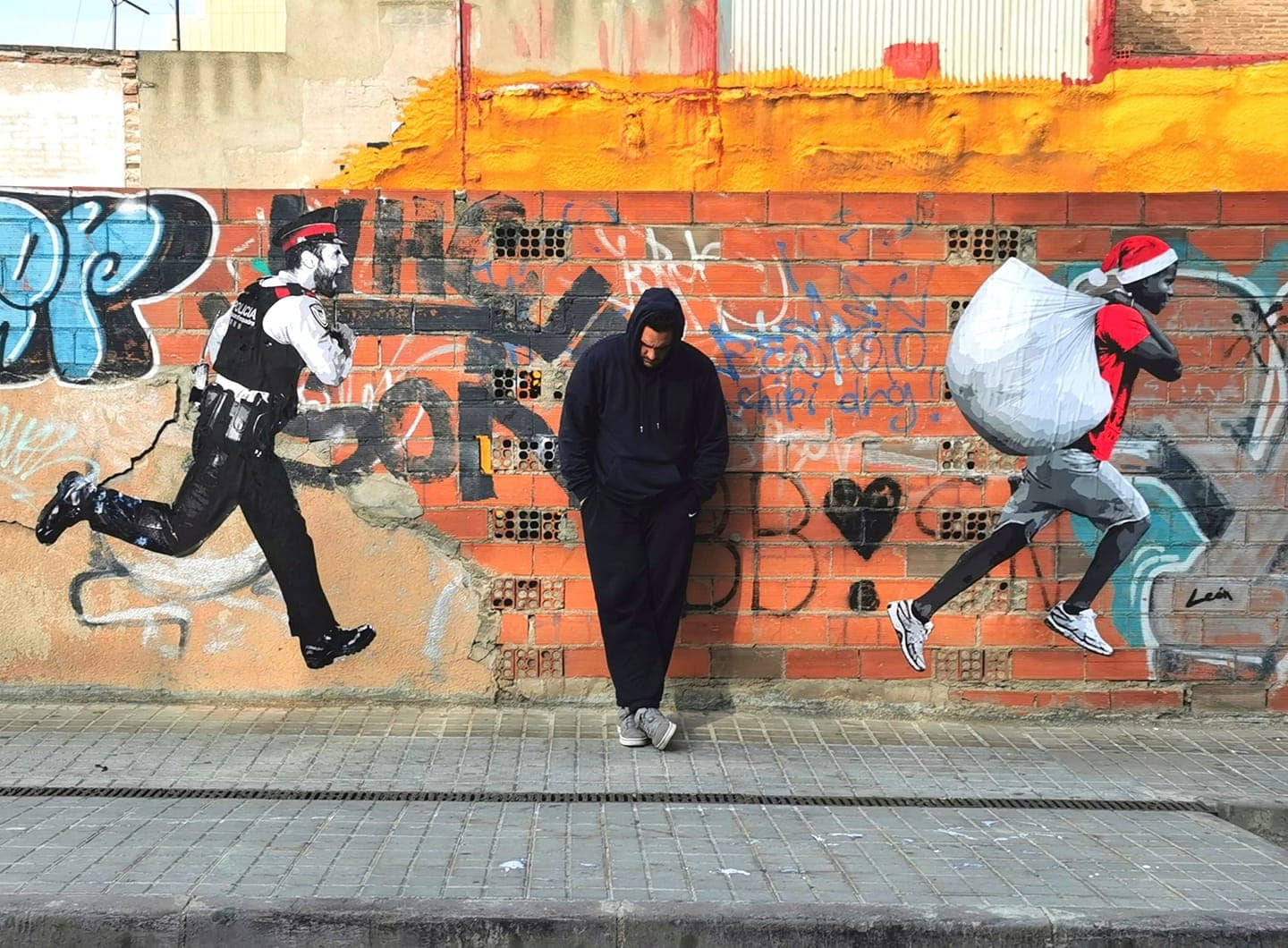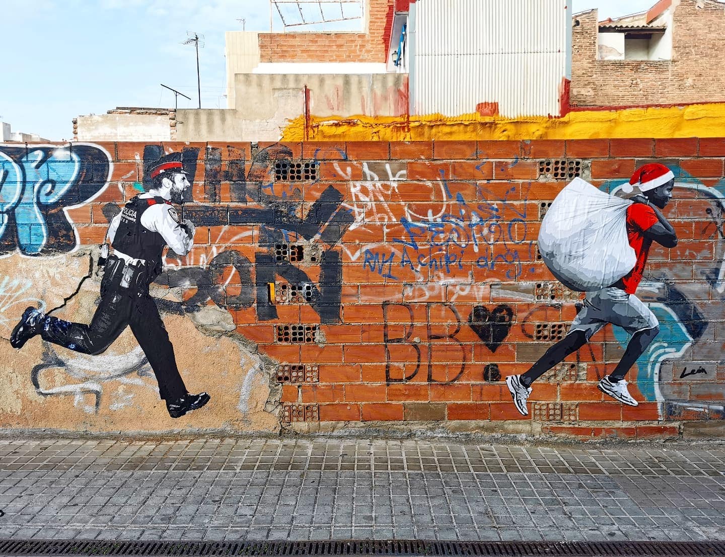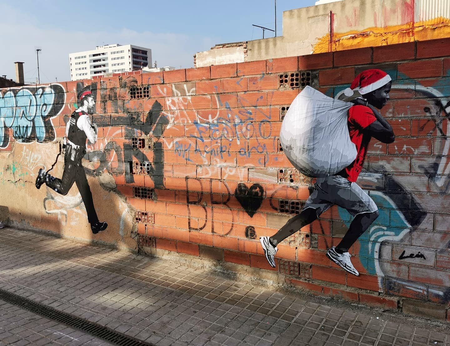 El mural de Alberto León, creado en 2019, ofrece una crítica sutil pero potente al contraste entre el ideal navideño y la realidad social. En la escena, un mosso d’esquadra corre tras un mantero africano que huye con su manta doblada al hombro —no roja, pero claramente evocadora del saco de Santa Claus— mientras viste de rojo y lleva un gorro navideño. El hombre corre con zapatillas, cargando su mercancía como si fueran regalos, pero en un contexto de persecución y precariedad.