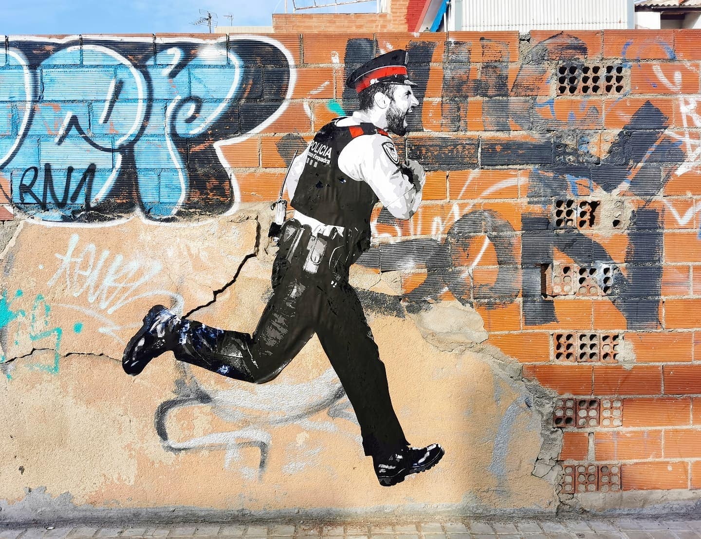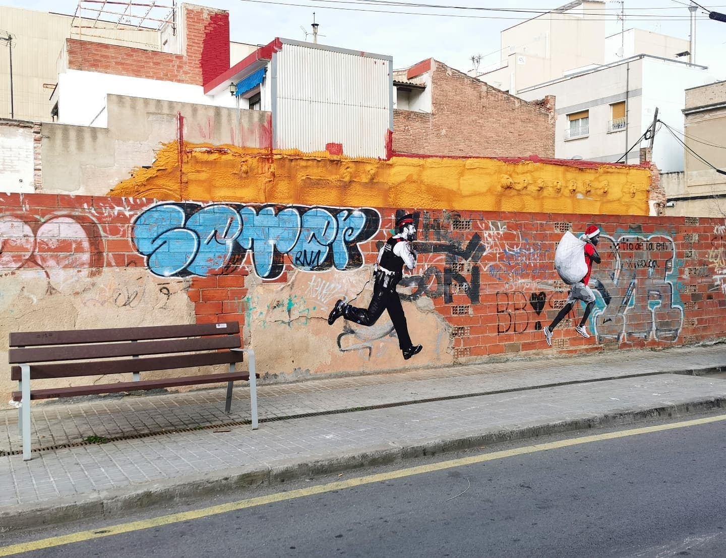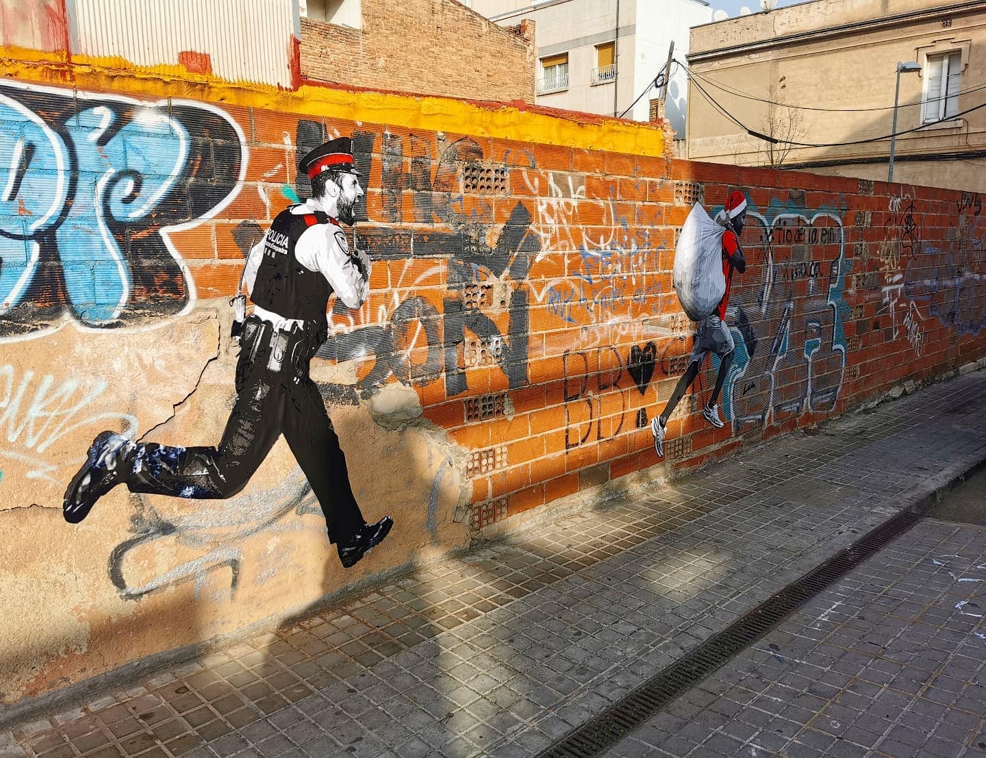 El mural de Alberto León, creado en 2019, ofrece una crítica sutil pero potente al contraste entre el ideal navideño y la realidad social. En la escena, un mosso d’esquadra corre tras un mantero africano que huye con su manta doblada al hombro —no roja, pero claramente evocadora del saco de Santa Claus— mientras viste de rojo y lleva un gorro navideño. El hombre corre con zapatillas, cargando su mercancía como si fueran regalos, pero en un contexto de persecución y precariedad.